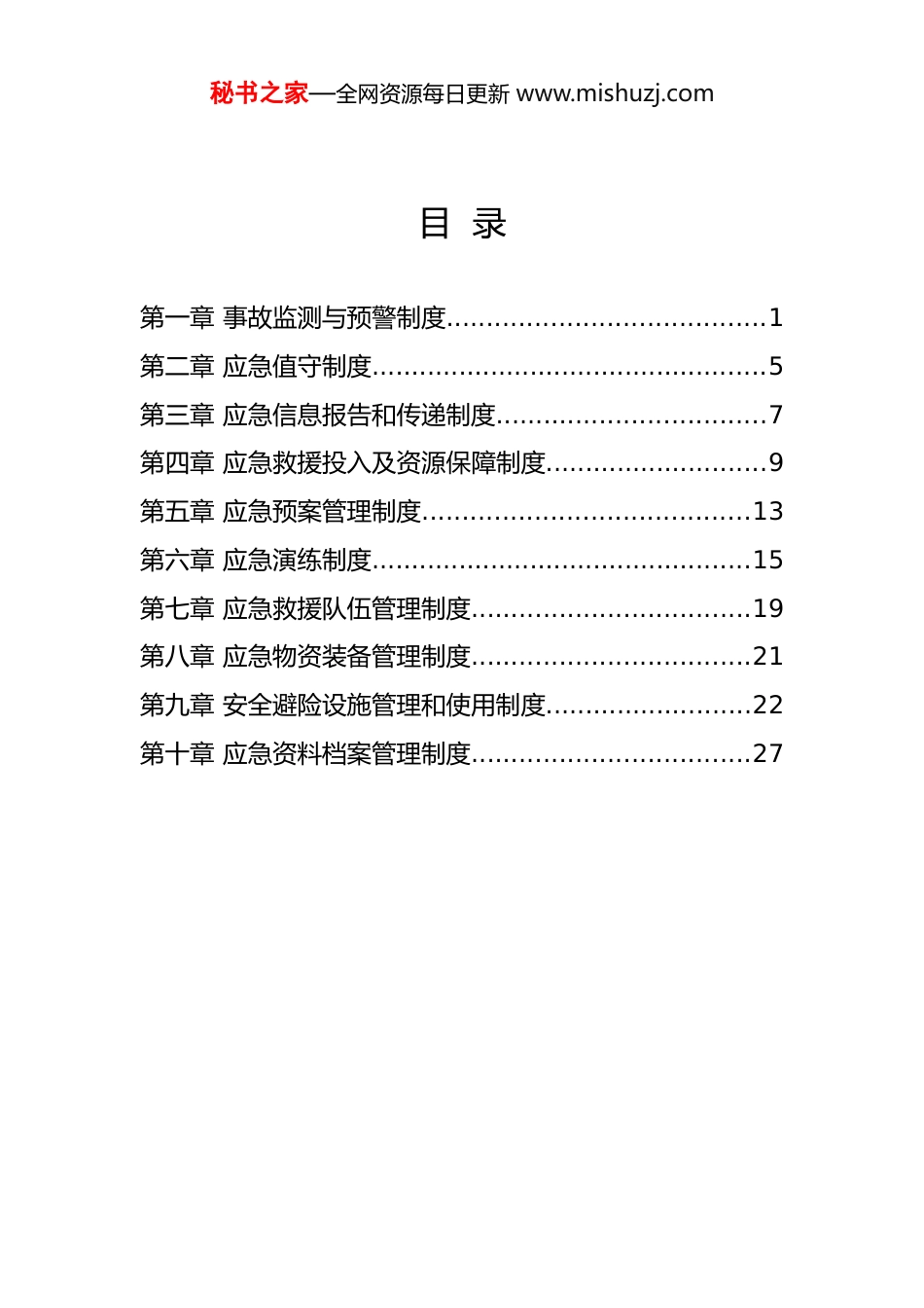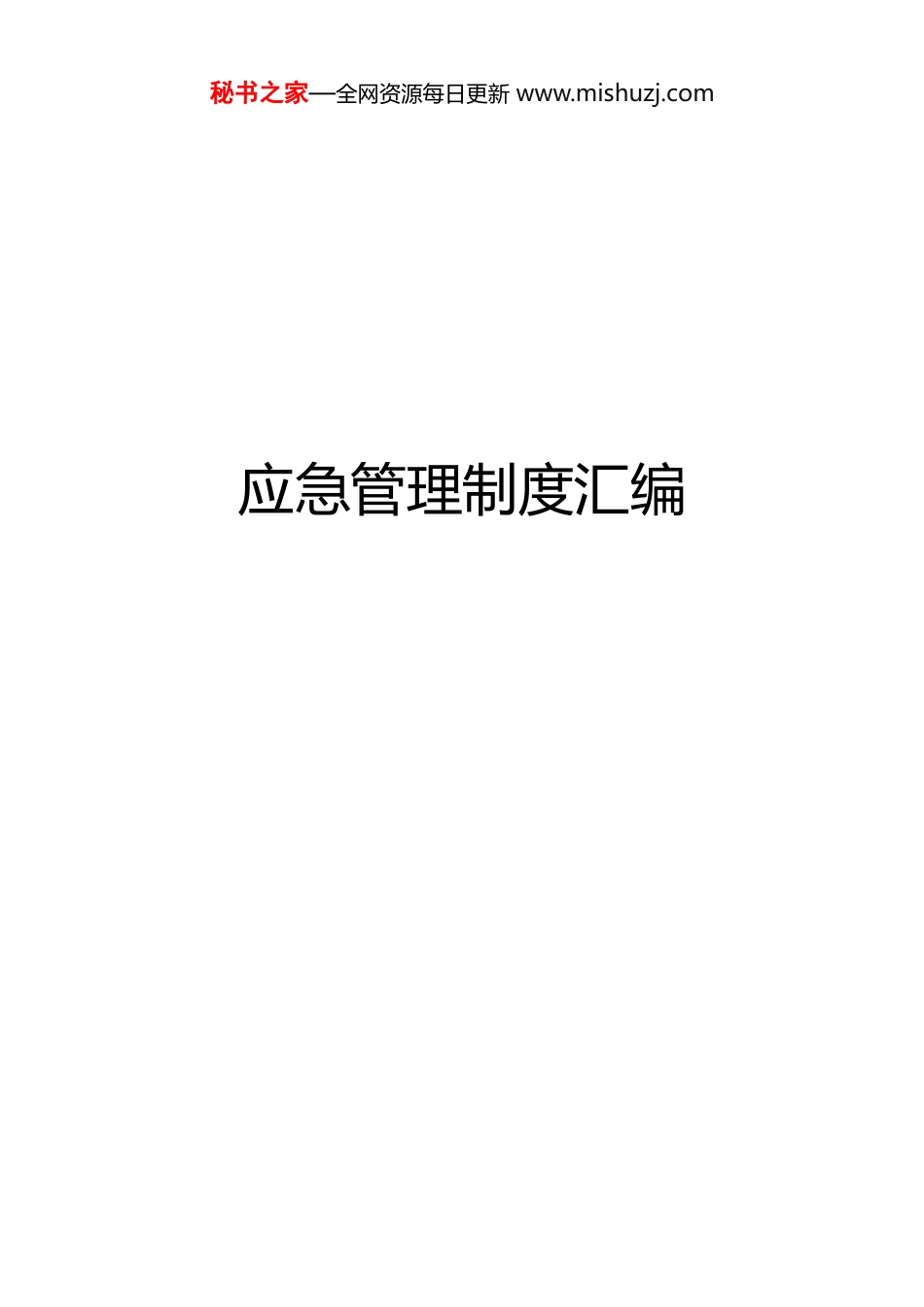 秘书之家—全网资源每日更新 www.mishuzj.com应急管理制度汇编秘书之家—全网资源每日更新 www.mishuzj.com目 录 第一章 事故监测与预警制度........................................1 第二章 应急值守制度..................................................5 第三章 应急信息报告和传递制度..................................7第四章 应急救援投入及资源保障制度............................9 第五章 应急预案管理制度.........................................13 第六章 应急演练制度................................................15第七章 应急救援队伍管理制度...................................19 第八章 应急物资装备管理制度...................................21 第九章 安全避险设施管理和使用制度..........................22 第十章 应急资料档案管理制度...................................27第 1 页 共 25 页秘书之家—全网资源每日更新 www.mishuzj.com第一章 事故监测与预警制度第一条 为有效地辨识和提取隐患信息,灵敏、准确地告示危险前兆、提前进行预测预警、采取有关措施,以便超前反馈、及时布置、防风险于未然,最大限度地降低事故发生,特制定本制度。第二条 事故监测及预警的特点:(一) 快速性。即建立的预警系统能够灵敏快速地进行信息搜集、传递、处理、识别和发布,这一系统的任何一个环节都必须建立在“快速”的基础上,失去了快速性,事故预警就失去了意义。(二) 准确性。生产过程中的信息复杂多变,事故预警不仅要求快速搜集和处理信息,更重要的是要对复杂多变的信息做出准确的判断。判断是否正确,关系到整个预警的成败。要在短时间内对复杂的信息做出正确判断,必须事先针对各种事故制定出科学、实用的信息判断标准和确认程序,并严格按照制定的标准和程序进行判断,避免信息判断及其过程的随意性。(三) 完备性。第 2 页 共 25 页秘书之家—全网资源每日更新 www.mishuzj.com预警系统应能全面收集与事故相关的各类信息,据此从不同角度、不同层面全过程地分析事故的发展态势。 (四) 连贯性。要想使预警分析不致因孤立、片面而得出错误的结论,每一次的分析应以上次的分析为基础,紧密衔接,才能确保预警分析的连贯和准确。第三条 建立事故监测及预警的原则和要求构建事故监测及预警需要遵循及时、全面、高效的原则。 (一) 及时性原则 实行事故监测及预警的出发点是“居安思危”,即事故还在孕育和萌芽的时期,就能够通过细致的观察和研究,防微杜渐,提早做好各种防范的准备。预警系统只有及时地监测出异常情况,并将它及时地报告,才能及时采取有效措施,最大限度减少经济损失和人员伤亡。 (二) 全面性原则预警就是要对生产活动的各个领域进行全面监测,及时发现异常情况,尽最大努力保证人身、财产的安全,这是建立预警机制的宗旨。全面性原则主要体现在监测、识别、判断、评价和对策预警操作系统方面。 (三) 高效性原则 第 3 页 共 25 页秘书之家—全网资源每日更新 www.mishuzj.com鉴于事故的不确定性和突发性,预警机制必须以高效率为重要原则。惟有如此,才能对各种事故进行及时预告,并制订合理适当的应急救援措施。 第四条 预警系统的功能此系统通过采集监测对象(如温度、风速、瓦斯、一氧化碳等)传感器的输出信号,将信号通过传输设施送入计算机进行处理,处理结果经由输出接口输出或通过人机接口输出到操作控制台的显示器、LED 显示器、监控系统大屏幕、记录仪、打印机等外围设备上。监测系统主要完成实时信息采集,并将采集信息存入计算机,供预警信息系统分析使用。监测是预警活动的前提,监测的任务包括两个方面:一是对安全生产中的薄弱环节和重要环节进行全方位、全过程的监测;二是对大量的监测信息进行处理(整理、分类、存储、传输),建立信息档案,进行比较。第五条 监测与预警机构为了保证事故监测预警机制高效运转,促进安全管理的预控工作,特成立事故监测预警机构,增加预警管理职能。组 长:矿长副组长:生产副矿长 安全副矿长 机电副...