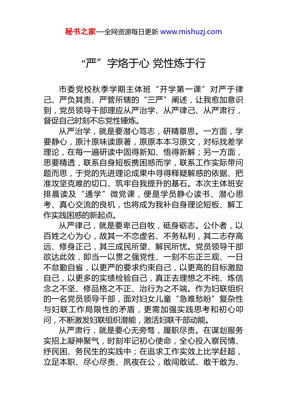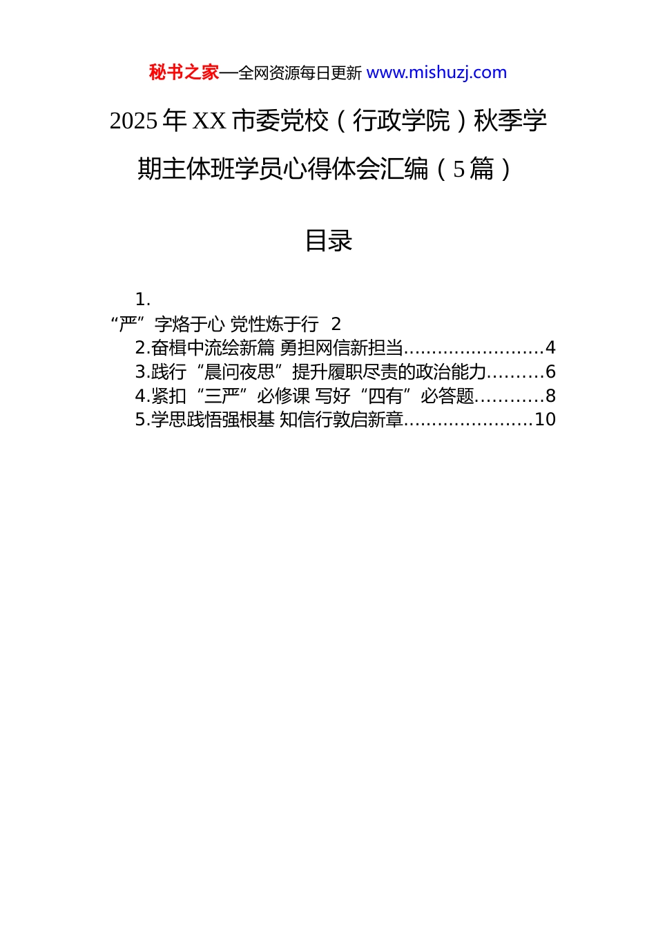 秘书之家—全网资源每日更新 www.mishuzj.com2025 年 XX 市委党校(行政学院)秋季学期主体班学员心得体会汇编(5 篇)目录1.“严”字烙于心 党性炼于行 22.奋楫中流绘新篇 勇担网信新担当.........................43.践行“晨问夜思”提升履职尽责的政治能力..........64.紧扣“三严”必修课 写好“四有”必答题............85.学思践悟强根基 知信行敦启新章.......................10秘书之家—全网资源每日更新 www.mishuzj.com“严”字烙于心 党性炼于行市委党校秋季学期主体班“开学第一课”对严于律己、严负其责、严管所辖的“三严”阐述,让我愈加意识到,党员领导干部理应从严治学、从严律己、从严肃行,督促自己时刻不忘党性锤炼。从严治学,就是要潜心笃志,研精覃思。一方面,学要静心,原汁原味读原著,原原本本习原文,对标找差学理论,在每一遍研读中固得新知、悟得新解;另一方面,思要精透,联系自身短板携困惑而学,联系工作实际带问题而思,于党的先进理论成果中寻得释疑解惑的依据、把准攻坚克难的切口、筑牢自我提升的基石。本次主体班安排晨读及“通学”微党课,便是学员静心读书、潜心思考、真心交流的良机,也将成为我补自身理论短板、解工作实践困惑的新起点。从严律己,就是要卑己自牧,砥身砺志。公仆者,以百姓之心为心,故其一不恋虚名、不务私利,其二志存高远、修身正己,其三成民所望、解民所忧。党员领导干部欲达此效,即当一以贯之强党性、一刻不忘正三观、一日不怠勤自省,以更严的要求约束自己,以更高的目标激励自己,以更多的实绩检验自己,真正去理想之不纯、炼信念之不坚、修品格之不正、治行为之不端。作为妇联组织的一名党员领导干部,面对妇女儿童“急难愁盼”复杂性与妇联工作局限性的矛盾,更需加强实践思考和初心叩问,不断激发妇联组织潜能,激活妇联干部动能。从严肃行,就是要心无旁骛,履职尽责。在谋划服务实招上凝神聚气,时刻牢记初心使命,全心投入察民情、纾民困、务民生的实践中;在追求工作实效上比学赶超,立足本职、尽心尽责、夙夜在公,敢闯敢试、敢干敢为、秘书之家—全网资源每日更新 www.mishuzj.com善作善成,以实干为德、以竞进为美、以实绩为先;在实现守正创新上全力以赴,于我而言,作为一名妇女群众工作者,特别要思考新形势下,如何依法依规服务好广大妇女儿童和家庭,探索创新更有效的妇女群众工作机制、手段、载体和方法,切实让妇女儿童有更强烈的获得感、安全感、幸福感。秘书之家—全网资源每日更新 www.mishuzj.com奋楫中流绘新篇 勇担网信新担当市委党校秋季学期主体班“开学第一课”,使我深受鼓舞,更添澎湃动力。我深感唯有重任在肩、担当实干,才能行稳致远、砥砺前行。以“初心”为本,拧紧思想“总开关”。网信人身处互联网最前沿,时刻面临负面杂音滋扰,唯有筑牢信仰,把站位当战位,补足精神之“钙”,理直气壮捍卫“两个确立”,做到“两个维护”。要坚持不懈用习近平新时代中国特色社会主义思想武装头脑,学思践悟,知行合一。严格对照作风建设要求,祛行为之垢,挺直腰板做忠诚干净网信人。以“使命”为要,勤勉做好“实干家”。坚持“正能量是总要求”,善用网言网语,讲述南通好故事、传播南通正能量、塑造南通好形象,使网上舆论入耳贴心、振奋人心、直抵内心,营造南通山清水秀网络生态。坚持“管得住是硬道理”,用心用情用力把准“舆情脉”,突出团结转化,凝聚网上共识;强化源头治理,清朗网络空间;针锋相对斗争,筑牢网络安全屏障。坚持“用得好是真本事”,深化信息化便民惠民服务,推进数字文化产业发展,切实增强人民群众获得感、幸福感、安全感。以“奋斗”为基,践行履责“示范者”。网信人要比“为官避事平生耻”的强烈担当,更要比“想干愿为”的境界,敢于亮剑冲锋,关键时候站得出、顶得住、冲得上、打得赢。面对快速更迭、纷繁复杂的网络环境,要比“倾心竭力无悔言”的工作态度,打铁自身硬,以舍我其谁的韧劲不断提升技术管网治网能力。坚持“以人民为中心”的发展思想,比“民之所向、我之所往”的政治成色,践行网上群众路线,当好党委政府智...
