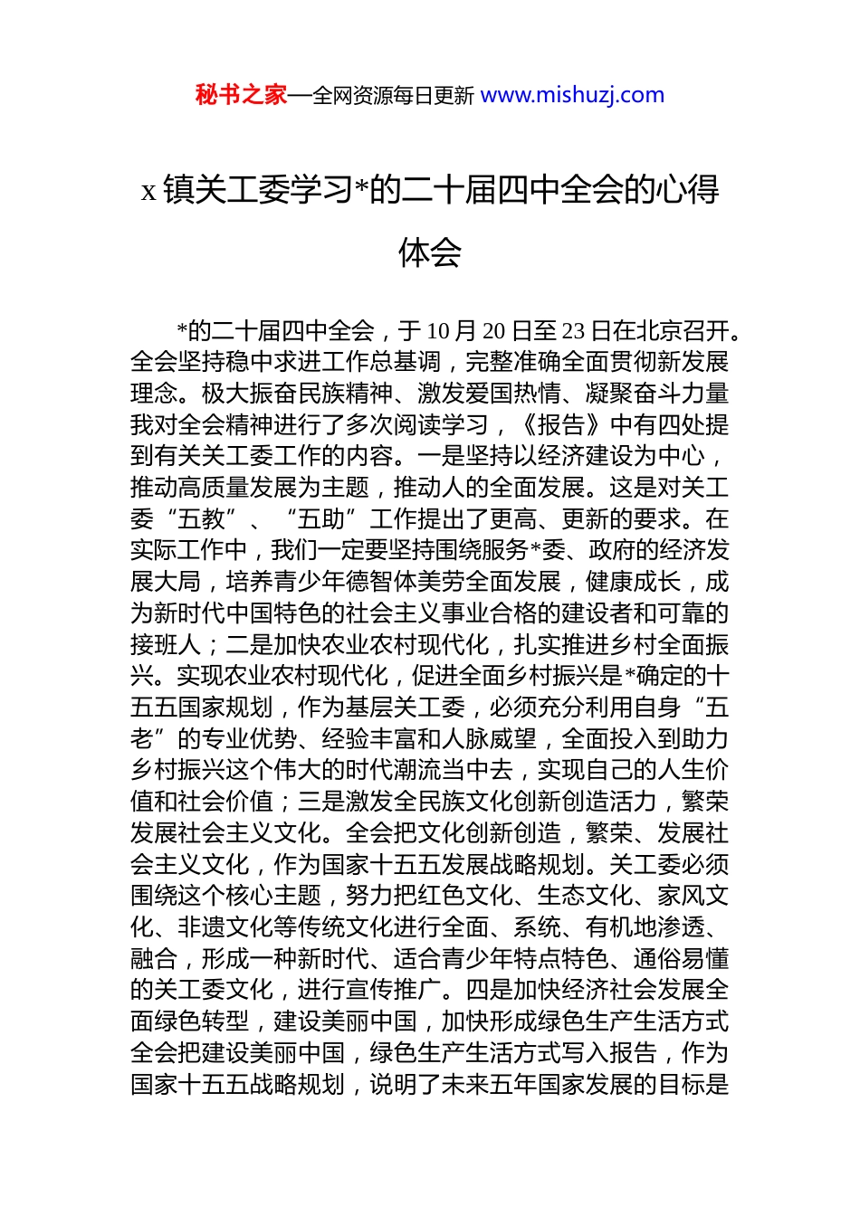 秘书之家—全网资源每日更新 www.mishuzj.comx 镇关工委学习*的二十届四中全会的心得体会*的二十届四中全会,于 10 月 20 日至 23 日在北京召开。全会坚持稳中求进工作总基调,完整准确全面贯彻新发展理念。极大振奋民族精神、激发爱国热情、凝聚奋斗力量我对全会精神进行了多次阅读学习,《报告》中有四处提到有关关工委工作的内容。一是坚持以经济建设为中心,推动高质量发展为主题,推动人的全面发展。这是对关工委“五教”、“五助”工作提出了更高、更新的要求。在实际工作中,我们一定要坚持围绕服务*委、政府的经济发展大局,培养青少年德智体美劳全面发展,健康成长,成为新时代中国特色的社会主义事业合格的建设者和可靠的接班人;二是加快农业农村现代化,扎实推进乡村全面振兴。实现农业农村现代化,促进全面乡村振兴是*确定的十五五国家规划,作为基层关工委,必须充分利用自身“五老”的专业优势、经验丰富和人脉威望,全面投入到助力乡村振兴这个伟大的时代潮流当中去,实现自己的人生价值和社会价值;三是激发全民族文化创新创造活力,繁荣发展社会主义文化。全会把文化创新创造,繁荣、发展社会主义文化,作为国家十五五发展战略规划。关工委必须围绕这个核心主题,努力把红色文化、生态文化、家风文化、非遗文化等传统文化进行全面、系统、有机地渗透、融合,形成一种新时代、适合青少年特点特色、通俗易懂的关工委文化,进行宣传推广。四是加快经济社会发展全面绿色转型,建设美丽中国,加快形成绿色生产生活方式全会把建设美丽中国,绿色生产生活方式写入报告,作为国家十五五战略规划,说明了未来五年国家发展的目标是秘书之家—全网资源每日更新 www.mishuzj.com生态自然+美丽中国。这为关工委生态道德教育确定了明确的工作方向和奋斗目标。根据全会精神,作为基层关工委组织,我们在十五五期间,主要要做好以下几个方面的工作。一是做优“讲好家教,传好家风”的家庭教育品牌。做好线下家庭教育和青少年心理健康的宣讲工作,线上公众号的宣传推广和收集、整理、编辑、制作更多的宣传展板,进社区、进校园二是做实“乡村振兴,关工助力”的关工实际内容。在 x 镇“x”的宏伟蓝图下,紧紧围绕“工农并举,产镇融合,农旅齐步,内外兼美”的乡村振兴路线图,积极参与、配合*委、政府的乡村振兴工作;三是做好“生态自然,美丽 x”的健康家园宣传。积极参与 x 镇黑臭水体和路街村庄环境治理,宣传人类与自然界和谐的共生、共荣,提倡节约用水(电纸和能源)、垃圾分类、爱护花草、拒绝浪费等生产方式和生活习惯;四是积极推进 x 镇·青少年素养培育基地建设。基地选址已经完成,下一步是在市、区关工委和 x 镇*委、政府的领导下,积极主动地与安徽省仁众教育基金会联系对接,争取早日挂牌、早日开班,为留守孩子在节假日创造一个温暖的“家”和爱的“课堂”;五是关注“两降一升”问题(结婚率、生育率下降,离婚率上升)和“四小”群体健康成长(小眼镜、小胖墩、小豆芽、小焦虑)我们将深入社区、学校,寻找解决“两升一降”和“四小”的方法路径,向*委、政府报告,便于*委和政府在制定整体发展决策时进行统一规划部署。关心下一代,育好接班人。关工委工作既是*和政府对“五老”人员工作的信任和关怀,也是我们责无旁贷的历史责任和光荣使命。我们应当牢记初心,继续努力,不辱使命,不负众望。