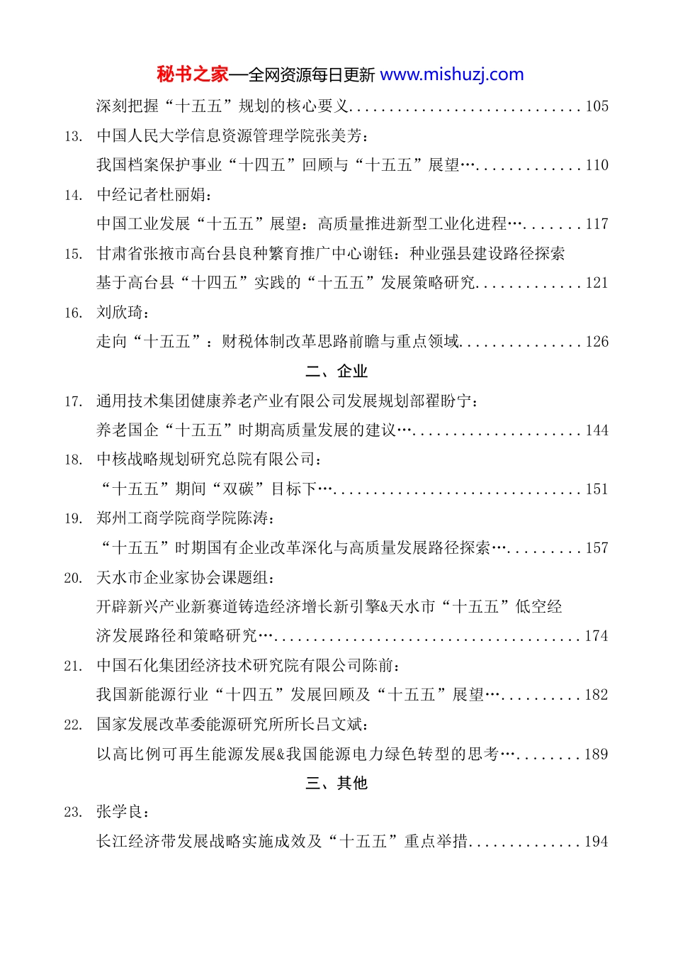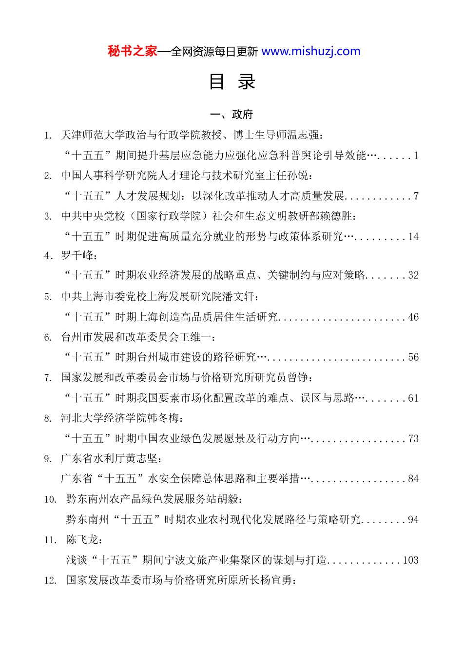 秘书之家—全网资源每日更新 www.mishuzj.com目 录一、政府1. 天津师范大学政治与行政学院教授、博士生导师温志强: “十五五”期间提升基层应急能力应强化应急科普舆论引导效能…......1 2. 中国人事科学研究院人才理论与技术研究室主任孙锐: “十五五”人才发展规划:以深化改革推动人才高质量发展............7 3. 中共中央党校(国家行政学院)社会和生态文明教研部赖德胜: “十五五”时期促进高质量充分就业的形势与政策体系研究….........14 4.罗千峰: “十五五”时期农业经济发展的战略重点、关键制约与应对策略.......32 5. 中共上海市委党校上海发展研究院潘文轩: “十五五”时期上海创造高品质居住生活研究.......................46 6. 台州市发展和改革委员会王维一: “十五五”时期台州城市建设的路径研究….........................56 7. 国家发展和改革委员会市场与价格研究所研究员曾铮: “十五五”时期我国要素市场化配置改革的难点、误区与思路….......61 8. 河北大学经济学院韩冬梅: “十五五”时期中国农业绿色发展愿景及行动方向….................73 9. 广东省水利厅黄志坚: 广东省“十五五”水安全保障总体思路和主要举措….................84 10. 黔东南州农产品绿色发展服务站胡毅: 黔东南州“十五五”时期农业农村现代化发展路径与策略研究........94 11. 陈飞龙: 浅谈“十五五”期间宁波文旅产业集聚区的谋划与打造.............103 12. 国家发展改革委市场与价格研究所原所长杨宜勇: 秘书之家—全网资源每日更新 www.mishuzj.com深刻把握“十五五”规划的核心要义.............................105 13. 中国人民大学信息资源管理学院张美芳: 我国档案保护事业“十四五”回顾与“十五五”展望….............110 14. 中经记者杜丽娟: 中国工业发展“十五五”展望:高质量推进新型工业化进程….......117 15. 甘肃省张掖市高台县良种繁育推广中心谢钰:种业强县建设路径探索 基于高台县“十四五”实践的“十五五”发展策略研究.............121 16. 刘欣琦: 走向“十五五”:财税体制改革思路前瞻与重点领域...............126 二、企业17. 通用技术集团健康养老产业有限公司发展规划部翟盼宁: 养老国企“十五五”时期高质量发展的建议….....................144 18. 中核战略规划研究总院有限公司: “十五五”期间“双碳”目标下…...............................151 19. 郑州工商学院商学院陈涛: “十五五”时期国有企业改革深化与高质量发展路径探索….........157 20. 天水市企业家协会课题组: 开辟新兴产业新赛道铸造经济增长新引擎&天水市“十五五”低空经 济发展路径和策略研究….......................................174 21. 中国石化集团经济技术研究院有限公司陈前: 我国新能源行业“十四五”发展回顾及“十五五”展望…..........182 22. 国家发展改革委能源研究所所长吕文斌: 以高比例可再生能源发展&我国能源电力绿色转型的思考…........189 三、其他23. 张学良: 长江经济带发展战略实施成效及“十五五”重点举措..............194 秘书之家—全网资源每日更新 www.mishuzj.com24. 中国社会科学院学部委员、原副院长、教授高培勇: “‘十五五’时期经济社会发展形势与战略重点”笔谈之一&“十五 五”要在完善分配制度上取得实质性进展…......................210 25. 中国社会科学院学部委员、工业经济研究所原所长,研究员史丹: “‘十五五’时期经济社会发展形势与战略重点”笔谈之二&以新型 能源体系建设为重点推进“十五五”能源高质量发展…............214 26. 中国社会科学院学部委员、农村发展研究所所长,研究员魏后凯: “‘十五五’时期经济社会发展形势与战略重点”笔谈之三&“十五 五”时期我国农村发展的若干问题…............................218 27. 中国财政科学研究院研究员刘尚希: “‘十五五’时期经济社会发展形势与战略重点”笔谈之四&形势的 不确定性与趋势的确定性…..............
