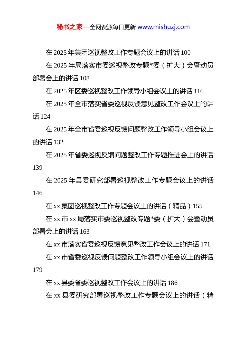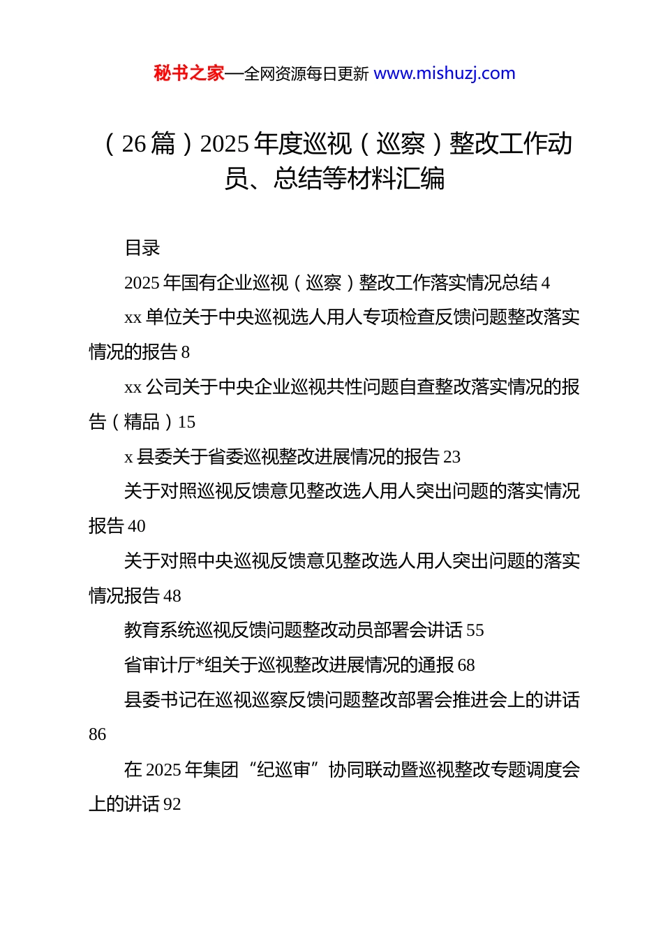 秘书之家—全网资源每日更新 www.mishuzj.com(26 篇)2025 年度巡视(巡察)整改工作动员、总结等材料汇编目录2025 年国有企业巡视(巡察)整改工作落实情况总结 4xx 单位关于中央巡视选人用人专项检查反馈问题整改落实情况的报告 8xx 公司关于中央企业巡视共性问题自查整改落实情况的报告(精品)15x 县委关于省委巡视整改进展情况的报告 23关于对照巡视反馈意见整改选人用人突出问题的落实情况报告 40关于对照中央巡视反馈意见整改选人用人突出问题的落实情况报告 48教育系统巡视反馈问题整改动员部署会讲话 55省审计厅*组关于巡视整改进展情况的通报 68县委书记在巡视巡察反馈问题整改部署会推进会上的讲话86在 2025 年集团“纪巡审”协同联动暨巡视整改专题调度会上的讲话 92秘书之家—全网资源每日更新 www.mishuzj.com在 2025 年集团巡视整改工作专题会议上的讲话 100在 2025 年局落实市委巡视整改专题*委(扩大)会暨动员部署会上的讲话 108在 2025 年区委巡视整改工作领导小组会议上的讲话 116在 2025 年全市落实省委巡视反馈意见整改工作会议上的讲话 124在 2025 年全市省委巡视反馈问题整改工作领导小组会议上的讲话 132在 2025 年省委巡视反馈问题整改工作专题推进会上的讲话139在 2025 年县委研究部署巡视整改工作专题会议上的讲话146在 xx 集团巡视整改工作专题会议上的讲话(精品)155在 xx 市 xx 局落实市委巡视整改专题*委(扩大)会暨动员部署会上的讲话 163在 xx 市落实省委巡视反馈意见整改工作会议上的讲话 171在 xx 市省委巡视反馈问题整改工作领导小组会议上的讲话179在 xx 县委省委巡视整改工作会议上的讲话 186在 xx 县委研究部署巡视整改工作专题会议上的讲话(精秘书之家—全网资源每日更新 www.mishuzj.com品)195在集团巡视整改工作专题会议上的讲话 204在区委巡视整改工作领导小组会议上的讲话 212在全市巡视巡察整改工作推进会议上的讲话 2202025 年国有企业巡视(巡察)整改工作落实情况总结根据中央及省市委关于深化巡视巡察工作的决策部署 ,2025 年 x 月至 x 月,市委第 x 巡察组对 xx 国有企业开展了专项巡察。此次巡察反馈了 x 类 x 项问题,公司*委高度重视,将其作为践行“两个维护”的经验交流,全面推进整改落实。现将整改工作情况总结如下。一、强化组织领导,构建责任体系公司*委迅速成立由*委书记任组长的巡察整改工作领导小组,下设综合协调、政策解读、问题线索处置等专项工作组。抽调各部门业务骨干组成专班,构建起“*委统筹、专班推进、部门联动、全员参与”的责任体系。*委书记切实履行第一责任人职责,多次主持召开专题会议研究整改工作,班子成员严格落实“一岗双责”,深入分管领域督促整改,确保整改工作有序推进。针对巡察反馈的 x 项问题,公司*委制定《巡察整改落实方案》,细化分解为 x 项具体任务,明确责任领导、责任部门和秘书之家—全网资源每日更新 www.mishuzj.com完成时限,形成“问题—责任—任务”闭环链条。同时,建立整改台账,实行销号管理,确保整改工作事事有回音、件件有着落。二、聚焦重点领域,推进整改落实(一)加强*的领导与*的建设严格执行“第一议题”制度,2025 年以来共召开*委会 x 次,系统学习*的二十大精神、二十届三中全会精神及******关于国企改革发展的重要论述。组织专题研讨 x 次,撰写心得体会 x篇,推动*的创新理论入脑入心。修订《“三重一大”决策制度实施办法》,明确*委前置研究重大经营管理事项清单,规范决策程序。2025 年上半年,*委前置研究重大事项 x 项,有效发挥了*组织把方向、管大局、保落实的领导作用。(二)深化全面从严治*组织各部门梳理廉洁风险点 x 个,制定防控措施 x 项。开展“以案说纪”警示教育 x 次,观看警示教育片 x 部,撰写观后感 x 篇,干部员工廉洁意识显著增强。修订《中层领导人员管理办法》,严把干部选拔任用政治关、廉洁关。开展“微腐败”专项整治行动,查处问题 x 起,处理 x 人,形成了有力震慑。(三)推动企业改革与高质量发展秘...
