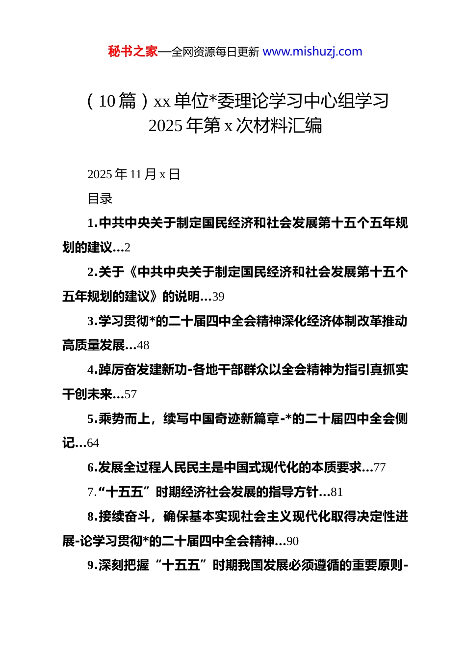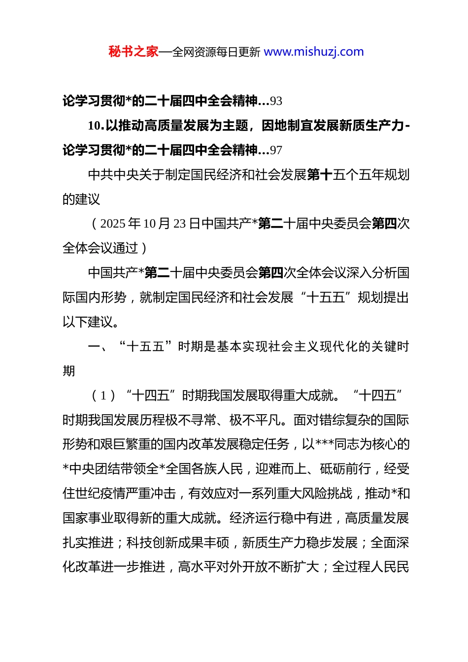 秘书之家—全网资源每日更新 www.mishuzj.com(10 篇)xx 单位*委理论学习中心组学习2025 年第 x 次材料汇编2025 年 11 月 x 日目录1.中共中央关于制定国民经济和社会发展第十五个五年规划的建议…22.关于《中共中央关于制定国民经济和社会发展第十五个五年规划的建议》的说明…393.学习贯彻*的二十届四中全会精神深化经济体制改革推动高质量发展…484.踔厉奋发建新功-各地干部群众以全会精神为指引真抓实干创未来…575.乘势而上,续写中国奇迹新篇章-*的二十届四中全会侧记…646.发展全过程人民民主是中国式现代化的本质要求…777.“十五五”时期经济社会发展的指导方针…818.接续奋斗,确保基本实现社会主义现代化取得决定性进展-论学习贯彻*的二十届四中全会精神…909.深刻把握“十五五”时期我国发展必须遵循的重要原则-秘书之家—全网资源每日更新 www.mishuzj.com论学习贯彻*的二十届四中全会精神…9310.以推动高质量发展为主题,因地制宜发展新质生产力-论学习贯彻*的二十届四中全会精神…97中共中央关于制定国民经济和社会发展第十五个五年规划的建议(2025 年 10 月 23 日中国共产*第二十届中央委员会第四次全体会议通过)中国共产*第二十届中央委员会第四次全体会议深入分析国际国内形势,就制定国民经济和社会发展“十五五”规划提出以下建议。一、“十五五”时期是基本实现社会主义现代化的关键时期(1)“十四五”时期我国发展取得重大成就。“十四五”时期我国发展历程极不寻常、极不平凡。面对错综复杂的国际形势和艰巨繁重的国内改革发展稳定任务,以***同志为核心的*中央团结带领全*全国各族人民,迎难而上、砥砺前行,经受住世纪疫情严重冲击,有效应对一系列重大风险挑战,推动*和国家事业取得新的重大成就。经济运行稳中有进,高质量发展扎实推进;科技创新成果丰硕,新质生产力稳步发展;全面深化改革进一步推进,高水平对外开放不断扩大;全过程人民民秘书之家—全网资源每日更新 www.mishuzj.com主深入发展,全面依法治国有效实施;文化事业和文化产业蓬勃发展,精神文化产品丰富多彩;民生保障扎实稳固,脱贫攻坚成果巩固拓展;绿色低碳转型步伐加快,生态环境质量持续改善;国家安全能力有效提升,社会治理效能增强,社会大局保持稳定;国防和军队建设取得重大进展;“一国两制”实践深入推进;中国特色大国外交全面拓展;全面从严治*成效显著,反腐败斗争纵深推进,*的创造力、凝聚力、战斗力明显提高。我国经济实力、科技实力、综合国力跃上新台阶,中国式现代化迈出新的坚实步伐,第二个百年奋斗目标新征程实现良好开局。这些重大成就的取得,根本在于以***同志为核心的*中央领航掌舵,在于**************思想科学指引。(2)“十五五”时期在基本实现社会主义现代化进程中具有承前启后的重要地位。实现社会主义现代化是一个阶梯式递进、不断发展进步的历史过程,需要不懈努力、接续奋斗。“十五五”时期是基本实现社会主义现代化夯实基础、全面发力的关键时期,要巩固拓展优势、破除瓶颈制约、补强短板弱项,在激烈国际竞争中赢得战略主动,推动事关中国式现代化全局的战略任务取得重大突破,为基本实现社会主义现代化奠定更加坚实的基础。(3)“十五五”时期我国发展环境面临深刻复杂变化。大秘书之家—全网资源每日更新 www.mishuzj.com国关系牵动国际形势,国际形势演变深刻影响国内发展,我国发展处于战略机遇和风险挑战并存、不确定难预料因素增多的时期。从国际看,世界百年变局加速演进,国际力量对比深刻调整,新一轮科技革命和产业变革加速突破,我国具备主动运筹国际空间、塑造外部环境的诸多有利因素。同时,世界变乱交织、动荡加剧,地缘冲突易发多发;单边主义、保护主义抬头,霸权主义和强权政治威胁上升,国际经济贸易秩序遇到严峻挑战,世界经济增长动能不足;大国博弈更加复杂激烈。从国内看,我国经济基础稳、优势多、韧性强、潜能大,长期向好的支撑条件和基本趋势没有变,中国特色社会主义制度优势、超大规模市场优势、完整产业体系优势、丰富人才资源优势更加彰显。同时,发展不平衡不充分问题仍然突出;有...