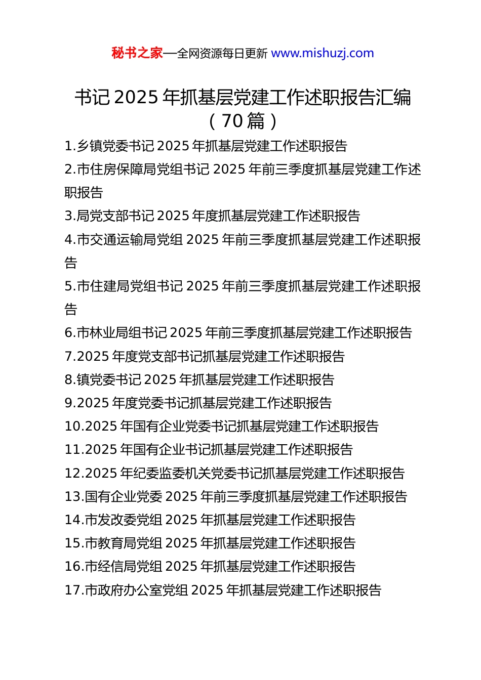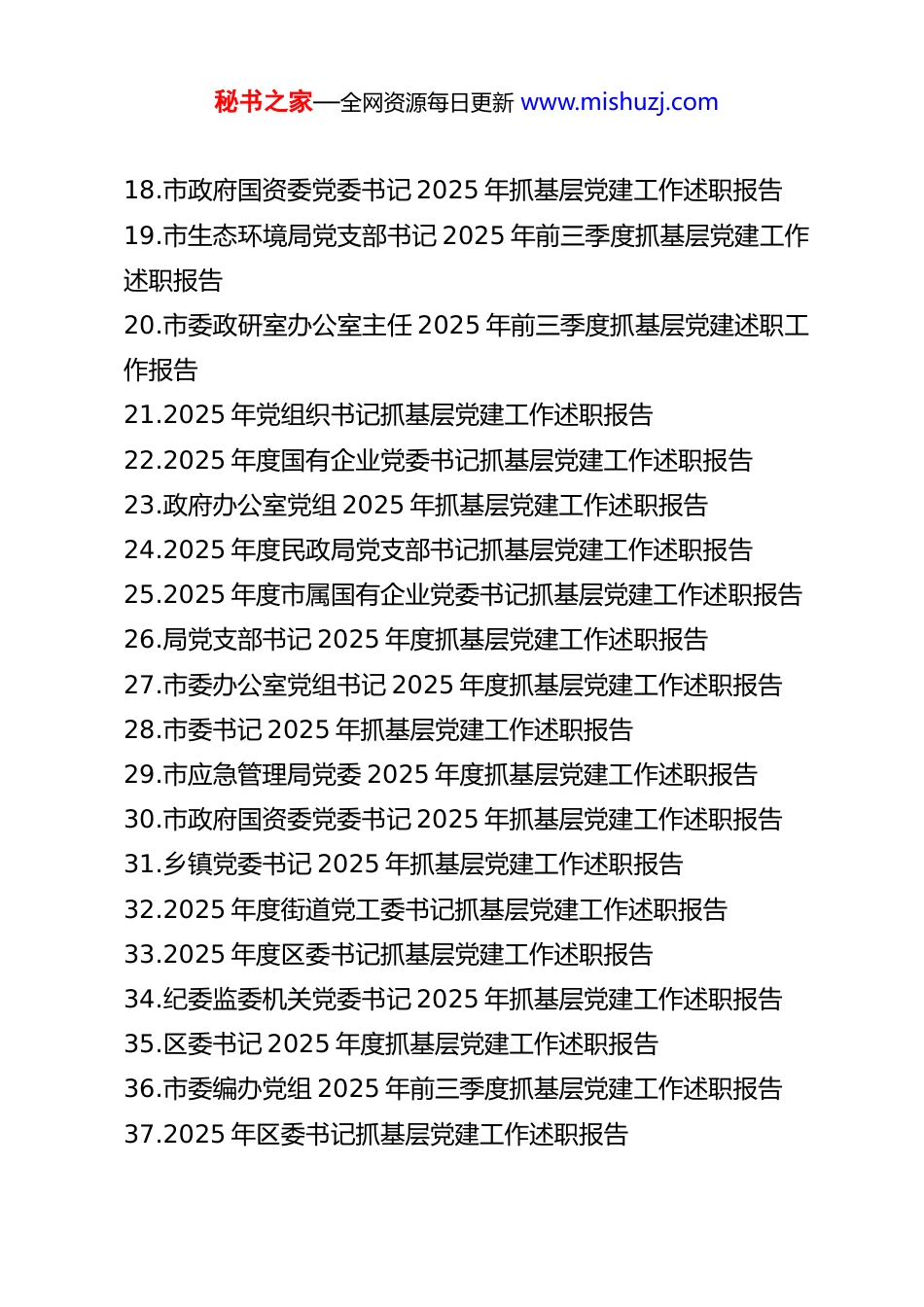 秘书之家—全网资源每日更新 www.mishuzj.com书记 2025 年抓基层党建工作述职报告汇编(70 篇)1.乡镇党委书记 2025 年抓基层党建工作述职报告2.市住房保障局党组书记 2025 年前三季度抓基层党建工作述职报告3.局党支部书记 2025 年度抓基层党建工作述职报告4.市交通运输局党组 2025 年前三季度抓基层党建工作述职报告5.市住建局党组书记 2025 年前三季度抓基层党建工作述职报告6.市林业局组书记 2025 年前三季度抓基层党建工作述职报告7.2025 年度党支部书记抓基层党建工作述职报告8.镇党委书记 2025 年抓基层党建工作述职报告9.2025 年度党委书记抓基层党建工作述职报告10.2025 年国有企业党委书记抓基层党建工作述职报告11.2025 年国有企业书记抓基层党建工作述职报告12.2025 年纪委监委机关党委书记抓基层党建工作述职报告13.国有企业党委 2025 年前三季度抓基层党建工作述职报告14.市发改委党组 2025 年抓基层党建工作述职报告15.市教育局党组 2025 年抓基层党建工作述职报告16.市经信局党组 2025 年抓基层党建工作述职报告17.市政府办公室党组 2025 年抓基层党建工作述职报告秘书之家—全网资源每日更新 www.mishuzj.com18.市政府国资委党委书记 2025 年抓基层党建工作述职报告19.市生态环境局党支部书记 2025 年前三季度抓基层党建工作述职报告20.市委政研室办公室主任 2025 年前三季度抓基层党建述职工作报告21.2025 年党组织书记抓基层党建工作述职报告22.2025 年度国有企业党委书记抓基层党建工作述职报告23.政府办公室党组 2025 年抓基层党建工作述职报告24.2025 年度民政局党支部书记抓基层党建工作述职报告25.2025 年度市属国有企业党委书记抓基层党建工作述职报告26.局党支部书记 2025 年度抓基层党建工作述职报告27.市委办公室党组书记 2025 年度抓基层党建工作述职报告28.市委书记 2025 年抓基层党建工作述职报告29.市应急管理局党委 2025 年度抓基层党建工作述职报告30.市政府国资委党委书记 2025 年抓基层党建工作述职报告31.乡镇党委书记 2025 年抓基层党建工作述职报告32.2025 年度街道党工委书记抓基层党建工作述职报告33.2025 年度区委书记抓基层党建工作述职报告34.纪委监委机关党委书记 2025 年抓基层党建工作述职报告35.区委书记 2025 年度抓基层党建工作述职报告36.市委编办党组 2025 年前三季度抓基层党建工作述职报告37.2025 年区委书记抓基层党建工作述职报告秘书之家—全网资源每日更新 www.mishuzj.com38.国企党支部 2025 年抓基层党建工作述职报告39.市直单位党组书记 2025 年度抓基层党建工作述职报告40.县税务局党支部 2025 年抓基层党建工作述职报告41.2025 年党组织书记抓基层党建工作述职报告42.2025 年国有企业书记抓基层党建工作述职报告43.2025 年纪委监委机关党委书记抓基层党建工作述职报告44.2025 年区委书记抓基层党建工作述职报告45.纪委监委机关党委书记 2025 年抓基层党建工作述职报告46.局党支部书记 2025 年度抓基层党建工作述职报告47.区委书记 2025 年度抓基层党建工作述职报告48.市政府国资委党委书记 2025 年抓基层党建工作述职报告49.市直单位党组书记 2025 年抓基层党建工作述职报告50.烟草局党组书记 2025 年度抓基层党建工作述职报告51.镇党委书记 2025 年抓基层党建工作述职报告 (1)52.市委办公室党组书记 2025 年度抓基层党建工作述职报告53.市委书记 2025 年抓基层党建工作述职报告54.乡镇党委书记 2025 年抓基层党建工作述职报告55.2025 年度市属国有企业党委书记抓基层党建工作述职报告56.市委宣传部党组 2025 年度抓基层党建工作述职报告57.2025 年度市国有企业党委书记抓基层党建工作述职报告58.国有企业党支部 2025 年度抓基层党建工作述职报告59.某乡党委书记 2025 年抓基层党建工作述职报告秘书之家—全网资源每日更新 www.mishuzj.com60.市统计局党总支 2025 年度抓基层党建工作述职报告61.市政府办公室党组 2025 年度抓基层党建工作述职报告62.市直机关工委 2025 年度抓基层党建工作述...