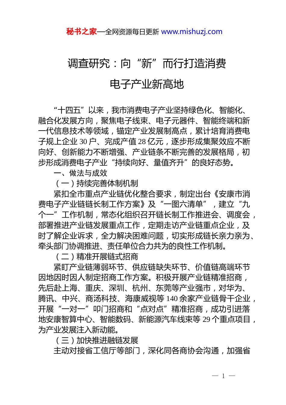 秘书之家—全网资源每日更新 www.mishuzj.com调查研究:向“新”而行打造消费电子产业新高地“十四五”以来,我市消费电子产业坚持绿色化、智能化、融合化发展方向,聚焦电子线束、电子元器件、智能终端和新一代信息技术等领域,锚定产业发展制高点,累计培育消费电子规上企业 30 户、完成产值 28 亿元,逐步形成集聚效应不断向好、创新能力不断增强、产业链条不断完善的发展格局,初步形成消费电子产业“持续向好、量值齐升”的良好态势。一、做法与成效(一)持续完善体制机制紧扣全市重点产业链优化整合要求,制定出台《安康市消费电子产业链链长制工作方案》及“一图六清单”,建立“九个一”工作机制,常态化组织召开链长制工作推进会、调度会,部署推进产业链发展重点工作,定期走访产业链重点企业,及时了解企业诉求,全力解决困难问题,切实形成链长亲力亲为、牵头部门协调推进、责任单位合力共为的良性工作机制。(二)精准开展链式招商紧盯产业链薄弱环节、供应链缺失环节、价值链高端环节因地因时因人制定招商工作方案。积极开展产业链精准招商,先后赴上海、重庆、深圳、杭州、东莞等产业强市,对华为、腾讯、中兴、商汤科技、海康威视等 140 余家产业链骨干企业,开展“一对一”叩门招商和“点对点”精准招商,成功引进落地安康智算中心、智能数码、新能源汽车线束等 29 个重点项目,为产业发展注入新动能。(三)加快推进融链发展主动对接省工信厅等部门,深化同各商协会沟通,加强省— 1 —秘书之家—全网资源每日更新 www.mishuzj.com市间重点产业链协作配套,抢抓常安对口帮扶、西康融合发展和安十协同发展契机,帮助链上企业搭建交流合作平台,推进产业链互补、供应链配套、创新链协同,推动轩意光电与西安中兴通讯建立合作关系,促进泰沃云融入西安美格智能、西安比亚迪配套体系,产业嵌入融链迈向深入。(四)聚力强化科技赋能组建消费电子产业链科技创新团队,聘请 11 位专家从事技术研发和产业指导。组织重点企业前往西安交通大学、西安电子科技大学、陕西科技大学等高校开展技术需求对接和科技项目路演活动,对接技术需求 8 项,签订项目合作协议 4 份,形成科技成果 1 项。截至目前,共培育消费电子高新技术企业 21家、省级“专精特新”中小企业 7 家、瞪羚企业 3 家、市级企业技术中心 5 家。(五)高效落实要素保障推动市直部门入企包联帮扶、全市工信干部上门纾困解难健全督查问效机制,优化链上重点项目全周期服务,力促项目落地投产。全年解决链上企业问题 26 个,推荐入选我省“工信贷”白名单 15 户,为企业争取奖补资金 420 万元,协调邮储银行、建设银行等金融机构开展金融产品专题推介,协助企业融资 5506 万元。二、机遇与挑战(一)产业优势一是产业承载空间充足。建成西北电子信息基地、智能终端产业园、小巨人产业园、数字产业孵化园、汉滨区数字经济园区等专业园区,150 万平方米标准化工业厂房可供企业“拎包入住”。二是区位优势潜力巨大。安康位于川、陕、鄂、渝四省结合部,是长江经济带重要节点城市和关天、成渝、江汉三大经济区的几何中心,周边区域消费电子全产业链较为发达,汇聚— 2 —秘书之家—全网资源每日更新 www.mishuzj.com了华为、中兴、三星等一大批电子信息巨头企业,配套空间潜力巨大。三是人力资源较为丰富。安康作为劳务输出大市,常年外出务工人员约 60 万人,大部分有回乡低薪就业意愿,可为企业提供充足的低成本产业工人。(二)面临机遇一是市场规模仍在持续扩大。据赛迪智库预测,“十五五”期间,我国消费电子产业增加值增速将维持在 5%-10%区间,产业投资增速维持在 10%-20%区间,消费电子产业发展前景显著向好。二是产业升级还在加速跃进。随着 5g、物联网、大数据、人工智能、低空经济的飞速发展,传感器、量子信息、汽车电子、控制系统等已成为产业风口,必将为我市电子线束、电子元器件和新一代信息技术产业发展带来更大市场机遇。三是政策支持保障力度空前。国家、省、市高度重视消费电子产业发展,相继出台国家集成电路进口环节增值税退税政策、省级...