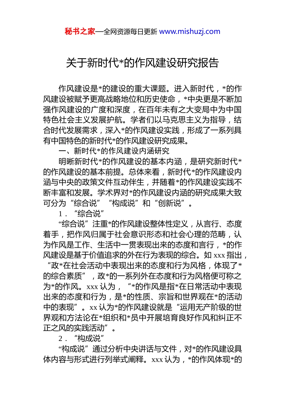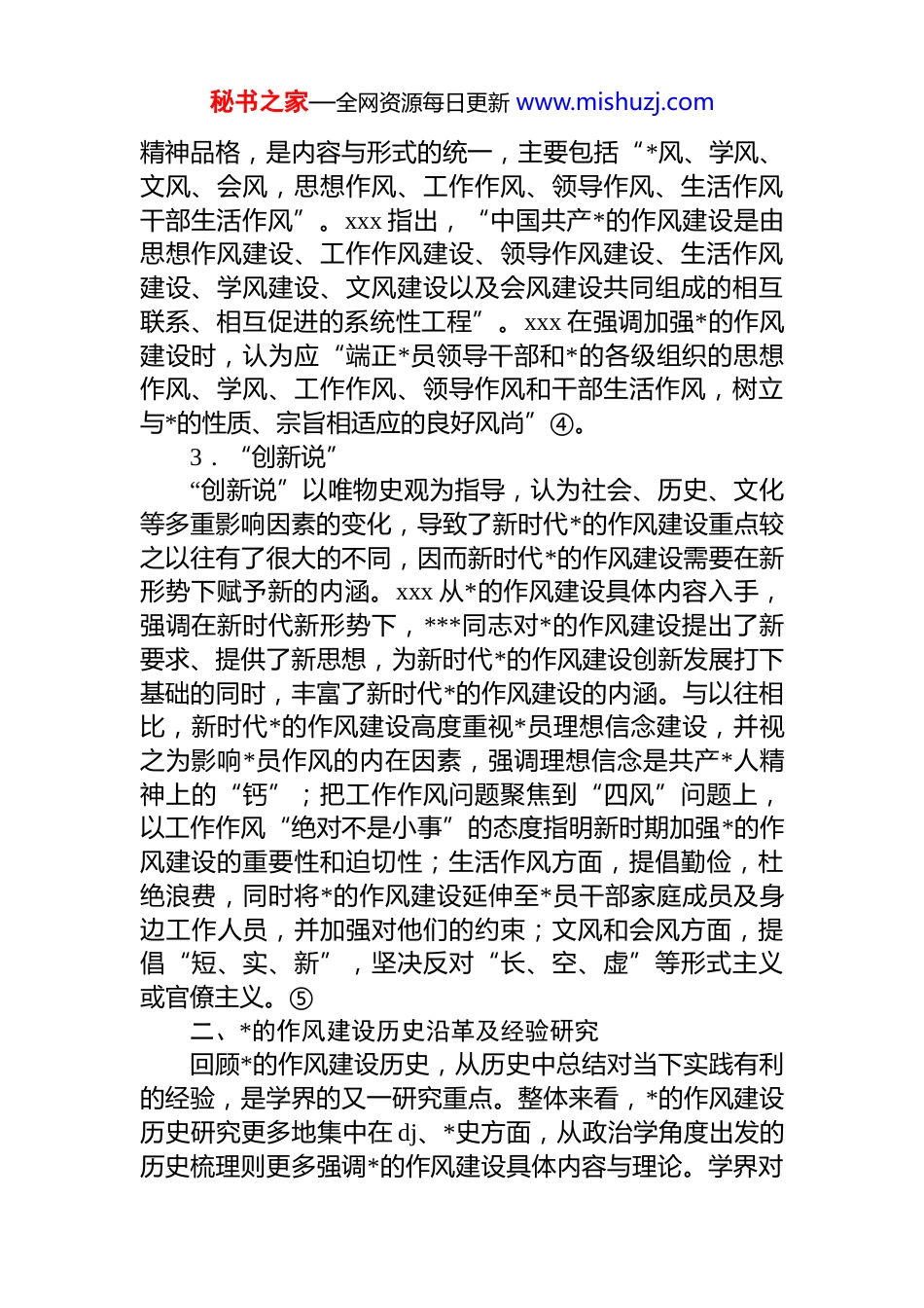 秘书之家—全网资源每日更新 www.mishuzj.com关于新时代*的作风建设研究报告作风建设是*的建设的重大课题。进入新时代,*的作风建设被赋予更高战略地位和历史使命,*中央更是不断加强作风建设的广度和深度,在百年未有之大变局中为中国特色社会主义发展护航。学者们以马克思主义为指导,结合时代发展需求,深入*的作风建设实践,形成了一系列具有中国特色的新时代*的作风建设研究成果。一、新时代*的作风建设内涵研究明晰新时代*的作风建设的基本内涵,是研究新时代*的作风建设的基本前提。总体来看,新时代*的作风建设内涵与中央的政策文件互动伴生,并随着*的作风建设实践不断丰富和发展。学术界对*的作风建设内涵的研究成果大致可分为“综合说”“构成说”和“创新说”。1.“综合说”“综合说”注重*的作风建设整体性定义,从言行、态度着手,把作风归属于社会意识形态和社会心理的范畴,认为作风是工作、生活中一贯表现出来的态度和言行,*的作风建设是基于价值追求的外在行为表现的综合。如 xxx 指出,“政*在社会活动中表现出来的态度和行为风格,体现了*的综合素质”,政*的一系列外在态度和行为风格便可称之为*的作风。xxx 认为,“*的作风是指*在日常活动中表现出来的态度和行为,是*的性质、宗旨和世界观在*的活动中的表现”。xx 认为*的作风建设就是“运用无产阶级的世界观和方法论在*组织和*员中开展培育良好作风和纠正不正之风的实践活动”。2.“构成说”“构成说”通过分析中央讲话与文件,对*的作风建设具体内容与形式进行列举式阐释。xxx 认为,*的作风体现*的秘书之家—全网资源每日更新 www.mishuzj.com精神品格,是内容与形式的统一,主要包括“*风、学风、文风、会风,思想作风、工作作风、领导作风、生活作风干部生活作风”。xxx 指出,“中国共产*的作风建设是由思想作风建设、工作作风建设、领导作风建设、生活作风建设、学风建设、文风建设以及会风建设共同组成的相互联系、相互促进的系统性工程”。xxx 在强调加强*的作风建设时,认为应“端正*员领导干部和*的各级组织的思想作风、学风、工作作风、领导作风和干部生活作风,树立与*的性质、宗旨相适应的良好风尚”④。3.“创新说”“创新说”以唯物史观为指导,认为社会、历史、文化等多重影响因素的变化,导致了新时代*的作风建设重点较之以往有了很大的不同,因而新时代*的作风建设需要在新形势下赋予新的内涵。xxx 从*的作风建设具体内容入手,强调在新时代新形势下,***同志对*的作风建设提出了新要求、提供了新思想,为新时代*的作风建设创新发展打下基础的同时,丰富了新时代*的作风建设的内涵。与以往相比,新时代*的作风建设高度重视*员理想信念建设,并视之为影响*员作风的内在因素,强调理想信念是共产*人精神上的“钙”;把工作作风问题聚焦到“四风”问题上,以工作作风“绝对不是小事”的态度指明新时期加强*的作风建设的重要性和迫切性;生活作风方面,提倡勤俭,杜绝浪费,同时将*的作风建设延伸至*员干部家庭成员及身边工作人员,并加强对他们的约束;文风和会风方面,提倡“短、实、新”,坚决反对“长、空、虚”等形式主义或官僚主义。⑤二、*的作风建设历史沿革及经验研究回顾*的作风建设历史,从历史中总结对当下实践有利的经验,是学界的又一研究重点。整体来看,*的作风建设历史研究更多地集中在 dj、*史方面,从政治学角度出发的历史梳理则更多强调*的作风建设具体内容与理论。学界对秘书之家—全网资源每日更新 www.mishuzj.com*的作风建设历史的研究主要可以分为两个方面:一是纵向梳理,在*的作风建设历史阶段划分的基础上,总结各个阶段*的作风建设的重点,从*的作风建设历史中提炼经验;二是以新时代为重要时间节点,通过对比研究突出新时代*的作风建设的创新之处和新发展。第一,*的作风建设历史经验研究。*的作风建设历史是重要的研究资源和宝库。xxx 认为,我们*作风建设不断取得成效可以归功于四个方面:始终高度重视作风建设,把*的作风问题看作关系*的生死存亡的重大问题;在坚持作风建设的同时,能够围绕*在不同历史阶段的中心任务不断推进*的作风建...