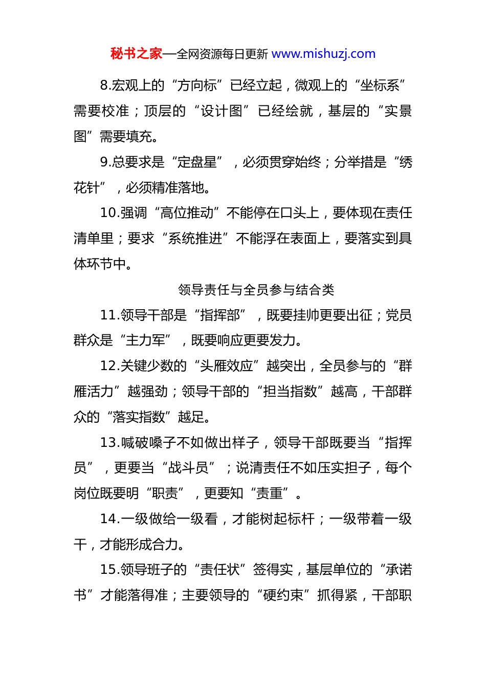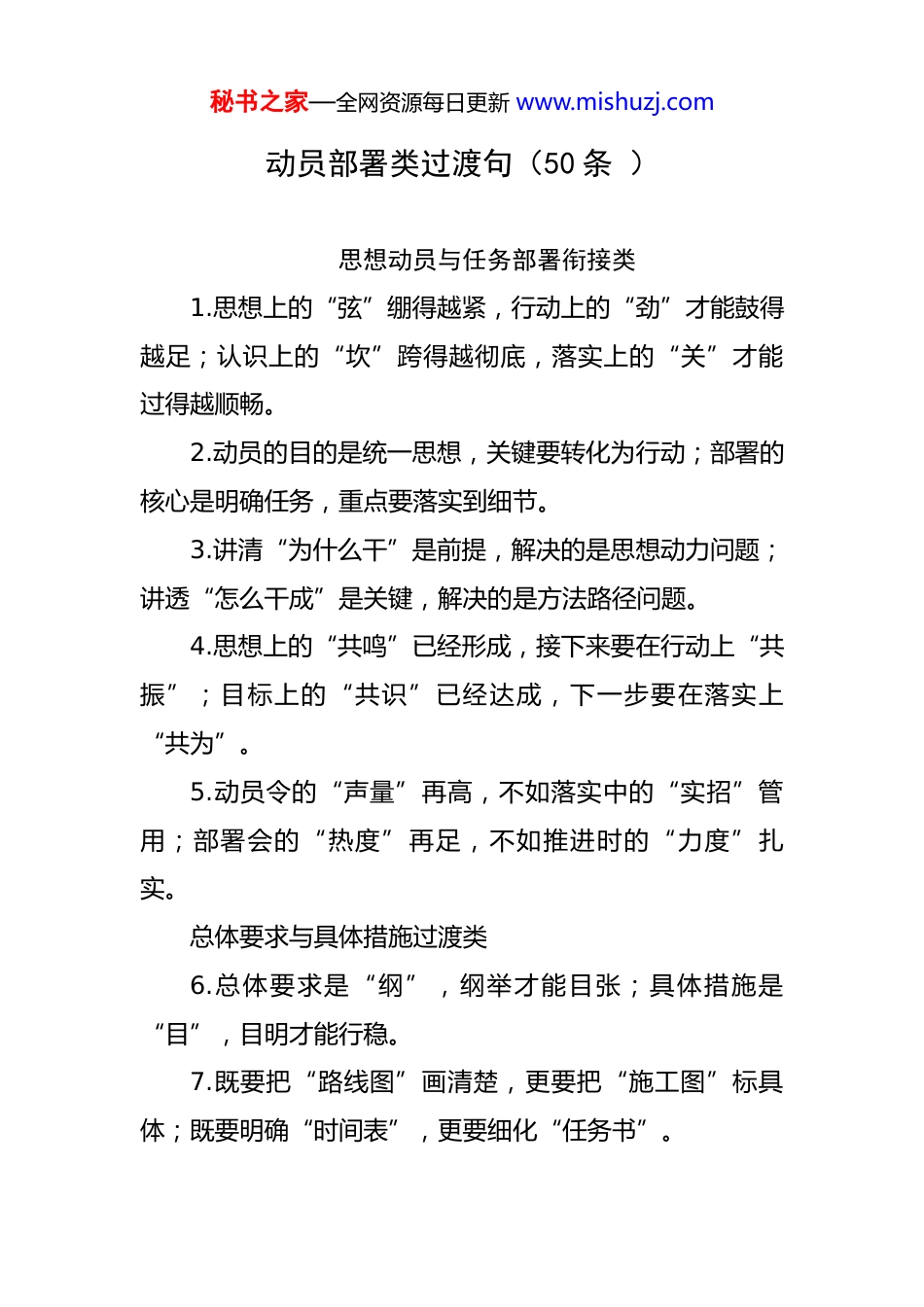 秘书之家—全网资源每日更新 www.mishuzj.com动员部署类过渡句(50 条 )思想动员与任务部署衔接类1.思想上的“弦”绷得越紧,行动上的“劲”才能鼓得越足;认识上的“坎”跨得越彻底,落实上的“关”才能过得越顺畅。2.动员的目的是统一思想,关键要转化为行动;部署的核心是明确任务,重点要落实到细节。3.讲清“为什么干”是前提,解决的是思想动力问题;讲透“怎么干成”是关键,解决的是方法路径问题。4.思想上的“共鸣”已经形成,接下来要在行动上“共振”;目标上的“共识”已经达成,下一步要在落实上“共为”。5.动员令的“声量”再高,不如落实中的“实招”管用;部署会的“热度”再足,不如推进时的“力度”扎实。总体要求与具体措施过渡类6.总体要求是“纲”,纲举才能目张;具体措施是“目”,目明才能行稳。7.既要把“路线图”画清楚,更要把“施工图”标具体;既要明确“时间表”,更要细化“任务书”。秘书之家—全网资源每日更新 www.mishuzj.com8.宏观上的“方向标”已经立起,微观上的“坐标系”需要校准;顶层的“设计图”已经绘就,基层的“实景图”需要填充。9.总要求是“定盘星”,必须贯穿始终;分举措是“绣花针”,必须精准落地。10.强调“高位推动”不能停在口头上,要体现在责任清单里;要求“系统推进”不能浮在表面上,要落实到具体环节中。领导责任与全员参与结合类11.领导干部是“指挥部”,既要挂帅更要出征;党员群众是“主力军”,既要响应更要发力。12.关键少数的“头雁效应”越突出,全员参与的“群雁活力”越强劲;领导干部的“担当指数”越高,干部群众的“落实指数”越足。13.喊破嗓子不如做出样子,领导干部既要当“指挥员”,更要当“战斗员”;说清责任不如压实担子,每个岗位既要明“职责”,更要知“责重”。14.一级做给一级看,才能树起标杆;一级带着一级干,才能形成合力。15.领导班子的“责任状”签得实,基层单位的“承诺书”才能落得准;主要领导的“硬约束”抓得紧,干部职秘书之家—全网资源每日更新 www.mishuzj.com工的“软任务”才能做得细。当前重点与长远目标贯通类16.抓好当前是为长远打基础,解决痛点是为全局破瓶颈;完成阶段任务是为整体目标蓄势能,攻克难点问题是为长远发展清障碍。17.既要立足“当下改”,解决突出问题;更要着眼“长久立”,健全长效机制。18.今天的“攻坚”是为明天的“跨越”铺路,现在的“深耕”是为未来的“丰收”播种。19.把“短期战”打成“漂亮仗”,才能为“持久战”攒足底气;把“局部胜”连成“全局胜”,才能为“整体赢”筑牢根基。20.既要算好“眼前账”,确保任务按期完成;更要算清“长远账”,推动工作提质增效。压力传导与动力激发过渡类21.压力传导不是“层层加码”,而是“层层加责”;动力激发不是“空喊口号”,而是“实打激励”。22.把“严”的要求传下去,才能杜绝“上热中温下冷”;把“干”的导向树起来,才能避免“表态多落实少”。23.问责不是目的,是为了倒逼责任落实;激励不是手秘书之家—全网资源每日更新 www.mishuzj.com段,是为了激发干事热情。24.既要用“硬约束”划红线,让“不担当”者受警醒;更要用“软关怀”强保障,让“敢担当”者有奔头。25.把“干与不干不一样”体现在考核里,把“干多干少不一样”落实到奖惩中,把“干好干坏不一样”兑现到实处。方法指导与实战推进衔接类26.讲方法不是“纸上谈兵”,是为了少走弯路;教技巧不是“投机取巧”,是为了提高效率。27.既要“面对面”教方法,更要“手把手”带实战;既要“点问题”指不足,更要“教对策”给路径。28.理论培训是“基础课”,解决“会不会”的问题;实战演练是“提升课”,解决“能不能”的问题。29.把“怎么干”的路径讲清楚,干部才不会“乱作为”;把“干到哪”的标准说明白,工作才不会“打折扣”。30.既要避免“只说不练”的空转,也要防止“盲目蛮干”的低效;既要突出“精准指导”的实效,也要强化“一线攻坚”的作风。目标引领与问题导向结合类31.目标是“方向灯”,问题是“突破口”;盯着目标秘书之家—全网资源每日更新 www.mishuzj.com干,才能不偏航;对着问题改...