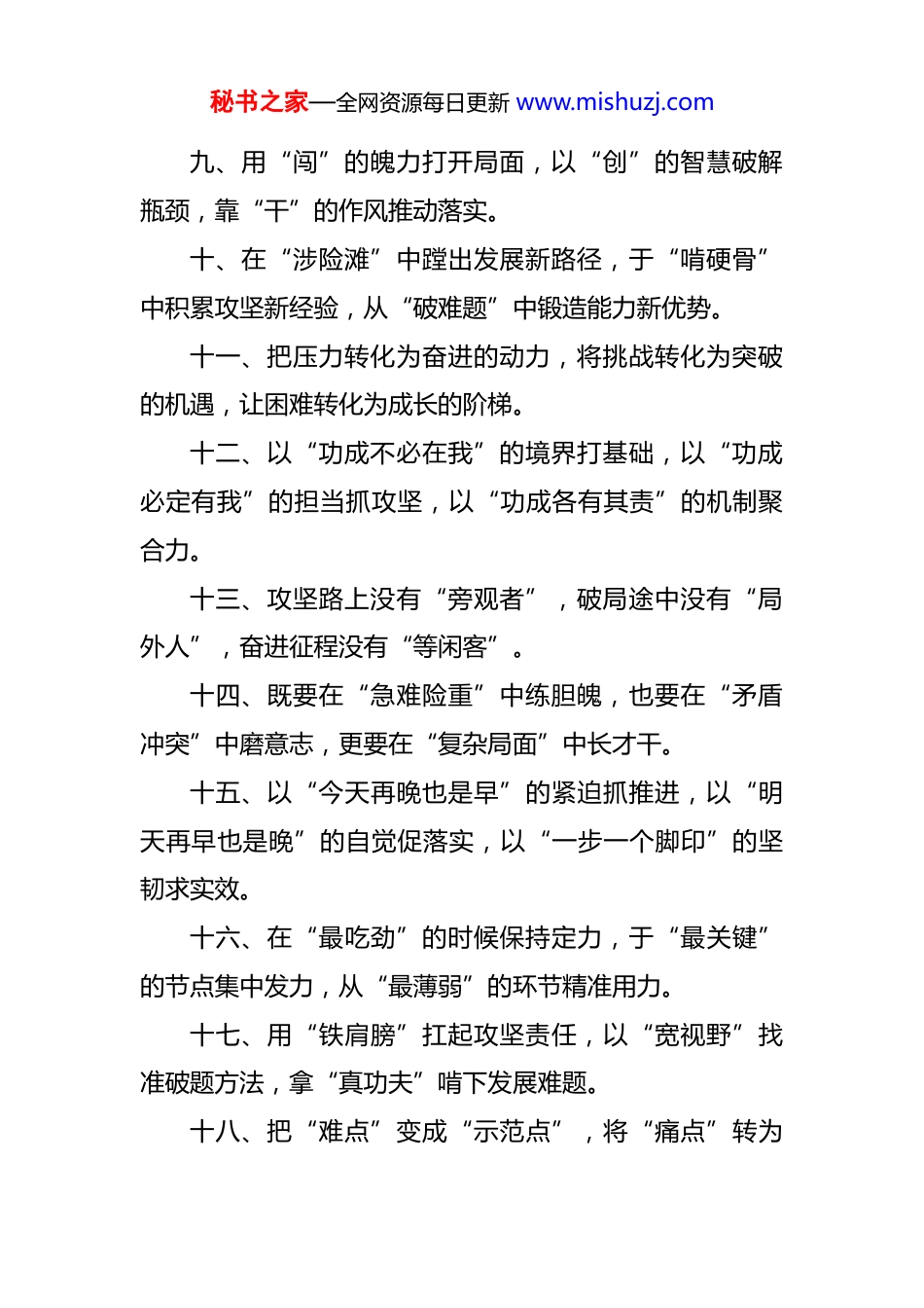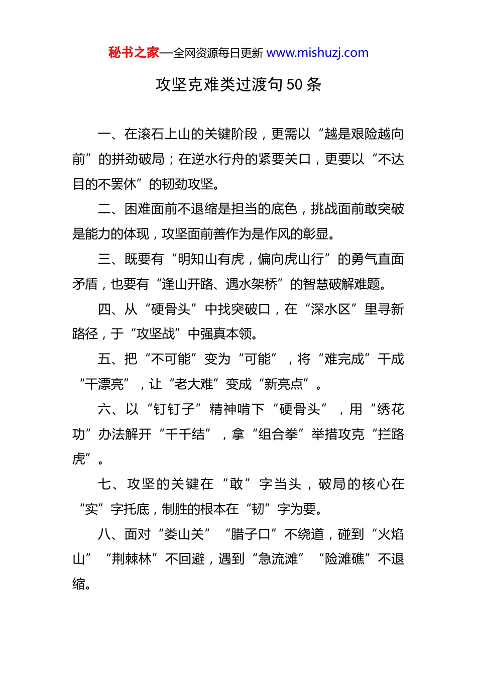 秘书之家—全网资源每日更新 www.mishuzj.com攻坚克难类过渡句 50 条 一、在滚石上山的关键阶段,更需以“越是艰险越向前”的拼劲破局;在逆水行舟的紧要关口,更要以“不达目的不罢休”的韧劲攻坚。二、困难面前不退缩是担当的底色,挑战面前敢突破是能力的体现,攻坚面前善作为是作风的彰显。三、既要有“明知山有虎,偏向虎山行”的勇气直面矛盾,也要有“逢山开路、遇水架桥”的智慧破解难题。四、从“硬骨头”中找突破口,在“深水区”里寻新路径,于“攻坚战”中强真本领。五、把“不可能”变为“可能”,将“难完成”干成“干漂亮”,让“老大难”变成“新亮点”。六、以“钉钉子”精神啃下“硬骨头”,用“绣花功”办法解开“千千结”,拿“组合拳”举措攻克“拦路虎”。七、攻坚的关键在“敢”字当头,破局的核心在“实”字托底,制胜的根本在“韧”字为要。八、面对“娄山关”“腊子口”不绕道,碰到“火焰山”“荆棘林”不回避,遇到“急流滩”“险滩礁”不退缩。秘书之家—全网资源每日更新 www.mishuzj.com九、用“闯”的魄力打开局面,以“创”的智慧破解瓶颈,靠“干”的作风推动落实。十、在“涉险滩”中蹚出发展新路径,于“啃硬骨”中积累攻坚新经验,从“破难题”中锻造能力新优势。十一、把压力转化为奋进的动力,将挑战转化为突破的机遇,让困难转化为成长的阶梯。十二、以“功成不必在我”的境界打基础,以“功成必定有我”的担当抓攻坚,以“功成各有其责”的机制聚合力。十三、攻坚路上没有“旁观者”,破局途中没有“局外人”,奋进征程没有“等闲客”。十四、既要在“急难险重”中练胆魄,也要在“矛盾冲突”中磨意志,更要在“复杂局面”中长才干。十五、以“今天再晚也是早”的紧迫抓推进,以“明天再早也是晚”的自觉促落实,以“一步一个脚印”的坚韧求实效。十六、在“最吃劲”的时候保持定力,于“最关键”的节点集中发力,从“最薄弱”的环节精准用力。十七、用“铁肩膀”扛起攻坚责任,以“宽视野”找准破题方法,拿“真功夫”啃下发展难题。十八、把“难点”变成“示范点”,将“痛点”转为秘书之家—全网资源每日更新 www.mishuzj.com“提升点”,让“堵点”变为“畅通点”。十九、以“归零心态”再出发,用“冲刺姿态”抓攻坚,拿“战斗状态”促突破。二十、攻坚要“敢”字为先,破局需“谋”字为基,落实重“干”字为要。二十一、在“滚石上山”中锤炼担当,于“逆水行舟”中磨砺本领,从“闯关夺隘”中积累经验。二十二、既要“致广大”把握全局方向,也要“尽精微”突破具体难点,更要“抓关键”带动整体提升。二十三、以“抓铁有痕”的力度攻难点,用“踏石留印”的韧劲克难关,拿“水滴石穿”的耐心促长效。二十四、把“问题清单”变为“攻坚清单”,将“任务台账”转为“成效账单”,让“责任链条”形成“落实闭环”。二十五、在“无人区”里探路,于“空白处”里创新,从“薄弱点”里突破。二十六、以“等不起”的紧迫感快行动,以“慢不得”的危机感抢时间,以“坐不住”的责任感抓落实。二十七、攻坚需要“明知难为而必为”的担当,破局需要“明知难成而必成”的信念,奋进需要“明知难赢而必赢”的斗志。秘书之家—全网资源每日更新 www.mishuzj.com二十八、把“硬任务”分解成“小目标”,将“大挑战”转化为“微战斗”,让“攻坚战”变成“歼灭战”。二十九、在“矛盾窝”里找规律,于“问题堆”中寻对策,从“困难群”里破僵局。三十、以“一线工作法”直插攻坚现场,用“解剖麻雀法”深研问题本质,拿“闭环工作法”确保落实见效。三十一、攻坚要“敢打硬 仗”,破局需“善打 巧仗”,落实重“能打胜仗”。三十二、把“痛点”作为“发力点”,将“难点”变为“突破点”,让“焦点”成为“闪光点”。三十三、以“舍我其谁”的担当挑重担,以“时不我待”的紧迫抓进度,以“精益求精”的标准提质量。三十四、在“最前沿”锤炼本领,于“最基层”积累经验,从“最艰苦”磨砺意志。三十五、用“钉钉子”精神一锤接着一锤敲,以“马拉松”耐力一步跟着一步跑,拿“组合拳”方式一招连着一招打。三十六、攻坚要“敢破常规”...