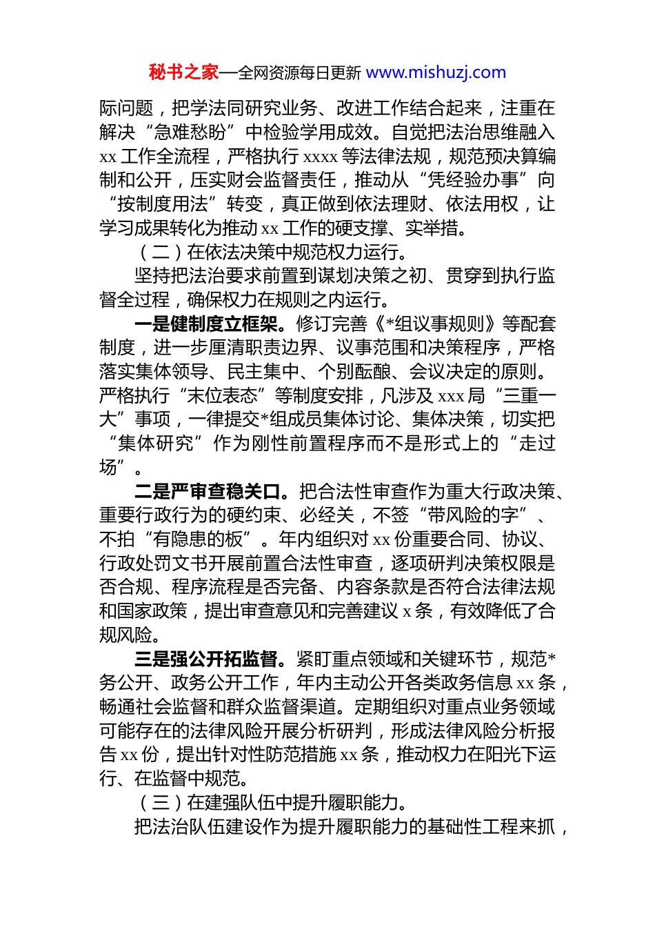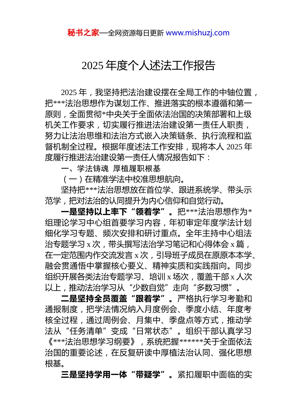 秘书之家—全网资源每日更新 www.mishuzj.com2025 年度个人述法工作报告2025 年,我坚持把法治建设摆在全局工作的中轴位置,把***法治思想作为谋划工作、推进落实的根本遵循和第一原则,全面贯彻*中央关于全面依法治国的决策部署和上级机关工作要求,切实履行推进法治建设第一责任人职责,努力让法治思维和法治方式嵌入决策链条、执行流程和监督机制全过程。根据年度述法工作安排,现将本人 2025 年度履行推进法治建设第一责任人情况报告如下:一、学法铸魂 厚植履职根基(一)在精准学法中校准思想航向。坚持把***法治思想放在首位学、跟进系统学、带头示范学,把对法治的认同提升为内心信仰和自觉行动。一是坚持以上率下“领着学”。把***法治思想作为*组理论学习中心组首要学习内容,年初审定年度学法计划细化学习专题、频次安排和研讨重点。全年主持中心组法治专题学习 x 次,带头撰写法治学习笔记和心得体会 x 篇,在一定范围内作交流发言 x 次,引导班子成员在原原本本学、融会贯通悟中掌握核心要义、精神实质和实践指向。同步组织开展各类法治专题学习、培训 x 场次,覆盖干部 x 人次以上,推动法治学习从“少数自觉”走向“多数习惯”。二是坚持全员覆盖“跟着学”。严格执行学习考勤和通报制度,把学法情况纳入月度例会、季度小结、年度考核全过程,通过周例会、月集中、季盘点等方式,推动学法从“任务清单”变成“日常状态”。组织干部认真学习《***法治思想学习纲要》,系统把握******关于全面依法治国的重要论述,在反复研读中厚植法治认同、强化思想根基。三是坚持学用一体“带疑学”。紧扣履职中面临的实秘书之家—全网资源每日更新 www.mishuzj.com际问题,把学法同研究业务、改进工作结合起来,注重在解决“急难愁盼”中检验学用成效。自觉把法治思维融入xx 工作全流程,严格执行 xxxx 等法律法规,规范预决算编制和公开,压实财会监督责任,推动从“凭经验办事”向“按制度用法”转变,真正做到依法理财、依法用权,让学习成果转化为推动 xx 工作的硬支撑、实举措。(二)在依法决策中规范权力运行。坚持把法治要求前置到谋划决策之初、贯穿到执行监督全过程,确保权力在规则之内运行。一是健制度立框架。修订完善《*组议事规则》等配套制度,进一步厘清职责边界、议事范围和决策程序,严格落实集体领导、民主集中、个别酝酿、会议决定的原则。严格执行“末位表态”等制度安排,凡涉及 xxx 局“三重一大”事项,一律提交*组成员集体讨论、集体决策,切实把“集体研究”作为刚性前置程序而不是形式上的“走过场”。二是严审查稳关口。把合法性审查作为重大行政决策、重要行政行为的硬约束、必经关,不签“带风险的字”、不拍“有隐患的板”。年内组织对 xx 份重要合同、协议、行政处罚文书开展前置合法性审查,逐项研判决策权限是否合规、程序流程是否完备、内容条款是否符合法律法规和国家政策,提出审查意见和完善建议 x 条,有效降低了合规风险。三是强公开拓监督。紧盯重点领域和关键环节,规范*务公开、政务公开工作,年内主动公开各类政务信息 xx 条,畅通社会监督和群众监督渠道。定期组织对重点业务领域可能存在的法律风险开展分析研判,形成法律风险分析报告 xx 份,提出针对性防范措施 xx 条,推动权力在阳光下运行、在监督中规范。(三)在建强队伍中提升履职能力。把法治队伍建设作为提升履职能力的基础性工程来抓,秘书之家—全网资源每日更新 www.mishuzj.com努力打造一支“懂法律、会办案、善服务”的干部队伍。一是严把执法资格入口关。严格执行行政执法人员资格管理规定,动态更新行政执法人员名册,选配 xx 名取得行政执法证的业务骨干充实到一线岗位,确保持证上岗、亮证执法。组织新入职 x 名人员报名参加 2025 年度行政执法人员资格考试,其中成绩合格 x 人,通过率达 x%,为今后执法力量储备打下坚实基础。二是多维培训提升专业功。统筹用好法律顾问、上级业务部门、专业院校等资源,组织法律顾问专题讲座 x 场次,围绕行政执法实务、合同审查、争议防控等重点领域答疑释惑;组织执法人员开...