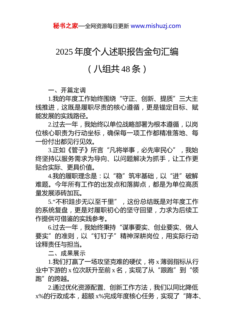 秘书之家—全网资源每日更新 www.mishuzj.com2025 年度个人述职报告金句汇编(八组共 48 条)一、开篇定调1.我的年度工作始终围绕“守正、创新、提质”三大主线推进,这既是履职尽责的核心遵循,更是锚定目标、赋能发展的实践路径。2.过去一年,我始终以单位战略部署为根本遵循,以岗位核心职责为行动坐标,确保每一项工作都精准落地、每一份付出都见行见效。3.正如《管子》所言“凡将举事,必先审民心”,我始终坚持以服务需求为导向、以问题解决为抓手,让工作更贴合实际、更具价值。4.我的履职理念是:以“稳”筑牢基础,以“进”破解难题。今年所有工作的出发点和落脚点,都是为单位高质量发展添砖加瓦。5.“不积跬步无以至千里”,这份总结既是对年度工作的系统复盘,更是对履职初心的坚守回望,力求为后续工作提供可借鉴的实践参考。6.过去一年,我始终秉持“谋事要实、创业要实、做人要实”的准则,以“钉钉子”精神深耕岗位,用实际行动诠释责任与担当。二、成果展示1.我们打赢了一场攻坚克难的硬仗,将 x 薄弱指标从行业中下游的 x 位次跃升至前 x 名,实现了从“跟跑”到“领跑”的跨越。2.通过优化资源配置、创新工作方法,我们以同比降低x%的行政成本,超额 x%完成年度核心任务,实现了“降本、秘书之家—全网资源每日更新 www.mishuzj.com增效、提质”三重突破。3.成功打造 x 特色工作品牌,不仅填补了单位在该领域的空白,更成为对外展示形象的重要窗口,获得上级部门 x次书面表彰。4.主导推进 x 流程数字化改造,将业务办理时限从 x 个工作日压缩至 x 个工作日,群众满意度从 x%提升至 x%,实现服务效能与口碑双提升。5.牵头构建 x 数据共享平台,打破了 x 个部门间的信息壁垒,使跨部门协作效率提升 x%,全年累计减少重复工作量约 x 小时。6.深耕 x 业务领域,通过精准对接需求、优化服务模式,全年新增合作项目 x 个,带动相关业务收入增长 x%,成为新的业绩增长点。三、履职情况1.对核心职责始终坚持“高标准、严要求、零差错”,今年负责的 x 专项工作,在上级组织的 x 次专项考核中均获评“优秀等次”,实现“全满贯”。2.秉持“成为岗位‘活字典’、业务‘排头兵’”的追求,熟练掌握 x 领域政策法规、业务流程,全年累计解答同事咨询 x 余次、指导基层工作 x 次。3.建立“目标分解-过程督办-结果复盘”的履职闭环机制,全年牵头负责的 x 项重点任务均按时保质完成,任务达标率 100%。4.面对 x 突发应急任务,第一时间主动请缨,带领团队在 x 小时内完成预案制定、资源调配、现场处置等工作,确保事件得到妥善解决,未造成不良影响。5.针对 x 履职难点,牵头开展专题调研 x 次,借鉴先进地区经验并结合实际,制定《x 工作操作规范》,推动履职标准化、规范化水平显著提升。6.坚持“事事有回应、件件有着落”的工作原则,全年受理各类工作事项 x 件,办结率 x%、好评率 x%,未出现秘书之家—全网资源每日更新 www.mishuzj.com任何推诿扯皮、延误超时问题。四、重点项目成果1.面对 x 重点项目“时间紧、任务重、难度大”的挑战,我们组建攻坚专班,通过“挂图作战、倒排工期、逐项销号”,最终提前 x 天完成项目交付,打造了同类项目的“样板工程”。2.项目实施过程中,不仅圆满完成既定目标,更沉淀形成“需求调研-方案设计-落地执行-效果评估”的全周期工作法,已在单位内部 x 个项目中推广应用。3.该项目的价值多元凸显:业务层面,带动 x 指标提升x%;管理层面,优化了 x 项核心流程;人才层面,培养了 x名具备项目统筹能力的骨干人员。4.依托项目积累的 x 类核心数据,完成 x 份深度分析报告,精准识别业务优化方向 x 个,为单位战略决策提供了重要数据支撑。5.针对项目中的 x 技术瓶颈,联合技术团队开展 x 轮攻关,成功研发 x 创新应用工具,获得 x 项软件著作权,显著提升了工作自动化、智能化水平。6.牵头推进 x 跨区域合作项目,成功对接 x 家外部单位,建立长期合作机制,项目成果获得上级主管部门通报表扬为单位争取了重要发展资源。五、团队协作1.坚...