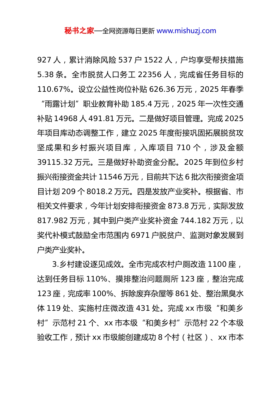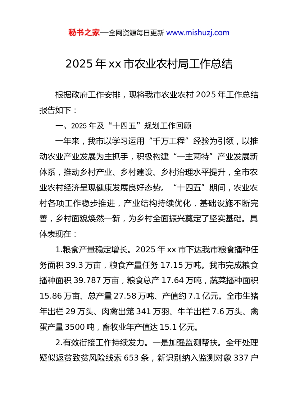秘书之家—全网资源每日更新 www.mishuzj.com2025 年 xx 市农业农村局工作总结根据政府工作安排,现将我市农业农村 2025 年工作总结报告如下:一、2025 年及“十四五”规划工作回顾一年来,我市以学习运用“千万工程”经验为引领,以推动农业产业发展为主抓手,积极构建“一主两特”产业发展新体系,推动乡村产业、乡村建设、乡村治理水平提升,全市农业农村经济呈现健康发展良好态势。“十四五”期间,农业农村各项工作稳步推进,产业结构持续优化,基础设施不断完善,乡村面貌焕然一新,为乡村全面振兴奠定了坚实基础。具体表现在:1.粮食产量稳定增长。2025 年 xx 市下达我市粮食播种任务面积 39.3 万亩,粮食产量任务 17.15 万吨。我市完成粮食播种面积 39.787 万亩,粮食总产 17.64 万吨,蔬菜播种面积15.86 万亩、总产量 27.58 万吨、产值约 7.1 亿元。全市生猪年出栏 29 万头、肉禽出笼 341 万羽、牛羊出栏 7.6 万头、禽蛋产量 3500 吨,畜牧业年产值达 15.1 亿元。2.有效衔接工作持续发力。一是加强监测帮扶。全年处理疑似返贫致贫风险线索 653 条,新识别纳入监测对象 337 户秘书之家—全网资源每日更新 www.mishuzj.com927 人,累计消除风险 537 户 1522 人,户均享受帮扶措施5.38 条。全市脱贫人口务工 22356 人,完成省任务目标的110.67%。设立公益性岗位补贴 626.36 万元,2025 年春季“雨露计划”职业教育补助 185.4 万元,2025 年一次性交通补贴 14968 人 491.81 万元。二是做好项目管理。完成 2025年项目库动态调整工作,建立 2025 年度衔接巩固拓展脱贫攻坚成果和乡村振兴项目库,入库项目 710 个,涉及金额39115.32 万元。三是做好补助资金分配。2025 年到位乡村振兴衔接资金共计 11546 万元,目前共下达 6 批次衔接资金项目计划 209 个 8018.2 万元。四是发放产业奖补。根据省、市相关文件要求,今年计划安排衔接资金 873.8 万元,实际发放817.982 万元,其中到户类产业奖补资金 744.182 万元,以奖代补模式鼓励全市范围内 6971 户脱贫户、监测对象发展到户类产业奖补。3.乡村建设逐见成效。全市完成农村户厕改造 1100 座,达到任务目标 110%、摸排整治问题厕所 123 座,整治完成123 座,完成率 100%、拆除废弃杂屋等 861 处、整治黑臭水体 119 处、实施村庄微改造 431 处。完成 xx 市级“和美乡村”示范村 21 个、xx 市本级“和美乡村”示范村 22 个本级验收工作,预计 xx 市级能创建成功 8 个村(社区)、xx 市本秘书之家—全网资源每日更新 www.mishuzj.com级 22 个。4.农业生态环境治理持续发力。2025 年秸秆综合利用率在 95%以上,受污染耕地安全利用率在 93%以上,完成科学施肥田间试验 5 个。通过防灾挽回农作物损失 176211.36吨。清除柑橘黄龙病病树 129 亩、4290 株。全市全年主要粮食作物病虫草害防治总面积 272.03 万亩次,测土配方施肥技术推广面积累计 90 万亩次,主要农作物实施病虫害绿色防控面积 63.59 万亩,农药使用实际用量 232.3 吨。大力推进养殖污染治理,开展畜禽养殖规范指导 700 余次,成功规范养殖场307 家,通过农业面源污染治理项目规范提升了 85 家养殖场的污染治理设施。5.农业产业不断壮大。柑橘产业。2025 年我市水果种植面积 48.05 万亩、产量 56.86 万吨、产值约 22.9 亿元。全年完成柑橘品改、低改 5.18 万亩,引进柑橘新品种 2 个,创建岩垅乡力丰村柑橘高标准示范园等示范果园 10 个,安江农产品物流中心(柑橘交易中心)、xx 市综合农产品冷链仓储物流中心已基本完成建设。2025 年黔阳冰糖橙果品区域公用品牌价值达到 35.24 亿元。水稻制种产业。2025 年 xx 市杂交水稻制种面积 3.165 万亩,同比增长 19.4%,制种组合 51 个。入驻 xx 市制种企业 19 家、制种大户 100 余户、制种专业合作社秘书之家—全网资源每日更新 www.mishuzj.com15 家、农机专业合作组织 11 个。在黔城镇国投集团旁仓储中心总投资 578 万元建设一处种子烘干中心,面积 3...
