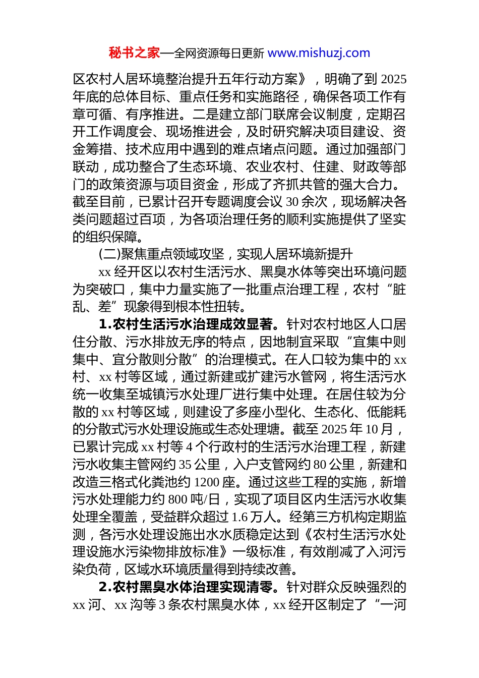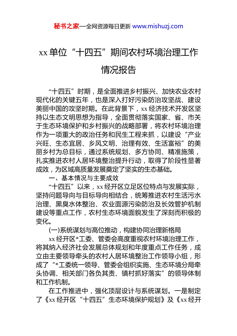 秘书之家—全网资源每日更新 www.mishuzj.comxx 单位“十四五”期间农村环境治理工作情况报告“十四五”时期,是全面推进乡村振兴、加快农业农村现代化的关键五年,也是深入打好污染防治攻坚战、建设美丽中国的攻坚时期。在此背景下,xx 经济技术开发区坚持以生态文明思想为指导,全面贯彻落实国家、省、市关于生态环境保护和乡村振兴的战略部署,将农村环境治理作为一项重大的政治任务和民生工程来抓,以建设“产业兴旺、生态宜居、乡风文明、治理有效、生活富裕”的美丽乡村为总目标,通过系统规划、多方协同、精准施策,扎实推进农村人居环境整治提升行动,取得了阶段性显著成效,为区域高质量发展奠定了坚实的生态基础。一、基本情况与主要成效“十四五”以来,xx 经开区立足区位特点与发展实际,坚持问题导向与目标导向相结合,统筹推进农村生活污水治理、黑臭水体整治、农业面源污染防治及长效管护机制建设等重点工作,农村生态环境面貌发生了深刻而积极的变化。(一)系统谋划与高位推动,构建协同治理新格局xx 经开区*工委、管委会高度重视农村环境治理工作,将其纳入经济社会发展总体规划和年度重点工作任务,成立由主要领导牵头的农村人居环境整治工作领导小组,形成了“*工委统一领导、管委会组织实施、生态环境分局牵头协调、相关部门各负其责、镇村抓好落实”的领导体制和工作机制。在工作推进中,强化顶层设计与系统谋划。一是制定了《xx 经开区“十四五”生态环境保护规划》及《xx 经开秘书之家—全网资源每日更新 www.mishuzj.com区农村人居环境整治提升五年行动方案》,明确了到 2025年底的总体目标、重点任务和实施路径,确保各项工作有章可循、有序推进。二是建立部门联席会议制度,定期召开工作调度会、现场推进会,及时研究解决项目建设、资金筹措、技术应用中遇到的难点堵点问题。通过加强部门联动,成功整合了生态环境、农业农村、住建、财政等部门的政策资源与项目资金,形成了齐抓共管的强大合力。截至目前,已累计召开专题调度会议 30 余次,现场解决各类问题超过百项,为各项治理任务的顺利实施提供了坚实的组织保障。(二)聚焦重点领域攻坚,实现人居环境新提升xx 经开区以农村生活污水、黑臭水体等突出环境问题为突破口,集中力量实施了一批重点治理工程,农村“脏乱、差”现象得到根本性扭转。1.农村生活污水治理成效显著。针对农村地区人口居住分散、污水排放无序的特点,因地制宜采取“宜集中则集中、宜分散则分散”的治理模式。在人口较为集中的 xx村、xx 村等区域,通过新建或扩建污水管网,将生活污水统一收集至城镇污水处理厂进行集中处理。在居住较为分散的 xx 村等区域,则建设了多座小型化、生态化、低能耗的分散式污水处理设施或生态处理塘。截至 2025 年 10 月,已累计完成 xx 村等 4 个行政村的生活污水治理工程,新建污水收集主管网约 35 公里,入户支管网约 80 公里,新建和改造三格式化粪池约 1200 座。通过这些工程的实施,新增污水处理能力约 800 吨/日,实现了项目区内生活污水收集处理全覆盖,受益群众超过 1.6 万人。经第三方机构定期监测,各污水处理设施出水水质稳定达到《农村生活污水处理设施水污染物排放标准》一级标准,有效削减了入河污染负荷,区域水环境质量得到持续改善。2.农村黑臭水体治理实现清零。针对群众反映强烈的xx 河、xx 沟等 3 条农村黑臭水体,xx 经开区制定了“一河秘书之家—全网资源每日更新 www.mishuzj.com一策”的综合整治方案。治理工作遵循“控源截污、内源治理、生态修复、活水保质”的技术路线,多措并举,标本兼治。一是全面控源截污,对河道沿线所有排口进行拉网式排查,封堵非法排污口 15 个,将沿岸居民生活污水、企业生产废水全部纳入市政管网或独立的污水处理系统,从源头上切断污染来源。二是强化内源治理,累计投入资金约 2500 万元,对 3 条河道实施了总长度约 8.5 公里的清淤疏浚工程,共清除淤泥约 5 万立方米,有效消除了底泥污染释放风险。三是实施生态修复,在河道沿岸建设了总面积约 1.2 万平方米的生态护坡和植被缓冲带,利...
