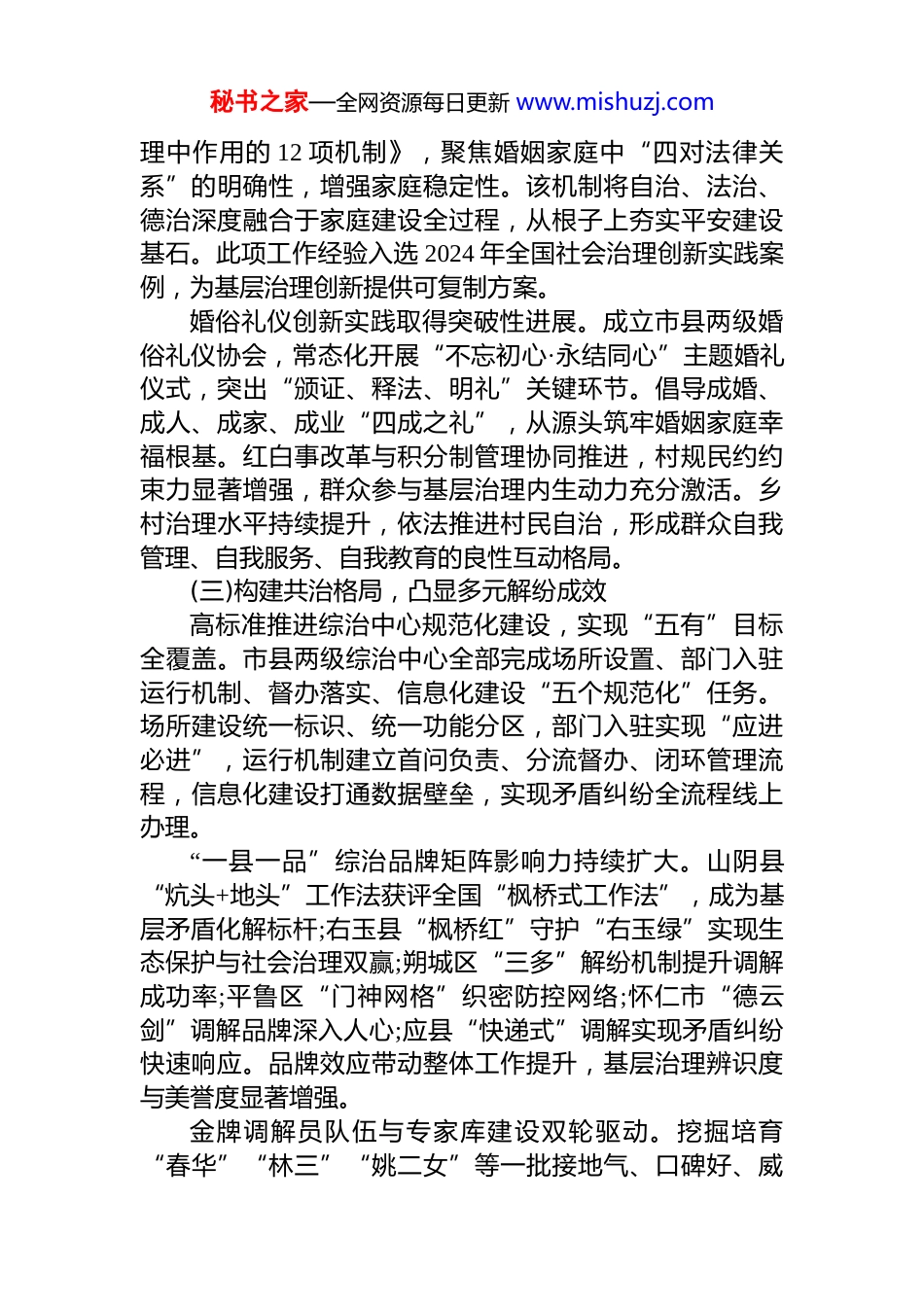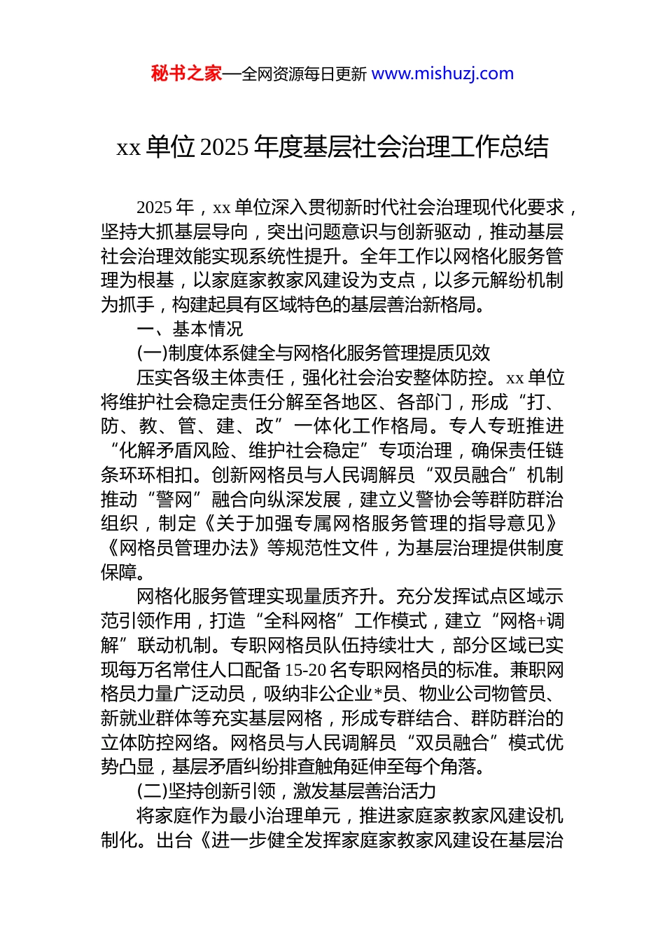 秘书之家—全网资源每日更新 www.mishuzj.comxx 单位 2025 年度基层社会治理工作总结2025 年,xx 单位深入贯彻新时代社会治理现代化要求,坚持大抓基层导向,突出问题意识与创新驱动,推动基层社会治理效能实现系统性提升。全年工作以网格化服务管理为根基,以家庭家教家风建设为支点,以多元解纷机制为抓手,构建起具有区域特色的基层善治新格局。一、基本情况(一)制度体系健全与网格化服务管理提质见效压实各级主体责任,强化社会治安整体防控。xx 单位将维护社会稳定责任分解至各地区、各部门,形成“打、防、教、管、建、改”一体化工作格局。专人专班推进“化解矛盾风险、维护社会稳定”专项治理,确保责任链条环环相扣。创新网格员与人民调解员“双员融合”机制推动“警网”融合向纵深发展,建立义警协会等群防群治组织,制定《关于加强专属网格服务管理的指导意见》《网格员管理办法》等规范性文件,为基层治理提供制度保障。网格化服务管理实现量质齐升。充分发挥试点区域示范引领作用,打造“全科网格”工作模式,建立“网格+调解”联动机制。专职网格员队伍持续壮大,部分区域已实现每万名常住人口配备 15-20 名专职网格员的标准。兼职网格员力量广泛动员,吸纳非公企业*员、物业公司物管员、新就业群体等充实基层网格,形成专群结合、群防群治的立体防控网络。网格员与人民调解员“双员融合”模式优势凸显,基层矛盾纠纷排查触角延伸至每个角落。(二)坚持创新引领,激发基层善治活力将家庭作为最小治理单元,推进家庭家教家风建设机制化。出台《进一步健全发挥家庭家教家风建设在基层治秘书之家—全网资源每日更新 www.mishuzj.com理中作用的 12 项机制》,聚焦婚姻家庭中“四对法律关系”的明确性,增强家庭稳定性。该机制将自治、法治、德治深度融合于家庭建设全过程,从根子上夯实平安建设基石。此项工作经验入选 2024 年全国社会治理创新实践案例,为基层治理创新提供可复制方案。婚俗礼仪创新实践取得突破性进展。成立市县两级婚俗礼仪协会,常态化开展“不忘初心·永结同心”主题婚礼仪式,突出“颁证、释法、明礼”关键环节。倡导成婚、成人、成家、成业“四成之礼”,从源头筑牢婚姻家庭幸福根基。红白事改革与积分制管理协同推进,村规民约约束力显著增强,群众参与基层治理内生动力充分激活。乡村治理水平持续提升,依法推进村民自治,形成群众自我管理、自我服务、自我教育的良性互动格局。(三)构建共治格局,凸显多元解纷成效高标准推进综治中心规范化建设,实现“五有”目标全覆盖。市县两级综治中心全部完成场所设置、部门入驻运行机制、督办落实、信息化建设“五个规范化”任务。场所建设统一标识、统一功能分区,部门入驻实现“应进必进”,运行机制建立首问负责、分流督办、闭环管理流程,信息化建设打通数据壁垒,实现矛盾纠纷全流程线上办理。“一县一品”综治品牌矩阵影响力持续扩大。山阴县“炕头+地头”工作法获评全国“枫桥式工作法”,成为基层矛盾化解标杆;右玉县“枫桥红”守护“右玉绿”实现生态保护与社会治理双赢;朔城区“三多”解纷机制提升调解成功率;平鲁区“门神网格”织密防控网络;怀仁市“德云剑”调解品牌深入人心;应县“快递式”调解实现矛盾纠纷快速响应。品牌效应带动整体工作提升,基层治理辨识度与美誉度显著增强。金牌调解员队伍与专家库建设双轮驱动。挖掘培育“春华”“林三”“姚二女”等一批接地气、口碑好、威秘书之家—全网资源每日更新 www.mishuzj.com望高的金牌调解员,发挥其在复杂矛盾纠纷中的攻坚作用建成山西省首个市级矛盾纠纷多元调解专家库,吸纳法学心理学、社会工作等领域专家学者及资深法律实务工作者186 名,为重大疑难纠纷提供专业支撑。专家库运行以来,参与会诊复杂案件 47 件,出具专业意见 92 份,调解成功率提升 12.3 个百分点。调解组织网络实现纵向到底、横向到边。依托 189 个人民调解委员会,将 958 名人民调解员纳入“法律明白人”重点培养范围。全县共建有调委会 189 个,人民调解员 1024名,实现乡镇、村社全覆盖。村级调解组织配备专职调解员 2-3 名,社...