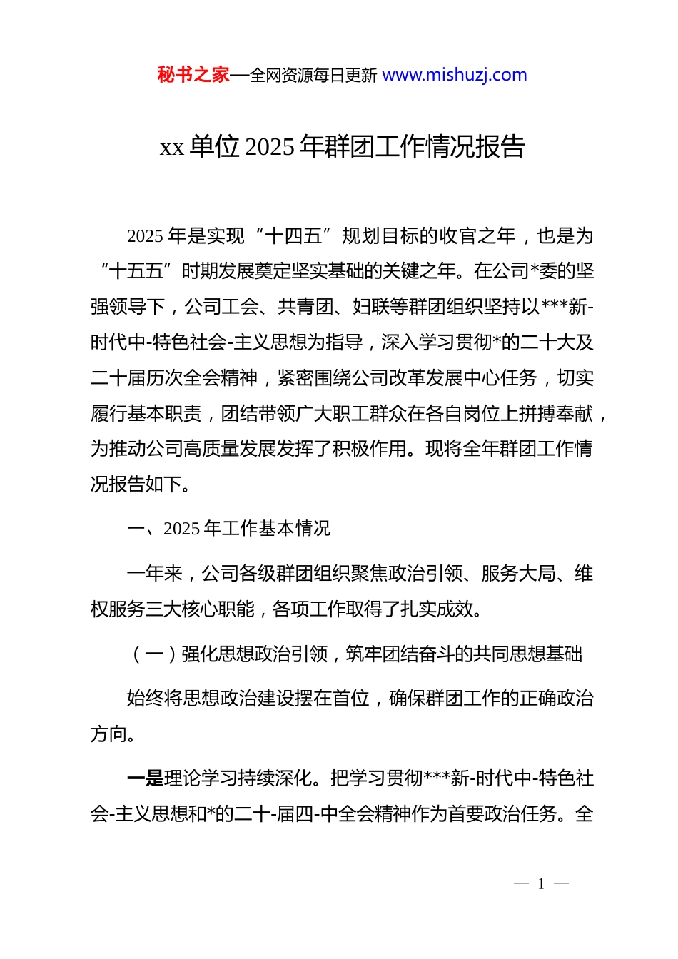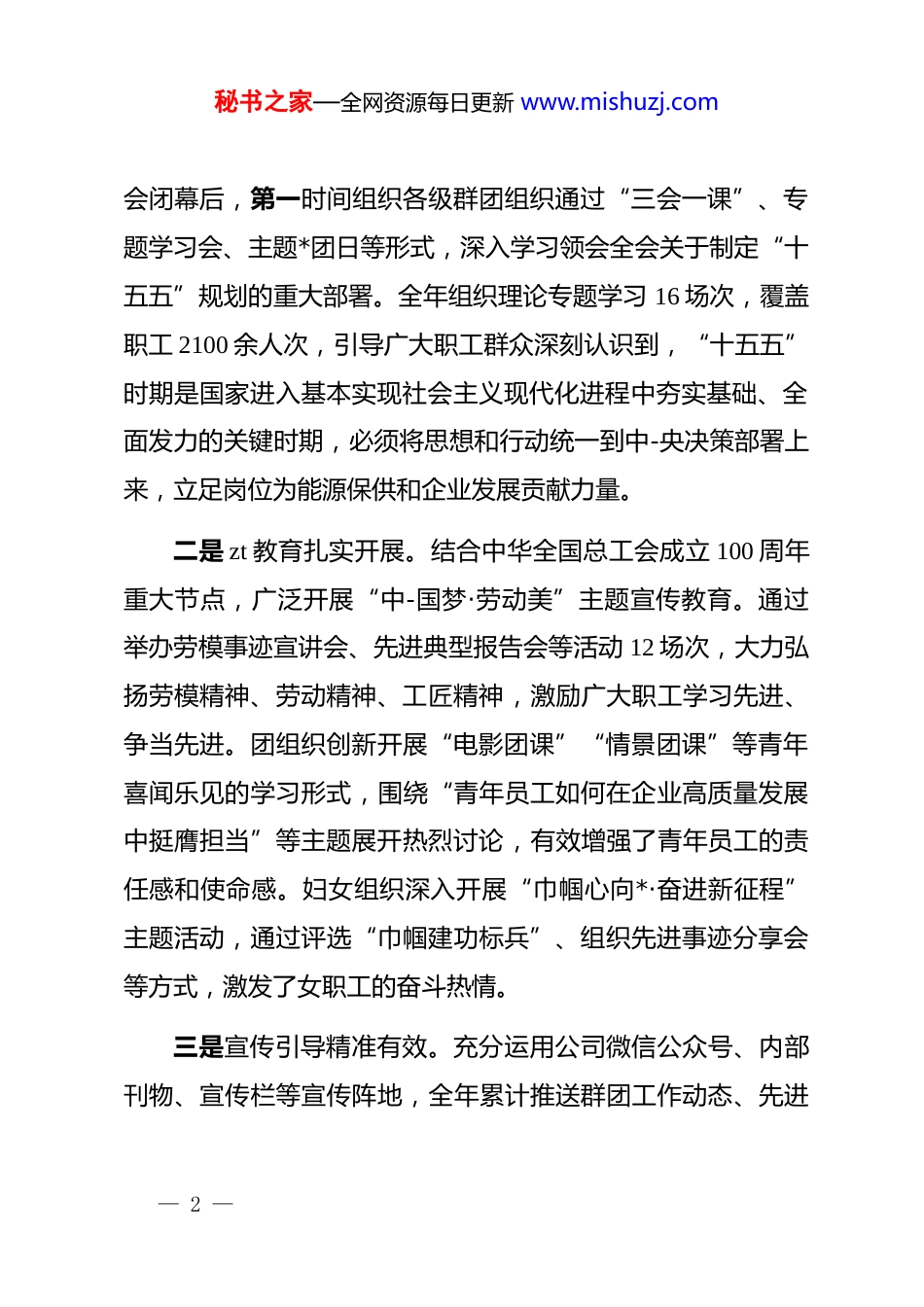 秘书之家—全网资源每日更新 www.mishuzj.comxx 单位 2025 年群团工作情况报告2025 年是实现“十四五”规划目标的收官之年,也是为“十五五”时期发展奠定坚实基础的关键之年。在公司*委的坚强领导下,公司工会、共青团、妇联等群团组织坚持以***新-时代中-特色社会-主义思想为指导,深入学习贯彻*的二十大及二十届历次全会精神,紧密围绕公司改革发展中心任务,切实履行基本职责,团结带领广大职工群众在各自岗位上拼搏奉献,为推动公司高质量发展发挥了积极作用。现将全年群团工作情况报告如下。一、2025 年工作基本情况一年来,公司各级群团组织聚焦政治引领、服务大局、维权服务三大核心职能,各项工作取得了扎实成效。(一)强化思想政治引领,筑牢团结奋斗的共同思想基础始终将思想政治建设摆在首位,确保群团工作的正确政治方向。一是理论学习持续深化。把学习贯彻***新-时代中-特色社会-主义思想和*的二十-届四-中全会精神作为首要政治任务。全— 1 —秘书之家—全网资源每日更新 www.mishuzj.com会闭幕后,第一时间组织各级群团组织通过“三会一课”、专题学习会、主题*团日等形式,深入学习领会全会关于制定“十五五”规划的重大部署。全年组织理论专题学习 16 场次,覆盖职工 2100 余人次,引导广大职工群众深刻认识到,“十五五”时期是国家进入基本实现社会主义现代化进程中夯实基础、全面发力的关键时期,必须将思想和行动统一到中-央决策部署上来,立足岗位为能源保供和企业发展贡献力量。二是 zt 教育扎实开展。结合中华全国总工会成立 100 周年重大节点,广泛开展“中-国梦·劳动美”主题宣传教育。通过举办劳模事迹宣讲会、先进典型报告会等活动 12 场次,大力弘扬劳模精神、劳动精神、工匠精神,激励广大职工学习先进、争当先进。团组织创新开展“电影团课”“情景团课”等青年喜闻乐见的学习形式,围绕“青年员工如何在企业高质量发展中挺膺担当”等主题展开热烈讨论,有效增强了青年员工的责任感和使命感。妇女组织深入开展“巾帼心向*·奋进新征程”主题活动,通过评选“巾帼建功标兵”、组织先进事迹分享会等方式,激发了女职工的奋斗热情。三是宣传引导精准有效。充分运用公司微信公众号、内部刊物、宣传栏等宣传阵地,全年累计推送群团工作动态、先进— 2 —秘书之家—全网资源每日更新 www.mishuzj.com典型事迹等信息 156 篇,制作专题展板 24 个,积极传播正能量,营造了崇尚劳动、锐意进取的良好企业文化氛围。(二)聚焦服务中心大局,汇聚推动高质量发展的强大合力紧紧围绕公司“提质增效、转型升级”的中心任务,组织动员广大职工群众在推动企业发展中建功立业。一是劳动和技能竞赛广泛开展。深入开展“建功新时代岗位作贡献”主题劳动竞赛,围绕成品油销售、非油品业务拓展、安全生产等关键领域,全年组织各类竞赛活动 16 场次,吸引了580 余名职工积极参与,评选出优秀团队 8 个、技能标兵 32 名。通过以赛促学、以赛促练,职工队伍的业务能力和综合素质得到显著提升。得益于此,公司在成品油调运组织和库存管理方面效率明显提高,精准营销策略得以有效执行。数据显示,2025 年一季度成品油销售量同比增长 3.2%,市场份额稳步提升,为完成全年经营目标打下了坚实基础。二是产业工人队伍建设改革持续深化。认真落实产业工人队伍建设改革要求,以提升职工技能素质为核心,构建了多层次、系统化的培训体系。全年组织加油员、油品检验员、安全— 3 —秘书之家—全网资源每日更新 www.mishuzj.com管理员等各类技能培训班 15 期,累计培训职工 860 人次。依托建立的 3 个劳模创新工作室,积极开展技术攻关和管理创新,共完成创新项目 7 项,其中“加油站智能化管理系统优化”项目获得了上级公司表彰,显著提升了运营效率。三是青年生力军作用充分发挥。积极引导青年员工在急难险重任务中冲锋在前。组建了 5 支青年突击队,在春节、国庆等油品保供关键时期,青年员工坚守岗位、连续作战,圆满完成了保供任务。深入开展“青年安全示范岗”创建活动,全年成功创建 8 个示范岗,有效提升了基层站库的安...