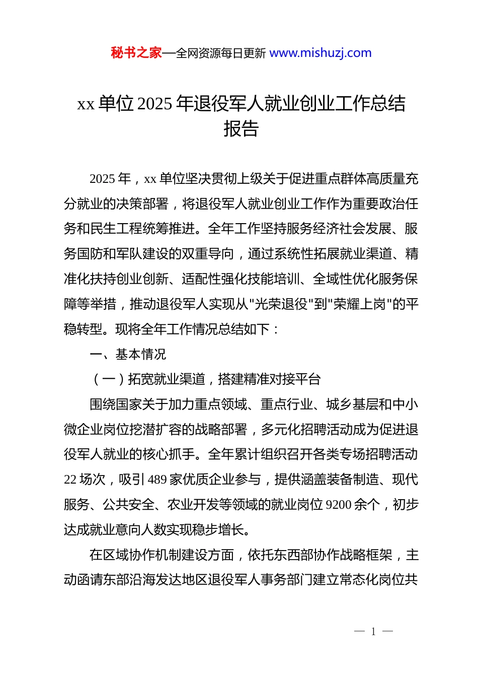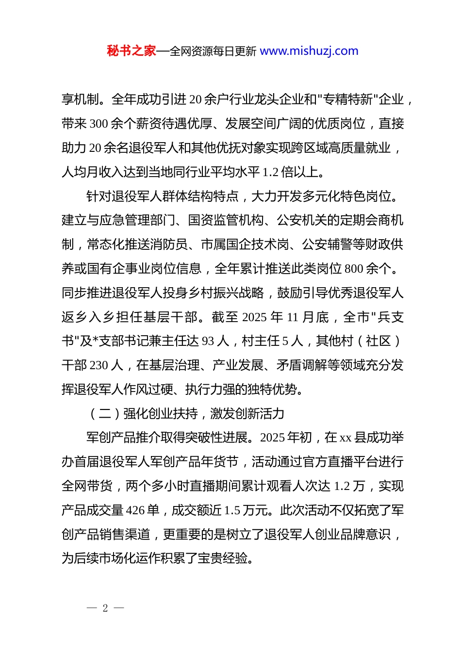 秘书之家—全网资源每日更新 www.mishuzj.comxx 单位 2025 年退役军人就业创业工作总结报告2025 年,xx 单位坚决贯彻上级关于促进重点群体高质量充分就业的决策部署,将退役军人就业创业工作作为重要政治任务和民生工程统筹推进。全年工作坚持服务经济社会发展、服务国防和军队建设的双重导向,通过系统性拓展就业渠道、精准化扶持创业创新、适配性强化技能培训、全域性优化服务保障等举措,推动退役军人实现从"光荣退役"到"荣耀上岗"的平稳转型。现将全年工作情况总结如下:一、基本情况(一)拓宽就业渠道,搭建精准对接平台围绕国家关于加力重点领域、重点行业、城乡基层和中小微企业岗位挖潜扩容的战略部署,多元化招聘活动成为促进退役军人就业的核心抓手。全年累计组织召开各类专场招聘活动22 场次,吸引 489 家优质企业参与,提供涵盖装备制造、现代服务、公共安全、农业开发等领域的就业岗位 9200 余个,初步达成就业意向人数实现稳步增长。在区域协作机制建设方面,依托东西部协作战略框架,主动函请东部沿海发达地区退役军人事务部门建立常态化岗位共— 1 —秘书之家—全网资源每日更新 www.mishuzj.com享机制。全年成功引进 20 余户行业龙头企业和"专精特新"企业,带来 300 余个薪资待遇优厚、发展空间广阔的优质岗位,直接助力 20 余名退役军人和其他优抚对象实现跨区域高质量就业,人均月收入达到当地同行业平均水平 1.2 倍以上。针对退役军人群体结构特点,大力开发多元化特色岗位。建立与应急管理部门、国资监管机构、公安机关的定期会商机制,常态化推送消防员、市属国企技术岗、公安辅警等财政供养或国有企事业岗位信息,全年累计推送此类岗位 800 余个。同步推进退役军人投身乡村振兴战略,鼓励引导优秀退役军人返乡入乡担任基层干部。截至 2025 年 11 月底,全市"兵支书"及*支部书记兼主任达 93 人,村主任 5 人,其他村(社区)干部 230 人,在基层治理、产业发展、矛盾调解等领域充分发挥退役军人作风过硬、执行力强的独特优势。(二)强化创业扶持,激发创新活力军创产品推介取得突破性进展。2025 年初,在 xx 县成功举办首届退役军人军创产品年货节,活动通过官方直播平台进行全网带货,两个多小时直播期间累计观看人次达 1.2 万,实现产品成交量 426 单,成交额近 1.5 万元。此次活动不仅拓宽了军创产品销售渠道,更重要的是树立了退役军人创业品牌意识,为后续市场化运作积累了宝贵经验。— 2 —秘书之家—全网资源每日更新 www.mishuzj.com创业金融支持体系持续完善。加强与国有商业银行、地方农村金融机构的战略合作,优化退役军人创业担保贷款审批流程,降低反担保门槛。全年累计发放创业担保贴息贷款 550 万元,惠及退役军人创业项目 37 个,贷款额度和受益面较 2024年分别增长 22%和 18%,有效缓解了初创期资金压力。先进典型示范引领作用显著增强。开展"最美退役军人""退役军人创业达人"等选树活动,深入挖掘返乡创业、科技攻关、乡村振兴等领域的退役军人典型。通过主流媒体宣传、事迹报告会、创业沙龙等形式,营造全社会尊重退役军人、支持退役军人创业创新的浓厚氛围。截至目前,全市退役军人创办企业共计 353 家,其中小微型企业 140 家、农民专业合作社 198 家、家庭农场 15 家,军创企业累计带动就业 3470 人,其中吸纳退役军人就业 310 人,创业带动就业的倍增效应初步显现。(三)加强技能培训,提升就业竞争能力职业技能培训精准度实现新提升。全市退役军人事务系统紧贴产业转型和市场需求,引导培训机构动态调整课程设置,重点开设无人机操作、跨境电商、新能源汽车维修、智慧农业管理等新兴领域适配性课程。培训课程从传统电工、焊工向数字化、智能化方向延伸,培训层次从初级工向中高级工拓展,极大提升了退役军人在新兴领域的就业竞争力。全年组织退役— 3 —秘书之家—全网资源每日更新 www.mishuzj.com军人参加各类职业技能培训 220 人,培训后实现稳定就业 45 人,就业转化率达到 20.5%,较 2024 年提升 4.3 个百分点。培训模式创新取得实质性进展...