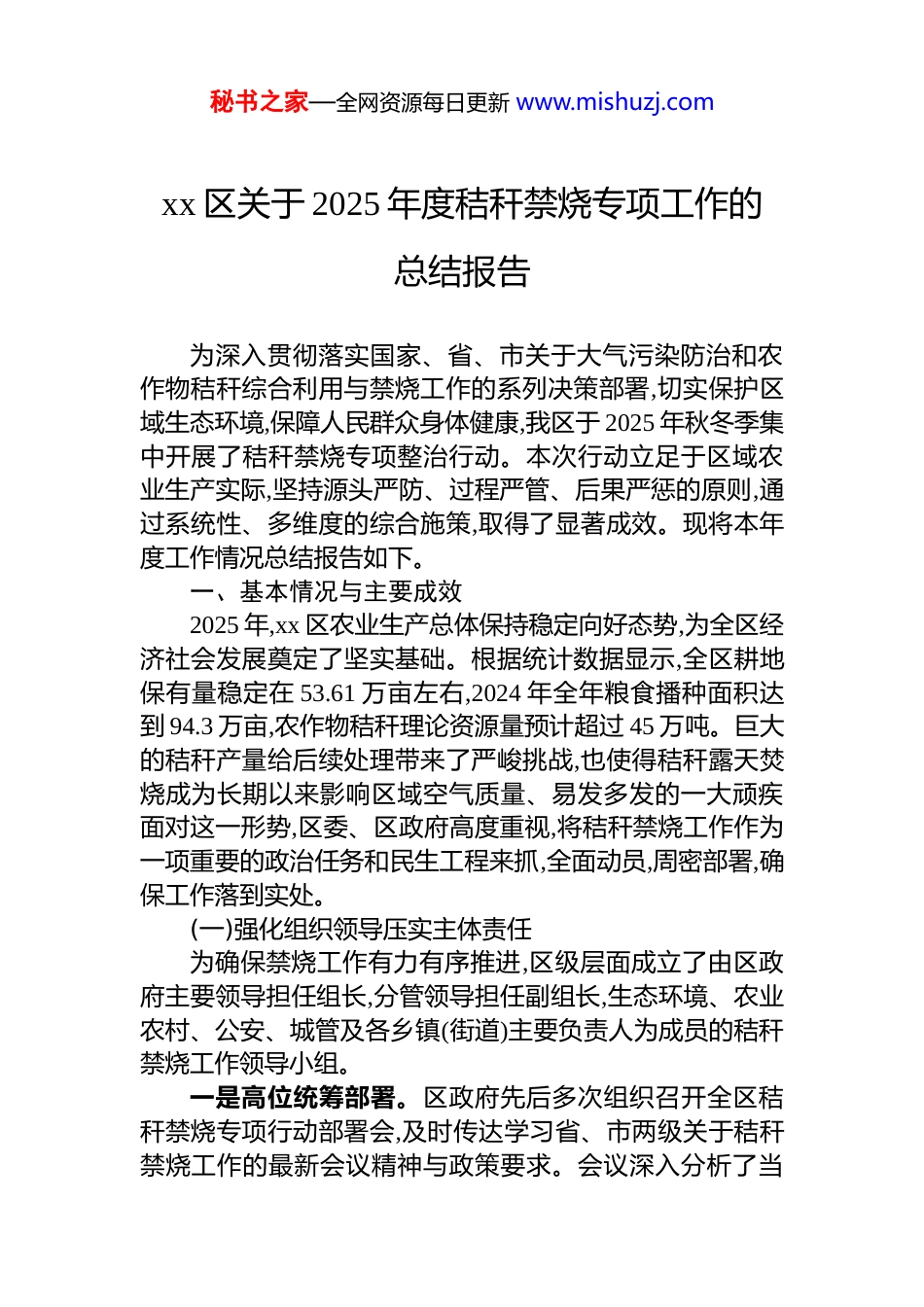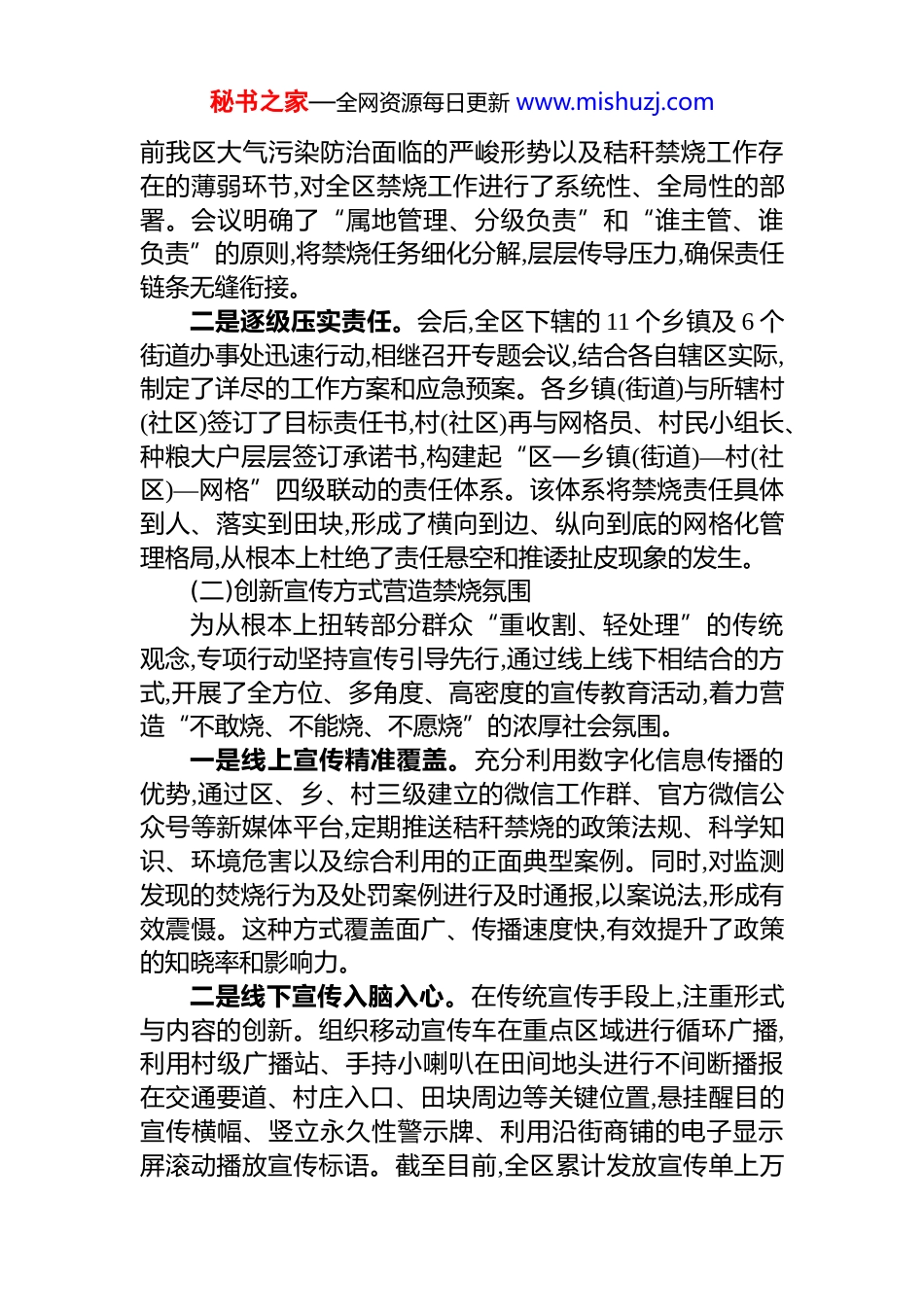 秘书之家—全网资源每日更新 www.mishuzj.comxx 区关于 2025 年度秸秆禁烧专项工作的总结报告为深入贯彻落实国家、省、市关于大气污染防治和农作物秸秆综合利用与禁烧工作的系列决策部署,切实保护区域生态环境,保障人民群众身体健康,我区于 2025 年秋冬季集中开展了秸秆禁烧专项整治行动。本次行动立足于区域农业生产实际,坚持源头严防、过程严管、后果严惩的原则,通过系统性、多维度的综合施策,取得了显著成效。现将本年度工作情况总结报告如下。一、基本情况与主要成效2025 年,xx 区农业生产总体保持稳定向好态势,为全区经济社会发展奠定了坚实基础。根据统计数据显示,全区耕地保有量稳定在 53.61 万亩左右,2024 年全年粮食播种面积达到 94.3 万亩,农作物秸秆理论资源量预计超过 45 万吨。巨大的秸秆产量给后续处理带来了严峻挑战,也使得秸秆露天焚烧成为长期以来影响区域空气质量、易发多发的一大顽疾面对这一形势,区委、区政府高度重视,将秸秆禁烧工作作为一项重要的政治任务和民生工程来抓,全面动员,周密部署,确保工作落到实处。(一)强化组织领导压实主体责任为确保禁烧工作有力有序推进,区级层面成立了由区政府主要领导担任组长,分管领导担任副组长,生态环境、农业农村、公安、城管及各乡镇(街道)主要负责人为成员的秸秆禁烧工作领导小组。一是高位统筹部署。区政府先后多次组织召开全区秸秆禁烧专项行动部署会,及时传达学习省、市两级关于秸秆禁烧工作的最新会议精神与政策要求。会议深入分析了当秘书之家—全网资源每日更新 www.mishuzj.com前我区大气污染防治面临的严峻形势以及秸秆禁烧工作存在的薄弱环节,对全区禁烧工作进行了系统性、全局性的部署。会议明确了“属地管理、分级负责”和“谁主管、谁负责”的原则,将禁烧任务细化分解,层层传导压力,确保责任链条无缝衔接。二是逐级压实责任。会后,全区下辖的 11 个乡镇及 6 个街道办事处迅速行动,相继召开专题会议,结合各自辖区实际,制定了详尽的工作方案和应急预案。各乡镇(街道)与所辖村(社区)签订了目标责任书,村(社区)再与网格员、村民小组长、种粮大户层层签订承诺书,构建起“区—乡镇(街道)—村(社区)—网格”四级联动的责任体系。该体系将禁烧责任具体到人、落实到田块,形成了横向到边、纵向到底的网格化管理格局,从根本上杜绝了责任悬空和推诿扯皮现象的发生。(二)创新宣传方式营造禁烧氛围为从根本上扭转部分群众“重收割、轻处理”的传统观念,专项行动坚持宣传引导先行,通过线上线下相结合的方式,开展了全方位、多角度、高密度的宣传教育活动,着力营造“不敢烧、不能烧、不愿烧”的浓厚社会氛围。一是线上宣传精准覆盖。充分利用数字化信息传播的优势,通过区、乡、村三级建立的微信工作群、官方微信公众号等新媒体平台,定期推送秸秆禁烧的政策法规、科学知识、环境危害以及综合利用的正面典型案例。同时,对监测发现的焚烧行为及处罚案例进行及时通报,以案说法,形成有效震慑。这种方式覆盖面广、传播速度快,有效提升了政策的知晓率和影响力。二是线下宣传入脑入心。在传统宣传手段上,注重形式与内容的创新。组织移动宣传车在重点区域进行循环广播,利用村级广播站、手持小喇叭在田间地头进行不间断播报在交通要道、村庄入口、田块周边等关键位置,悬挂醒目的宣传横幅、竖立永久性警示牌、利用沿街商铺的电子显示屏滚动播放宣传标语。截至目前,全区累计发放宣传单上万秘书之家—全网资源每日更新 www.mishuzj.com份,悬挂横幅 100 余条,竖立警示牌 50 余个。此外,还组织了由乡镇干部、村干部、网格员组成的宣传小分队,深入田间地头,与农户面对面交流,发放禁烧倡议书,耐心讲解焚烧秸秆的危害和所需承担的法律责任,引导农户自觉参与到禁烧行动中来。(三)构建巡查网络实现全域管控建立一套高效灵敏的巡查监控体系是确保禁烧工作取得实效的关键。我区整合多方力量,创新工作方法,构建了“人防+技防”、“网格化+铁脚板”的立体化巡查监管体系,实现了对辖区重点区域的全天候、全覆盖、无死角监控。一是强化地面人防巡查。整合区、乡、村三级干部及专职网格员、村民组长、*员志愿者等力量,组建了...
