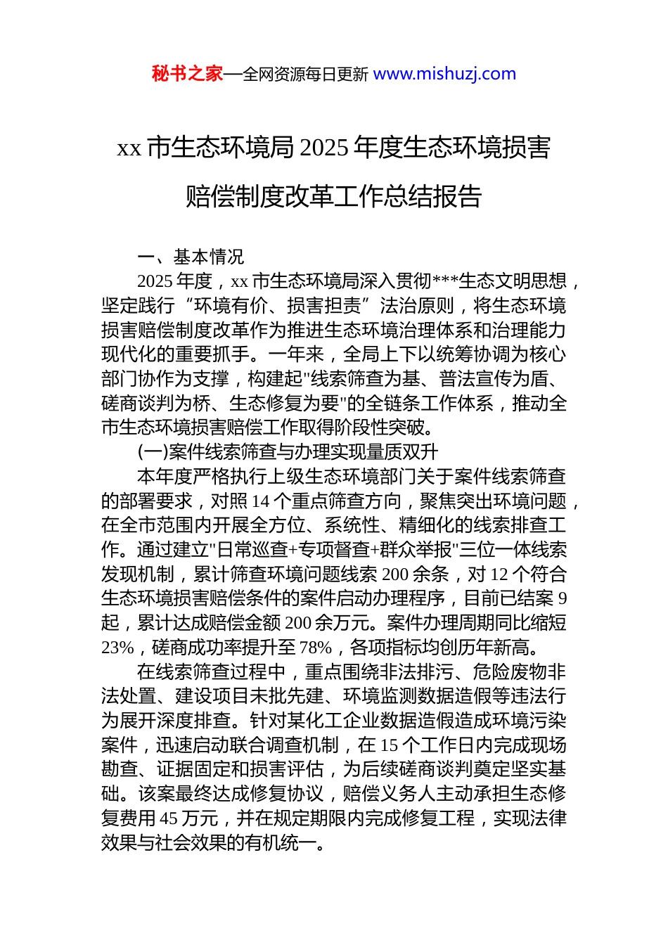 秘书之家—全网资源每日更新 www.mishuzj.comxx 市生态环境局 2025 年度生态环境损害赔偿制度改革工作总结报告一、基本情况2025 年度,xx 市生态环境局深入贯彻***生态文明思想,坚定践行“环境有价、损害担责”法治原则,将生态环境损害赔偿制度改革作为推进生态环境治理体系和治理能力现代化的重要抓手。一年来,全局上下以统筹协调为核心部门协作为支撑,构建起"线索筛查为基、普法宣传为盾、磋商谈判为桥、生态修复为要"的全链条工作体系,推动全市生态环境损害赔偿工作取得阶段性突破。(一)案件线索筛查与办理实现量质双升本年度严格执行上级生态环境部门关于案件线索筛查的部署要求,对照 14 个重点筛查方向,聚焦突出环境问题,在全市范围内开展全方位、系统性、精细化的线索排查工作。通过建立"日常巡查+专项督查+群众举报"三位一体线索发现机制,累计筛查环境问题线索 200 余条,对 12 个符合生态环境损害赔偿条件的案件启动办理程序,目前已结案 9起,累计达成赔偿金额 200 余万元。案件办理周期同比缩短23%,磋商成功率提升至 78%,各项指标均创历年新高。在线索筛查过程中,重点围绕非法排污、危险废物非法处置、建设项目未批先建、环境监测数据造假等违法行为展开深度排查。针对某化工企业数据造假造成环境污染案件,迅速启动联合调查机制,在 15 个工作日内完成现场勘查、证据固定和损害评估,为后续磋商谈判奠定坚实基础。该案最终达成修复协议,赔偿义务人主动承担生态修复费用 45 万元,并在规定期限内完成修复工程,实现法律效果与社会效果的有机统一。秘书之家—全网资源每日更新 www.mishuzj.com(二)法治宣传体系构建与精准普法将"谁执法谁普法"要求贯穿线索筛查、磋商谈判、司法保障全流程,创新构建多层次、立体化法治宣传格局。全年组织专题培训 12 场次,覆盖执法人员 340 人次,企业环保负责人 560 人次。通过案例警示、流程解读、公众参与等形式,结合现场执法指导、典型案例研讨等活动,精准普及《生态环境损害赔偿管理规定》核心要义与主要条款。重点打造"三个一"普法工程:编制《企业生态环境损害赔偿合规手册》3000 册,发放至重点监管企业;制作典型案例警示教育片 5 部,在政务新媒体平台播放量突破 10 万次;开展"生态环境损害赔偿进企业"巡回宣讲活动 20 场,实现化工、建材、电力等重点行业全覆盖。通过持续宣传引导企业主动报告环境违法行为数量同比上升 35%,生态环境损害赔偿社会认知度显著提升。(三)磋商机制创新与修复优先原则坚持执法与赔偿工作协同推进,发现案件线索后第一时间联合执法人员与涉事企业开展沟通对接。建立"分类施策、梯度激励"磋商机制,对积极履行修复义务的企业,依法依规给予从轻、减轻或免予处罚。2025 年度办结的 9 起案件中,通过磋商方式成功结案 7 起,占比达 78%,磋商平均周期控制在 30 个工作日内。在某建材企业非法倾倒固废案件中,创新采用"先行修复、同步磋商"模式,引导企业在责任认定阶段即启动生态修复,提前完成污染场地清理和植被恢复。鉴于企业主动担责、修复及时,最终依法减轻行政处罚,该案成为全省生态环境损害赔偿"修复优先"原则的示范性案例。全年通过磋商机制推动生态修复项目实施 6 个,修复污染土壤面积8.5 万平方米,清理固体废物 12.3 万吨,生态功能恢复率达到 85%以上。(四)多部门协同联动与共治格局建立健全生态环境、公安、检察、法院等部门常态化秘书之家—全网资源每日更新 www.mishuzj.com联络与案件会商联动机制,针对赔偿工作实践中遇到的难点问题共同探索解决路径。全年召开专题联席会议 8 次,联合培训 4 场次,联合办案 6 起,形成"各尽其责、协同发力"的共治格局。通过与检察机关、公安机关联合办案,成功追诉破坏环境犯罪人员 8 名,追缴赔偿款 100 余万元。在某跨流域水污染事件中,生态环境部门负责损害评估,公安机关同步介入调查取证,检察机关提前参与法律适用指导,法院开通绿色通道优先审理,各部门在 20 个工作日内完成案件移送、证据转换和法律衔接,实现行政责任、刑事责任、民事责任"三位一体"同...