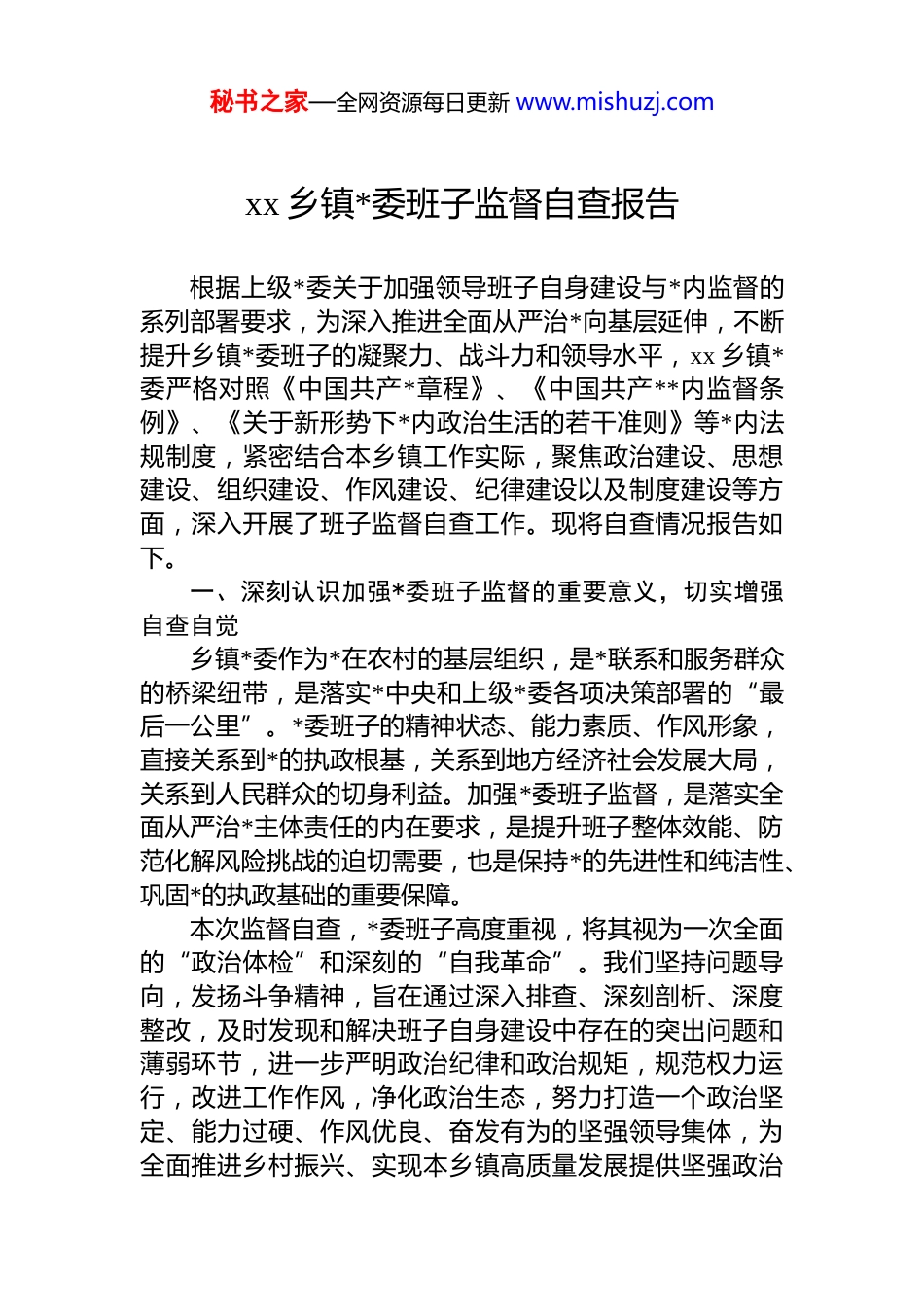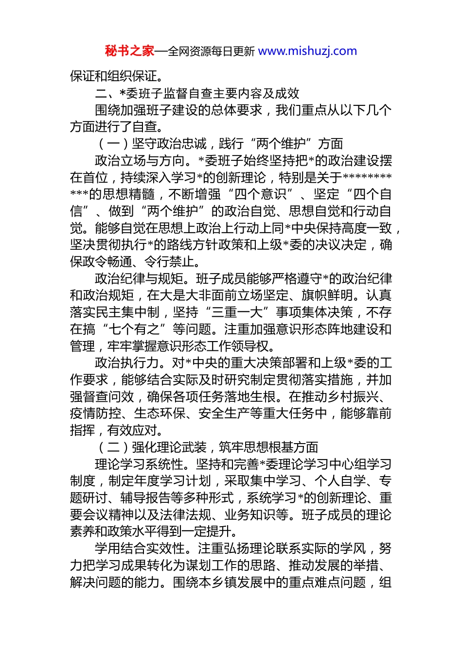秘书之家—全网资源每日更新 www.mishuzj.comxx 乡镇*委班子监督自查报告根据上级*委关于加强领导班子自身建设与*内监督的系列部署要求,为深入推进全面从严治*向基层延伸,不断提升乡镇*委班子的凝聚力、战斗力和领导水平,xx 乡镇*委严格对照《中国共产*章程》、《中国共产**内监督条例》、《关于新形势下*内政治生活的若干准则》等*内法规制度,紧密结合本乡镇工作实际,聚焦政治建设、思想建设、组织建设、作风建设、纪律建设以及制度建设等方面,深入开展了班子监督自查工作。现将自查情况报告如下。一、深刻认识加强*委班子监督的重要意义,切实增强自查自觉乡镇*委作为*在农村的基层组织,是*联系和服务群众的桥梁纽带,是落实*中央和上级*委各项决策部署的“最后一公里”。*委班子的精神状态、能力素质、作风形象,直接关系到*的执政根基,关系到地方经济社会发展大局,关系到人民群众的切身利益。加强*委班子监督,是落实全面从严治*主体责任的内在要求,是提升班子整体效能、防范化解风险挑战的迫切需要,也是保持*的先进性和纯洁性、巩固*的执政基础的重要保障。本次监督自查,*委班子高度重视,将其视为一次全面的“政治体检”和深刻的“自我革命”。我们坚持问题导向,发扬斗争精神,旨在通过深入排查、深刻剖析、深度整改,及时发现和解决班子自身建设中存在的突出问题和薄弱环节,进一步严明政治纪律和政治规矩,规范权力运行,改进工作作风,净化政治生态,努力打造一个政治坚定、能力过硬、作风优良、奋发有为的坚强领导集体,为全面推进乡村振兴、实现本乡镇高质量发展提供坚强政治秘书之家—全网资源每日更新 www.mishuzj.com保证和组织保证。二、*委班子监督自查主要内容及成效围绕加强班子建设的总体要求,我们重点从以下几个方面进行了自查。(一)坚守政治忠诚,践行“两个维护”方面政治立场与方向。*委班子始终坚持把*的政治建设摆在首位,持续深入学习*的创新理论,特别是关于***********的思想精髓,不断增强“四个意识”、坚定“四个自信”、做到“两个维护”的政治自觉、思想自觉和行动自觉。能够自觉在思想上政治上行动上同*中央保持高度一致,坚决贯彻执行*的路线方针政策和上级*委的决议决定,确保政令畅通、令行禁止。政治纪律与规矩。班子成员能够严格遵守*的政治纪律和政治规矩,在大是大非面前立场坚定、旗帜鲜明。认真落实民主集中制,坚持“三重一大”事项集体决策,不存在搞“七个有之”等问题。注重加强意识形态阵地建设和管理,牢牢掌握意识形态工作领导权。政治执行力。对*中央的重大决策部署和上级*委的工作要求,能够结合实际及时研究制定贯彻落实措施,并加强督查问效,确保各项任务落地生根。在推动乡村振兴、疫情防控、生态环保、安全生产等重大任务中,能够靠前指挥,有效应对。(二)强化理论武装,筑牢思想根基方面理论学习系统性。坚持和完善*委理论学习中心组学习制度,制定年度学习计划,采取集中学习、个人自学、专题研讨、辅导报告等多种形式,系统学习*的创新理论、重要会议精神以及法律法规、业务知识等。班子成员的理论素养和政策水平得到一定提升。学用结合实效性。注重弘扬理论联系实际的学风,努力把学习成果转化为谋划工作的思路、推动发展的举措、解决问题的能力。围绕本乡镇发展中的重点难点问题,组秘书之家—全网资源每日更新 www.mishuzj.com织开展专题调研,形成了一批有价值的调研报告,为科学决策提供了参考。理想信念教育。常态化开展*史学习教育,利用本地红色资源进行革命传统教育,引导班子成员坚定理想信念,补足精神之“钙”。能够自觉践行社会主义核心价值观,带头弘扬新风正气。(三)贯彻民主集中制,严肃*内政治生活方面议事决策规则。修订完善了《xx 乡镇*委会议事规则》,明确了议事范围、程序和要求。坚持集体领导和个人分工负责相结合,凡属重大决策、重要干部任免、重大项目安排和大额度资金使用,均提交*委会集体讨论决定,“一把手”能够做到末位表态。*内政治生活质量。严格执行《关于新形势下*内政治生活的若干准则》,认真落实“三会一课”、民主生活会组织生活会、谈心谈话等制...