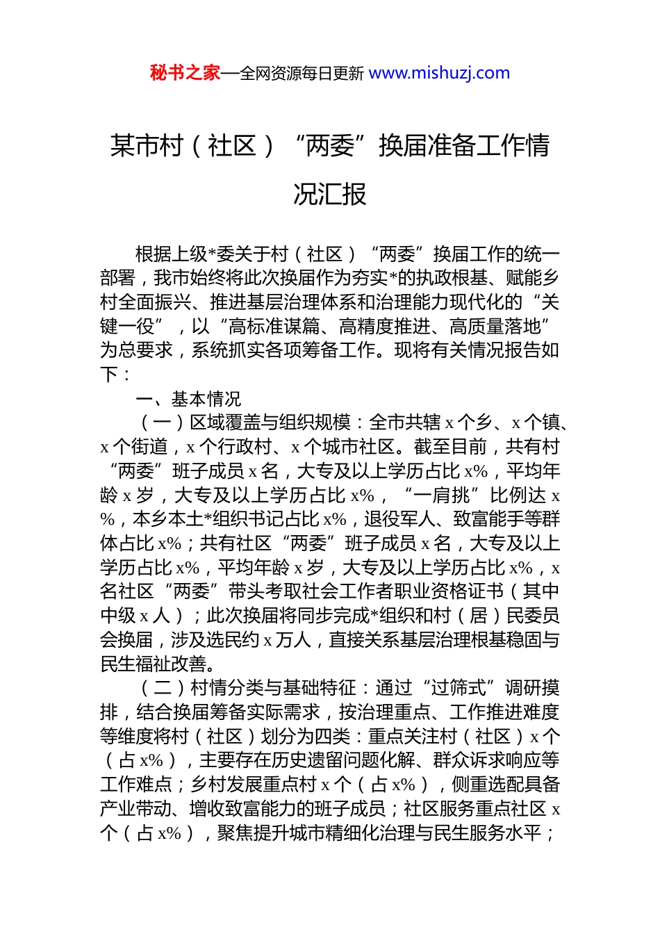 秘书之家—全网资源每日更新 www.mishuzj.com某市村(社区)“两委”换届准备工作情况汇报根据上级*委关于村(社区)“两委”换届工作的统一部署,我市始终将此次换届作为夯实*的执政根基、赋能乡村全面振兴、推进基层治理体系和治理能力现代化的“关键一役”,以“高标准谋篇、高精度推进、高质量落地”为总要求,系统抓实各项筹备工作。现将有关情况报告如下:一、基本情况(一)区域覆盖与组织规模:全市共辖 x 个乡、x 个镇、x 个街道,x 个行政村、x 个城市社区。截至目前,共有村“两委”班子成员 x 名,大专及以上学历占比 x%,平均年龄 x 岁,大专及以上学历占比 x%,“一肩挑”比例达 x%,本乡本土*组织书记占比 x%,退役军人、致富能手等群体占比 x%;共有社区“两委”班子成员 x 名,大专及以上学历占比 x%,平均年龄 x 岁,大专及以上学历占比 x%,x名社区“两委”带头考取社会工作者职业资格证书(其中中级 x 人);此次换届将同步完成*组织和村(居)民委员会换届,涉及选民约 x 万人,直接关系基层治理根基稳固与民生福祉改善。(二)村情分类与基础特征:通过“过筛式”调研摸排,结合换届筹备实际需求,按治理重点、工作推进难度等维度将村(社区)划分为四类:重点关注村(社区)x 个(占 x%),主要存在历史遗留问题化解、群众诉求响应等工作难点;乡村发展重点村 x 个(占 x%),侧重选配具备产业带动、增收致富能力的班子成员;社区服务重点社区 x个(占 x%),聚焦提升城市精细化治理与民生服务水平;秘书之家—全网资源每日更新 www.mishuzj.com常规治理村(社区)x 个(占 x%),现有班子运行规范、各项工作推进有序。二、准备工作进展情况(一)强化顶层设计,构建统筹推进体系。一是健全领导机制。第一时间成立由市委书记任组长、市长任第一副组长,组织、纪检、民政等部门主要负责同志为成员的换届工作领导小组,下设办公室(设在市委组织部)及业务指导、风气监督等 x 个专项工作组,细化 x 项具体职责清单,形成“市委统筹抓总、部门协同联动、专班具体推进”的组织架构,确保换届工作有人管、有人抓、有人督二是精准制定方案。前期组建 x 个调研组深入乡镇(街道)、村(社区)开展专题调研,收集梳理意见建议 x 条,起草《某市村(社区)“两委”换届选举工作实施意见(征求意见稿)》,面向市直相关部门、乡镇(街道)等层面广泛征求意见。同步配套编制《换届选举工作流程图》《操作规范手册》等 x 项指导性文件,明确 x 个关键环节,逐一明确完成时限、责任主体及操作要求,形成“一步一指引一环一负责”的工作规范。三是压实工作责任。市委常委会 x 次召开专题会议研究部署,将换届纳入县乡*委书记 dj述职评议核心内容。针对 x 个重点村(社区),联合纪检、政法、社工等部门专项研判,量身定制包含风险防控、人选储备等内容的攻坚方案,确保方案精准适配基层实际。(二)深化摸底研判,夯实换届工作基础。一是全面开展经济责任审计。由纪检、财政、农业农村等部门组建 x个审计组,对 x 个村(社区)“两委”主要负责人开展任期审计,重点核查集体“三资”管理、工程项目建设等 x 类事项,发现并整改财务不规范问题 x 个,追缴违规资金 x 万元,审计结果全部向群众公示,实现“清白离任、干净上任”二是精准排查风险隐患。构建“村级自查建账、乡镇联审核账、市级研判销账”三级闭环排查机制,明确村级每周自查、乡镇每半月联审、市级每月研判的工作节奏,重点秘书之家—全网资源每日更新 www.mishuzj.com围绕换届纪律执行、选举程序规范、群众思想动态、网络舆情导向等领域开展排查,累计梳理纪律类、稳定类、程序类、舆情类风险点 x 项,针对每项风险点明确责任单位、应对措施及化解时限,建立动态风险台账实行“销号管理”。三是深入掌握民意诉求。将“问计于民、问需于民”贯穿换届筹备全过程,通过“三必访三必谈”,组织市、乡、村三级干部下沉一线,采取“院坝会+入户聊+田间谈”等方式,覆盖 x%以上村(居)民小组,累计走访群众 x 万人次,召开座谈会 x 场,收...