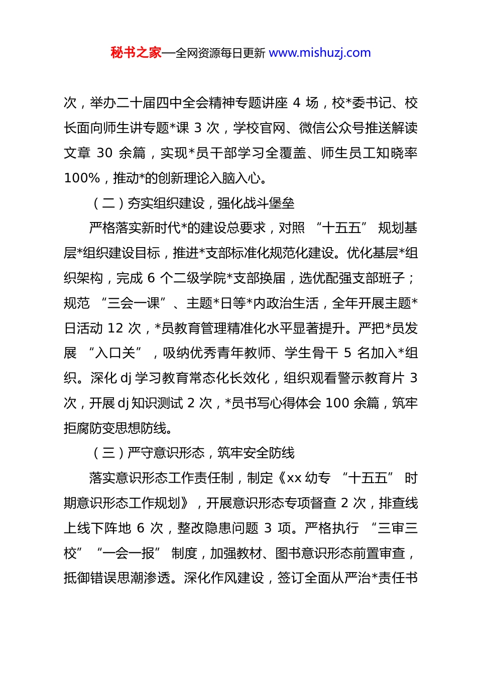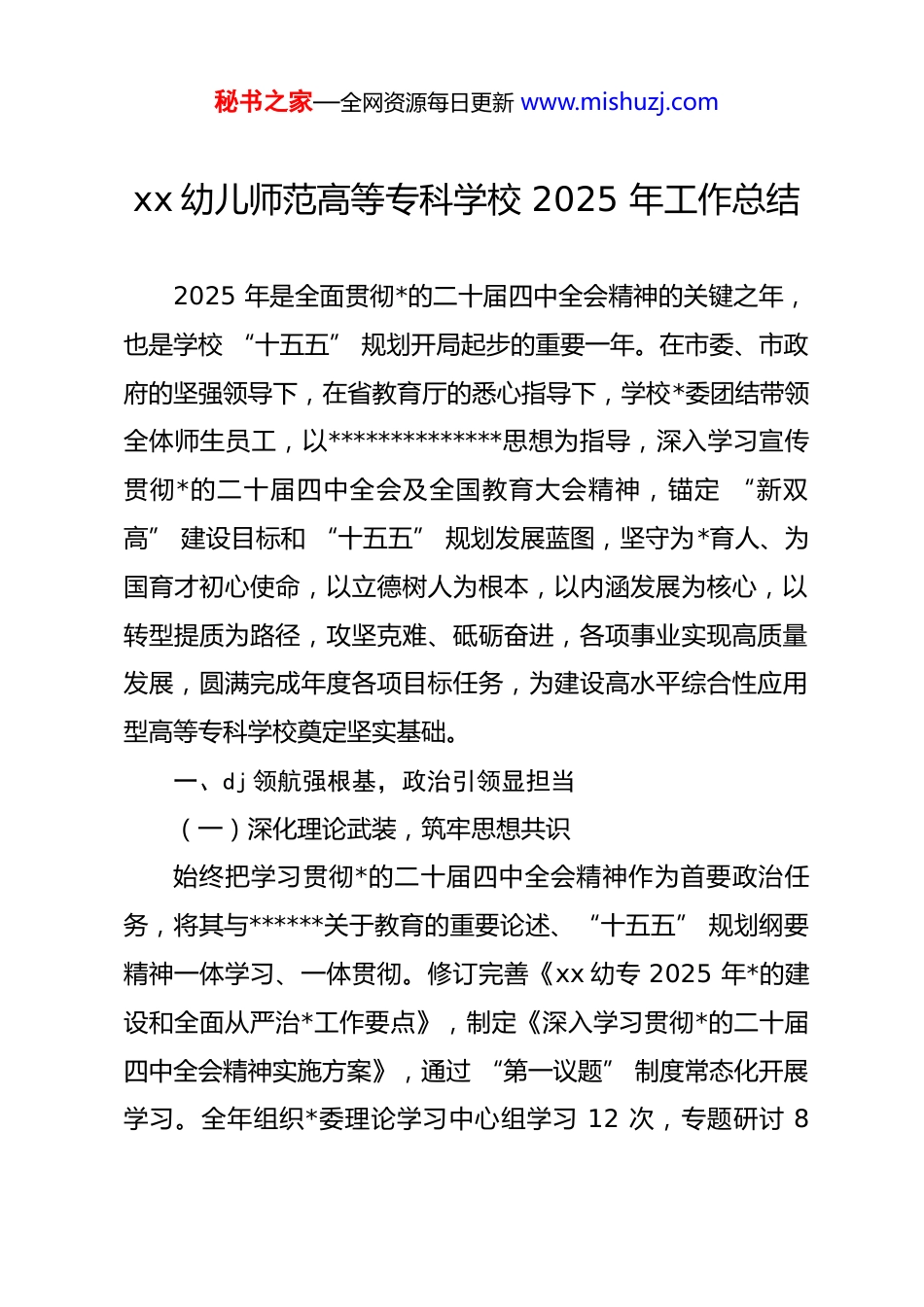 秘书之家—全网资源每日更新 www.mishuzj.comxx 幼儿师范高等专科学校 2025 年工作总结2025 年是全面贯彻*的二十届四中全会精神的关键之年,也是学校 “十五五” 规划开局起步的重要一年。在市委、市政府的坚强领导下,在省教育厅的悉心指导下,学校*委团结带领全体师生员工,以**************思想为指导,深入学习宣传贯彻*的二十届四中全会及全国教育大会精神,锚定 “新双高” 建设目标和 “十五五” 规划发展蓝图,坚守为*育人、为国育才初心使命,以立德树人为根本,以内涵发展为核心,以转型提质为路径,攻坚克难、砥砺奋进,各项事业实现高质量发展,圆满完成年度各项目标任务,为建设高水平综合性应用型高等专科学校奠定坚实基础。一、dj 领航强根基,政治引领显担当(一)深化理论武装,筑牢思想共识始终把学习贯彻*的二十届四中全会精神作为首要政治任务,将其与******关于教育的重要论述、“十五五” 规划纲要精神一体学习、一体贯彻。修订完善《xx 幼专 2025 年*的建设和全面从严治*工作要点》,制定《深入学习贯彻*的二十届四中全会精神实施方案》,通过 “第一议题” 制度常态化开展学习。全年组织*委理论学习中心组学习 12 次,专题研讨 8秘书之家—全网资源每日更新 www.mishuzj.com次,举办二十届四中全会精神专题讲座 4 场,校*委书记、校长面向师生讲专题*课 3 次,学校官网、微信公众号推送解读文章 30 余篇,实现*员干部学习全覆盖、师生员工知晓率100%,推动*的创新理论入脑入心。(二)夯实组织建设,强化战斗堡垒严格落实新时代*的建设总要求,对照 “十五五” 规划基层*组织建设目标,推进*支部标准化规范化建设。优化基层*组织架构,完成 6 个二级学院*支部换届,选优配强支部班子;规范 “三会一课”、主题*日等*内政治生活,全年开展主题*日活动 12 次,*员教育管理精准化水平显著提升。严把*员发展 “入口关”,吸纳优秀青年教师、学生骨干 5 名加入*组织。深化 dj 学习教育常态化长效化,组织观看警示教育片 3次,开展 dj 知识测试 2 次,*员书写心得体会 100 余篇,筑牢拒腐防变思想防线。(三)严守意识形态,筑牢安全防线落实意识形态工作责任制,制定《xx 幼专 “十五五” 时期意识形态工作规划》,开展意识形态专项督查 2 次,排查线上线下阵地 6 次,整改隐患问题 3 项。严格执行 “三审三校”“一会一报” 制度,加强教材、图书意识形态前置审查,抵御错误思潮渗透。深化作风建设,签订全面从严治*责任书秘书之家—全网资源每日更新 www.mishuzj.com80 份,开展廉政提醒 9 次,推送廉政信息 40 余条,组织测酒 8 次(150 人次),备案 “三重一大” 决策事项 35 个,营造风清气正的政治生态。(四)践行为民宗旨,服务社会发展紧扣 xx 区域经济社会发展需求,深化校地、校企合作。持续开展 “我为群众办实事” 实践活动,慰问帮扶村八里村困难群众,投入 8 万元完善村内基础设施;组织 “关爱残疾人”“社区志愿服务” 等活动 10 次,发动志愿者 600 余人次,服务时长超 100 小时。对接 xx 市幼教、康养产业发展需求,开展职业技能培训 12 期,培训各类人员 800 余人次,为地方产业发展注入人才动力。二、立德树人守初心,人才培养提质效(一)深化思政教育,铸魂育人成效显著以二十届四中全会精神为引领,完善 “大思政课” 育人体系,实施 “行走的思政课” 提质工程,组织学生走进 xx 市红色教育基地、政务服务中心开展实践教学 6 次。成功举办 “学思践悟二十大・青春建功十五五” 演讲比赛、“课程思政” 教学能力大赛等活动 15 场,2 个思政案例入选省级优秀案例,学校思政工作获省教育厅专项督查好评。落实 “13341” 学生工作模式,推进 “一站式” 学生社区建设,实现思政教育与日秘书之家—全网资源每日更新 www.mishuzj.com常管理深度融合。(二)优化专业布局,契合发展需求对照 “十五五” 规划学科专业建设目标,立足人口形势变化和区域产业需求,优化专业集群结构。在原有 20 个三年制专科、3 个五年制...