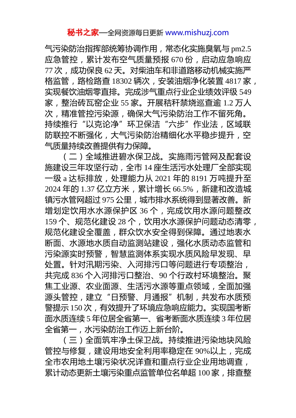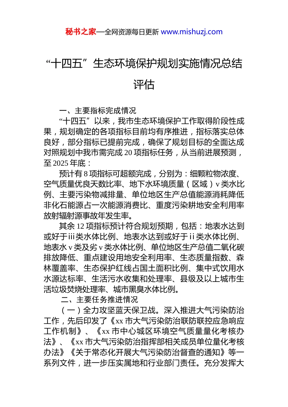 秘书之家—全网资源每日更新 www.mishuzj.com“十四五”生态环境保护规划实施情况总结评估一、主要指标完成情况“十四五”以来,我市生态环境保护工作取得阶段性成果,规划确定的各项指标目前均有序推进,指标落实总体良好,部分指标已提前完成,确保了规划目标的全面达成对照规划中我市需完成 20 项指标任务,从当前进展预测,至 2025 年底:预计有 8 项指标可超额完成,分别为:细颗粒物浓度、空气质量优良天数比率、地下水环境质量(区域)v 类水比例、主要污染物减排量、单位地区生产总值能源消耗降低非化石能源占一次能源消费比、重度污染耕地安全利用率放射辐射源事故年发生率。其余 12 项指标预计符合规划预期,包括:地表水达到或好于ⅲ类水体比例、地表水达到或好于ⅱ类水体比例、地表水 v 类及劣 v 类水体比例、单位地区生产总值二氧化碳排放降低、重点建设用地安全利用率、生态质量指数、森林覆盖率、生态保护红线占国土面积比例、集中式饮用水水源达标率、生活污水收集和处理率、县级及以上城市生活垃圾焚烧处理率、城市黑臭水体比例。 二、主要任务推进情况(一)全力攻坚蓝天保卫战。深入推进大气污染防治工作,先后印发了《xx 市大气污染防治联防联控应急响应工作机制》、《xx 市中心城区环境空气质量量化考核办法》、《xx 市大气污染防治指挥部相关成员单位量化考核办法》《关于常态化开展大气污染防治督查的通知》等一系列文件,进一步压实属地和行业部门责任。充分发挥大秘书之家—全网资源每日更新 www.mishuzj.com气污染防治指挥部统筹协调作用,常态化实施臭氧与 pm2.5应急管控,累计发布空气质量预报 670 份,启动应急响应77 次,成功保良 62 天。对柴油车和非道路移动机械实施严格监管,路检路查 18302 辆次,安装油烟净化装置 4817 家,实现餐饮油烟零直排。完成涉气重点行业企业绩效评级 549家,整治砖瓦窑企业 55 家。开展秸秆禁烧巡查逾 1.2 万人次,精准管控污染源,确保大气污染防治工作不留死角。持续推行“以克论净”环卫保洁“六步”作业法,区域联防联控不断强化,大气污染防治精细化水平稳步提升,空气质量持续改善提供有力保障。(二)全域推进碧水保卫战。实施雨污管网及配套设施建设三年攻坚行动,全市 14 座生活污水处理厂全部实现一级 a 达标排放,处理能力从 2021 年的 8191 万吨提升至2024 年的 1.37 亿立方米,累计增长 66.5%,新建和改造城镇污水管网超过 975 公里,城市排水系统得到显著改善。新增划定饮用水水源保护区 36 个,完成饮用水源问题整改159 个、规范化建设 28 个,饮用水水源保护问题动态清零,规范化建设全覆盖,群众饮水安全得到保障。通过地表水断面、水源地水质自动监测站建设,强化水质动态监管和污染源实时预警,智慧监测体系实现水质风险早发现、早处置。针对汛期污染、入河排污口等问题进行专项整治,共完成 836 个入河排污口整治、90 个行政村环境整治。聚焦工业源、农业面源、生活污水源等重点领域,全面加强源头管控,建立“日预警、月通报”机制,共发布水质预警提示 150 次,有效提升了环境应急响应能力。实现国考断面水质连续 5 年位居全省第一、省考断面水质连续 3 年位居全省第一,水污染防治工作迈上新台阶。(三)全面筑牢净土保卫战。持续推进污染地块风险管控与修复,建设用地安全利用率稳定在 90%以上,完成全市农用地土壤污染状况详查和重点行业企业用地调查,累计动态更新土壤污染重点监管单位名单超 100 家,排查整秘书之家—全网资源每日更新 www.mishuzj.com治耕地污染问题超 500 处,为土地安全利用筑牢根基。深入整治重金属污染物,涉镉等重金属隐患排查覆盖 24 家重点监管单位及高风险企业,从源头遏制重金属污染扩散。“无废城市”建设稳步推进,获批国家“无废城市”、国家废旧物资循环利用体系建设重点城市。建成农村污水处理设施 100 座,生活垃圾焚烧发电站日处理规模达 3700 吨且实现“零填埋”,废、医废年处置规模逐年提升,分别累计达 9 万吨、近 2 万吨,“无害化”处置率始终保持100%,彰显强大...