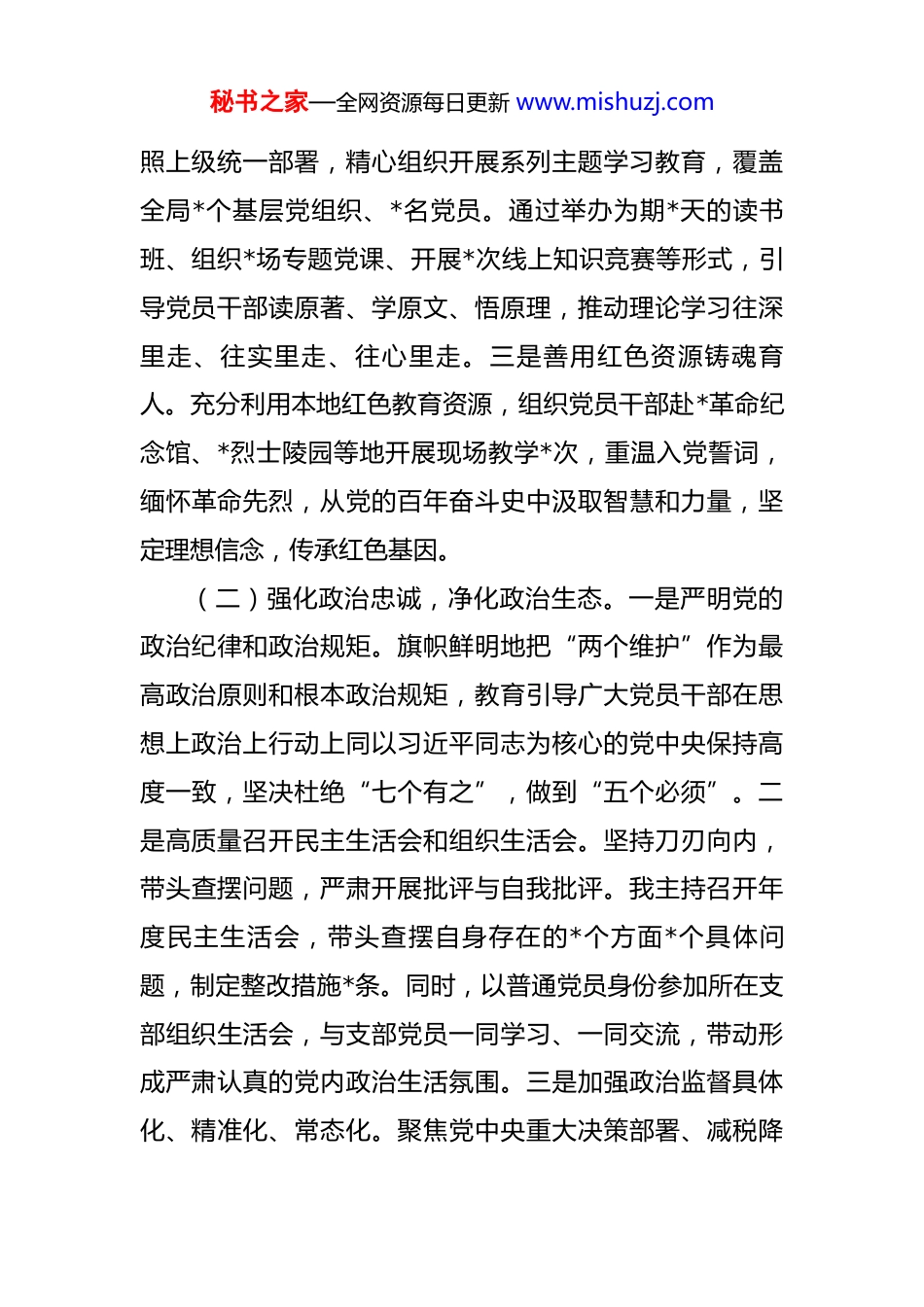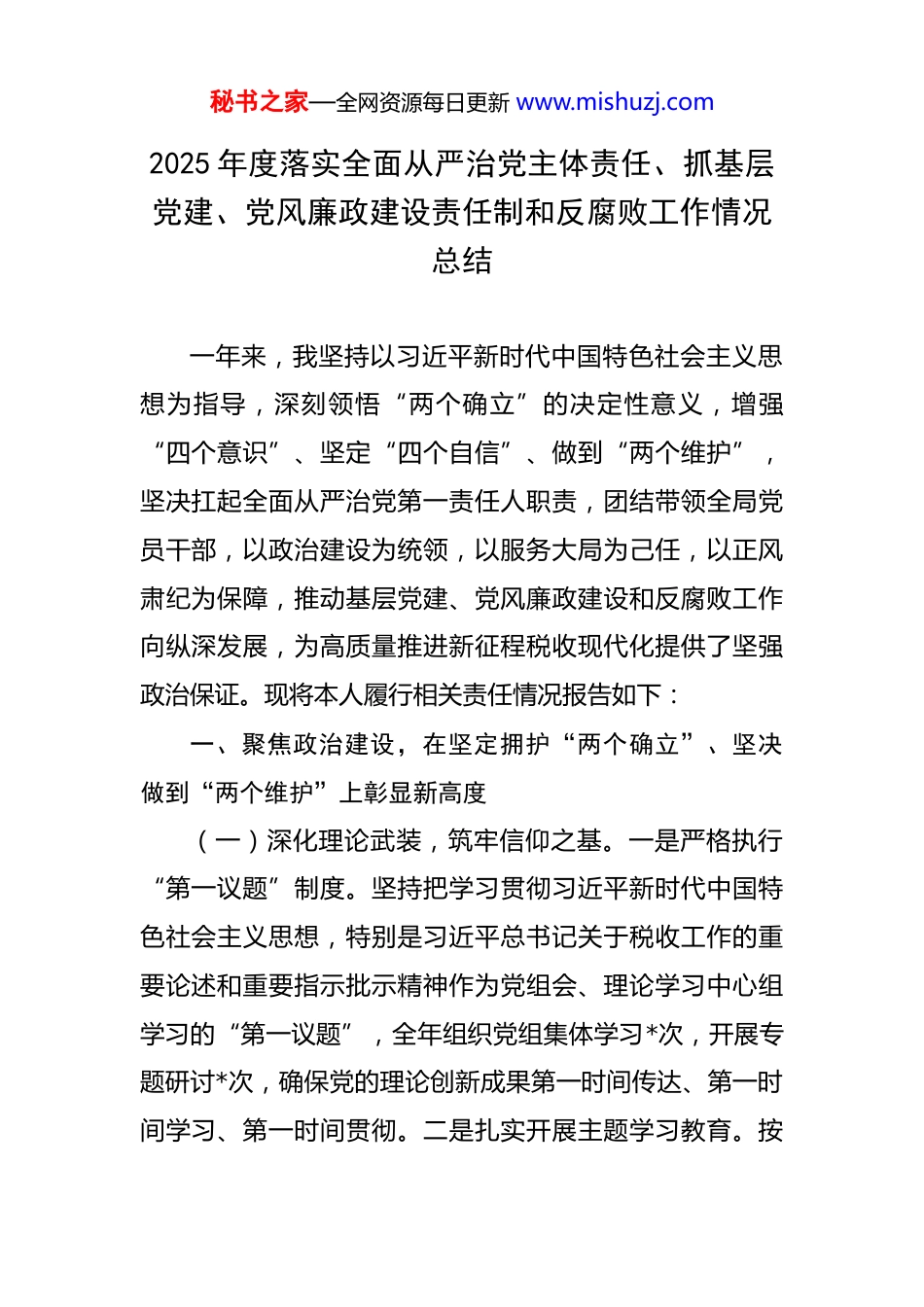 秘书之家—全网资源每日更新 www.mishuzj.com2025 年度落实全面从严治党主体责任、抓基层党建、党风廉政建设责任制和反腐败工作情况总结 一年来,我坚持以习近平新时代中国特色社会主义思想为指导,深刻领悟“两个确立”的决定性意义,增强“四个意识”、坚定“四个自信”、做到“两个维护”,坚决扛起全面从严治党第一责任人职责,团结带领全局党员干部,以政治建设为统领,以服务大局为己任,以正风肃纪为保障,推动基层党建、党风廉政建设和反腐败工作向纵深发展,为高质量推进新征程税收现代化提供了坚强政治保证。现将本人履行相关责任情况报告如下:一、聚焦政治建设,在坚定拥护“两个确立”、坚决做到“两个维护”上彰显新高度(一)深化理论武装,筑牢信仰之基。一是严格执行“第一议题”制度。坚持把学习贯彻习近平新时代中国特色社会主义思想,特别是习近平总书记关于税收工作的重要论述和重要指示批示精神作为党组会、理论学习中心组学习的“第一议题”,全年组织党组集体学习*次,开展专题研讨*次,确保党的理论创新成果第一时间传达、第一时间学习、第一时间贯彻。二是扎实开展主题学习教育。按秘书之家—全网资源每日更新 www.mishuzj.com照上级统一部署,精心组织开展系列主题学习教育,覆盖全局*个基层党组织、*名党员。通过举办为期*天的读书班、组织*场专题党课、开展*次线上知识竞赛等形式,引导党员干部读原著、学原文、悟原理,推动理论学习往深里走、往实里走、往心里走。三是善用红色资源铸魂育人。充分利用本地红色教育资源,组织党员干部赴*革命纪念馆、*烈士陵园等地开展现场教学*次,重温入党誓词,缅怀革命先烈,从党的百年奋斗史中汲取智慧和力量,坚定理想信念,传承红色基因。(二)强化政治忠诚,净化政治生态。一是严明党的政治纪律和政治规矩。旗帜鲜明地把“两个维护”作为最高政治原则和根本政治规矩,教育引导广大党员干部在思想上政治上行动上同以习近平同志为核心的党中央保持高度一致,坚决杜绝“七个有之”,做到“五个必须”。二是高质量召开民主生活会和组织生活会。坚持刀刃向内,带头查摆问题,严肃开展批评与自我批评。我主持召开年度民主生活会,带头查摆自身存在的*个方面*个具体问题,制定整改措施*条。同时,以普通党员身份参加所在支部组织生活会,与支部党员一同学习、一同交流,带动形成严肃认真的党内政治生活氛围。三是加强政治监督具体化、精准化、常态化。聚焦党中央重大决策部署、减税降秘书之家—全网资源每日更新 www.mishuzj.com费政策落实、优化营商环境等中心工作,组织开展专项政治监督*轮次,通过明察暗访、数据比对等方式,发现并推动整改问题*个,确保党中央政令畅通、令行禁止。(三)保障政令畅通,服务中心大局。一是主动融入国家发展战略。围绕服务区域协调发展、科技自立自强、绿色低碳转型等国家重大战略,我带队深入*家高新技术企业、*个省级重点项目开展调研,精准对接涉税需求,“一户一策”制定服务方案,以税收工作的实际成效服务“国之大者”。二是精准落实税费优惠政策。坚决扛起政策落实的政治责任,组织全局力量确保新的组合式税费支持政策等落地生根,建立“政策找人”精准推送机制,全年累计为*万户(次)纳税人缴费人办理减税降费及退税缓税缓费*亿元,政策红利直达快享,为稳定宏观经济大盘贡献了税务力量。三是全力服务地方经济社会发展。深化税收大数据应用,围绕产业链供应链、外贸出口等主题,形成高质量的税收分析报告*篇,为地方党委、政府科学决策提供了重要参考。持续深化“放管服”改革,牵头推出*项便民办税新举措,纳税人满意度测评得分达*分,持续位居全市前列。二、聚焦基层基础,在锻造坚强战斗堡垒、激发队伍活力上展现新作为秘书之家—全网资源每日更新 www.mishuzj.com(一)严肃组织生活,提升规范化水平。一是严格落实基本制度。带头执行“三会一课”、民主评议党员、谈心谈话等制度,全年为党员干部讲授专题党课*次,参加所在支部组织生活*次,与班子成员和基层干部谈心谈话*人次,及时掌握思想动态,推动党内组织生活严起来、实起来。二是创新主题党日活动形...