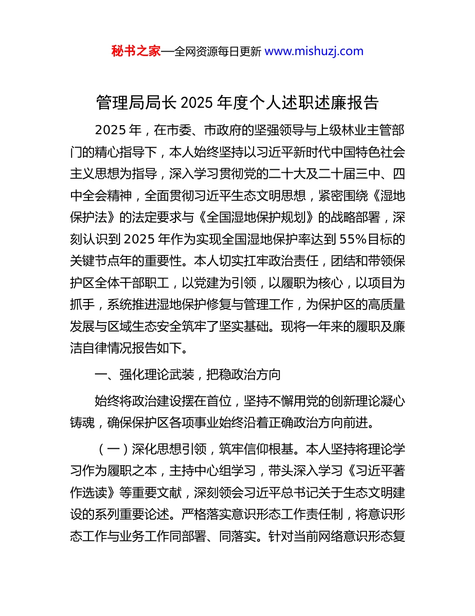 秘书之家—全网资源每日更新 www.mishuzj.com管理局局长 2025 年度个人述职述廉报告2025 年,在市委、市政府的坚强领导与上级林业主管部门的精心指导下,本人始终坚持以习近平新时代中国特色社会主义思想为指导,深入学习贯彻党的二十大及二十届三中、四中全会精神,全面贯彻习近平生态文明思想,紧密围绕《湿地保护法》的法定要求与《全国湿地保护规划》的战略部署,深刻认识到 2025 年作为实现全国湿地保护率达到 55%目标的关键节点年的重要性。本人切实扛牢政治责任,团结和带领保护区全体干部职工,以党建为引领,以履职为核心,以项目为抓手,系统推进湿地保护修复与管理工作,为保护区的高质量发展与区域生态安全筑牢了坚实基础。现将一年来的履职及廉洁自律情况报告如下。一、强化理论武装,把稳政治方向始终将政治建设摆在首位,坚持不懈用党的创新理论凝心铸魂,确保保护区各项事业始终沿着正确政治方向前进。(一)深化思想引领,筑牢信仰根基。本人坚持将理论学习作为履职之本,主持中心组学习,带头深入学习《习近平著作选读》等重要文献,深刻领会习近平总书记关于生态文明建设的系列重要论述。严格落实意识形态工作责任制,将意识形态工作与业务工作同部署、同落实。针对当前网络意识形态复秘书之家—全网资源每日更新 www.mishuzj.com杂形势,组织开展专项研判,加强对保护区网站、公众号等宣传阵地的管理,严格执行“三审三校”制度,确保了意识形态领域的绝对安全。通过举办“生态文明思想青年说”等活动,引导干部职工自觉做习近平生态文明思想的坚定信仰者、积极传播者和模范实践者。(二)夯实组织基础,激发队伍活力。以提升基层党组织政治功能和组织功能为重点,扎实推进党支部标准化、规范化建设。创新开展“党建+生态哨兵”活动,在候鸟迁徙关键廊道、核心栖息地设立党员先锋岗,将党小组建在巡护执法、项目建设、社区共建的第一线,推动党建工作与业务工作深度融合,实现党旗在一线高高飘扬。借鉴全国林业系统基层党组织建设的优秀经验,持续开展“一月一课一片一实践”主题党日活动,组织全体党员赴﹡﹡红色教育基地开展“锤炼党性修养守护绿水青山”主题教育,赴﹡﹡廉政教育基地接受警示教育,使党内政治生活真正“活”起来、“实”起来,队伍的凝聚力和战斗力显著增强。(三)严守纪律规矩,涵养清风正气。本人深刻认识到党风廉政建设的极端重要性,始终把纪律和规矩挺在前面。带头学习新修订的《中国共产党纪律处分条例》及中央、省、市纪委全会精神,主持召开全局党风廉政建设专题会议 2 次,部署年度工作任务。深入推进纠“四风”树新风,组织全体干部职工签订《廉洁从业承诺书》和《廉洁家风承诺书》,从源头秘书之家—全网资源每日更新 www.mishuzj.com上预防和杜绝违纪违法行为。本人严格执行领导干部个人有关事项报告制度,自觉净化社交圈、生活圈、朋友圈。在项目审批、资金拨付、物资采购等“三重一大”事项上,坚持集体决策、公开透明,主动接受组织和群众监督,坚决杜绝任何形式的以权谋私。一年来,全局未发生任何违纪违法案件。二、聚焦主责主业,提升履职效能以《湿地保护法》为准绳,以保护区核心职能为中心,全面提升湿地保护管理的能力与水平,确保各项法定职责履行到位。(一)构建立体巡护体系,执法监管“长牙带电”。为应对新形势下保护区面临的复杂挑战,牵头构建了“天空地人”一体化立体巡护网络。一是强化联合执法。二是严打违法行为。三是规范人类活动。(二)坚持问题导向,攻坚整改销号。坚持对生态环境问题“零容忍”,以最坚决的态度抓好各类问题的整改。一是高效完成遥感监测问题核查。二是系统整治区内违法违规活动。同时,全面落实《互花米草防治专项行动计划》要求。(三)深化科研监测,夯实保护根基。将科研监测作为科学保护的“眼睛”和“大脑”,为管理决策提供坚实数据支撑。一是生物多样性监测成果丰硕。二是科研合作与成果转化水平提升。三是野生动物救护能力持续增强。秘书之家—全网资源每日更新 www.mishuzj.com三、狠抓项目驱动,增强发展后劲牢固树立“项目为王”理念,积极对接国家生态...