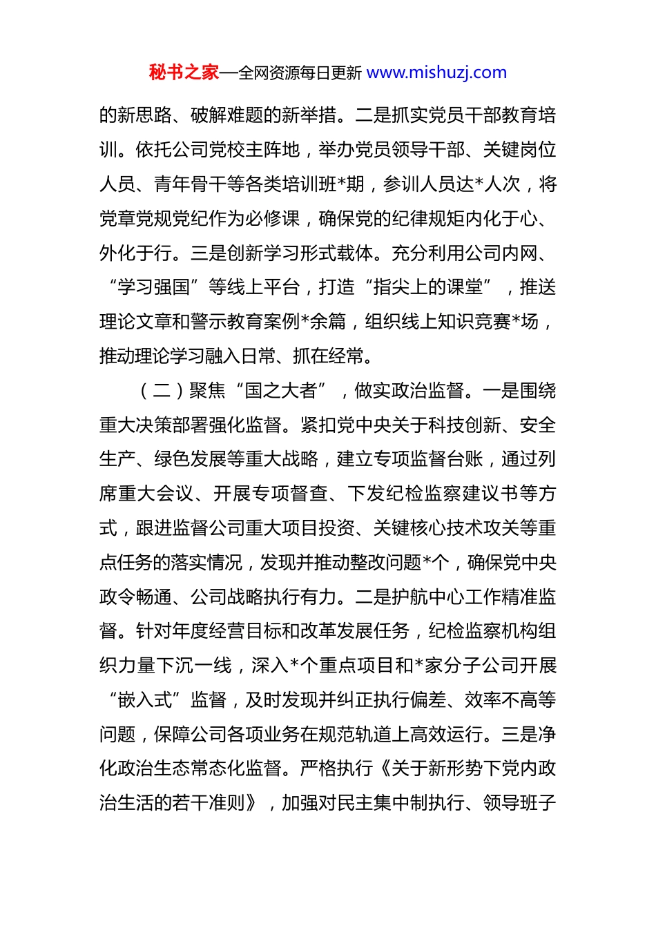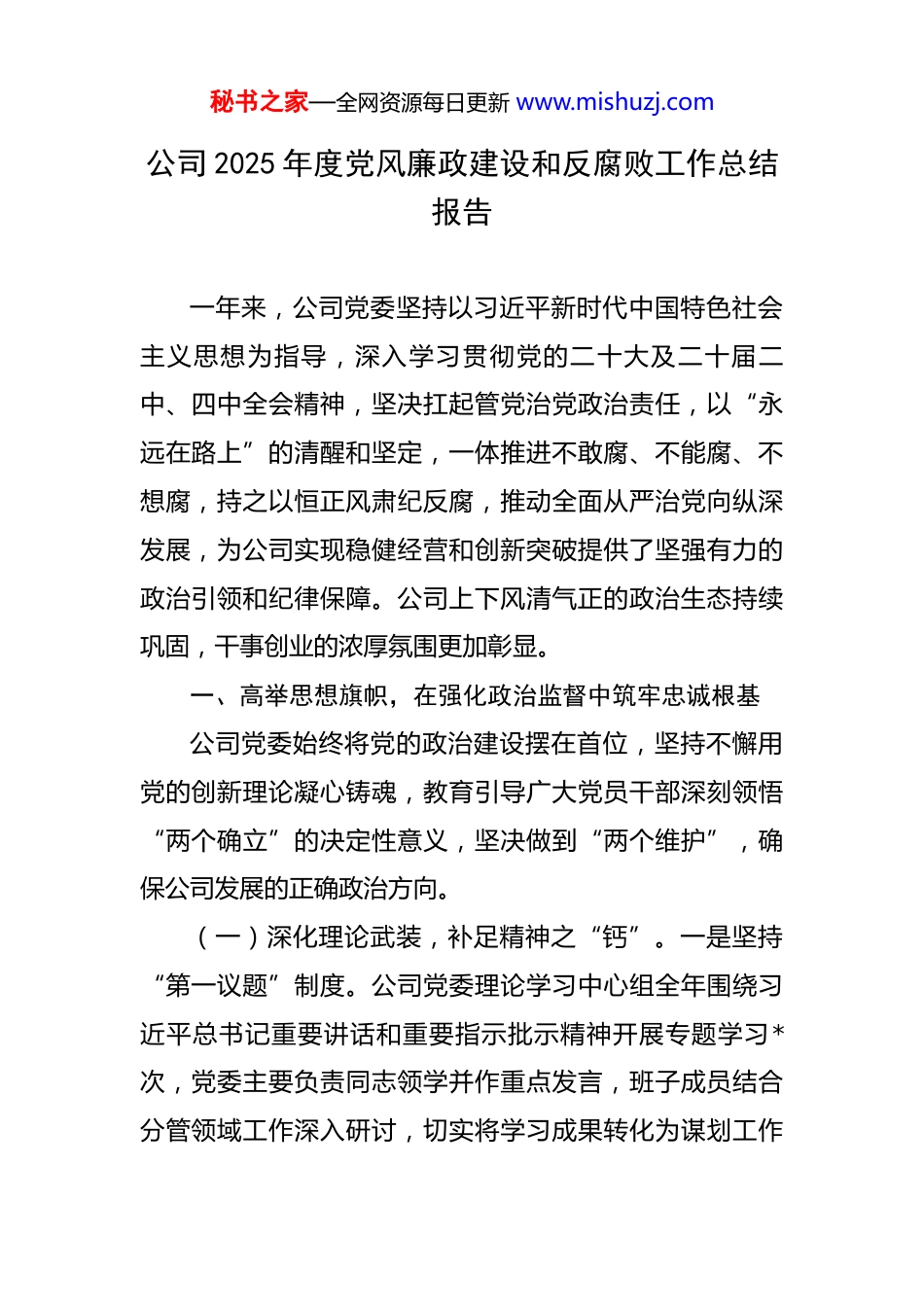 秘书之家—全网资源每日更新 www.mishuzj.com公司 2025 年度党风廉政建设和反腐败工作总结报告 一年来,公司党委坚持以习近平新时代中国特色社会主义思想为指导,深入学习贯彻党的二十大及二十届二中、四中全会精神,坚决扛起管党治党政治责任,以“永远在路上”的清醒和坚定,一体推进不敢腐、不能腐、不想腐,持之以恒正风肃纪反腐,推动全面从严治党向纵深发展,为公司实现稳健经营和创新突破提供了坚强有力的政治引领和纪律保障。公司上下风清气正的政治生态持续巩固,干事创业的浓厚氛围更加彰显。一、高举思想旗帜,在强化政治监督中筑牢忠诚根基公司党委始终将党的政治建设摆在首位,坚持不懈用党的创新理论凝心铸魂,教育引导广大党员干部深刻领悟“两个确立”的决定性意义,坚决做到“两个维护”,确保公司发展的正确政治方向。(一)深化理论武装,补足精神之“钙”。一是坚持“第一议题”制度。公司党委理论学习中心组全年围绕习近平总书记重要讲话和重要指示批示精神开展专题学习*次,党委主要负责同志领学并作重点发言,班子成员结合分管领域工作深入研讨,切实将学习成果转化为谋划工作秘书之家—全网资源每日更新 www.mishuzj.com的新思路、破解难题的新举措。二是抓实党员干部教育培训。依托公司党校主阵地,举办党员领导干部、关键岗位人员、青年骨干等各类培训班*期,参训人员达*人次,将党章党规党纪作为必修课,确保党的纪律规矩内化于心、外化于行。三是创新学习形式载体。充分利用公司内网、“学习强国”等线上平台,打造“指尖上的课堂”,推送理论文章和警示教育案例*余篇,组织线上知识竞赛*场,推动理论学习融入日常、抓在经常。(二)聚焦“国之大者”,做实政治监督。一是围绕重大决策部署强化监督。紧扣党中央关于科技创新、安全生产、绿色发展等重大战略,建立专项监督台账,通过列席重大会议、开展专项督查、下发纪检监察建议书等方式,跟进监督公司重大项目投资、关键核心技术攻关等重点任务的落实情况,发现并推动整改问题*个,确保党中央政令畅通、公司战略执行有力。二是护航中心工作精准监督。针对年度经营目标和改革发展任务,纪检监察机构组织力量下沉一线,深入*个重点项目和*家分子公司开展“嵌入式”监督,及时发现并纠正执行偏差、效率不高等问题,保障公司各项业务在规范轨道上高效运行。三是净化政治生态常态化监督。严格执行《关于新形势下党内政治生活的若干准则》,加强对民主集中制执行、领导班子秘书之家—全网资源每日更新 www.mishuzj.com议事决策、“三重一大”事项集体研究等情况的监督检查,全年开展政治生态分析研判*次,严肃查处搞“小圈子”、散布不实言论等违反政治纪律和政治规矩的行为*起,处理*人。二、贯通“两个责任”,在同向发力中织密管党治党网络公司党委坚决扛起全面从严治党主体责任,纪委认真履行监督责任,推动主体责任和监督责任贯通协同、一体落实,构建了横向到边、纵向到底的责任体系,形成了齐抓共管的强大合力。(一)拧紧压实主体责任链条。一是高位推动谋划部署。公司党委年初即召开党风廉政建设和反腐败工作会议,制定印发年度工作要点和责任清单,将*项重点任务逐一分解到领导班子成员和各职能部门、各级子公司。全年召开*次专题会议听取工作汇报,研究解决难点问题。二是强化“一把手”和领导班子责任。党委书记认真履行第一责任人职责,对重要工作亲自部署、重大问题亲自过问、重要环节亲自协调。班子成员严格落实“一岗双责”,将业务工作与党风廉政建设同部署、同检查,定期与分管单位负责人开展廉政谈话,实现压力层层传导。三是严格考核问责。将党风廉政建设工作成效纳入年度绩效考核和领秘书之家—全网资源每日更新 www.mishuzj.com导班子综合评价体系,权重占比达*%。对落实全面从严治党责任不力、导致发生严重违纪违法问题的*个单位和*名领导干部进行了严肃问责,以问责倒逼责任落实。(二)精准有效履行监督责任。一是做实日常监督。公司纪委综合运用谈心谈话、调研走访、受理信访举报等方式,加强对各级“一把手”和领导班子的监督。全年共开展各层级廉政谈话*人次,其中“一...