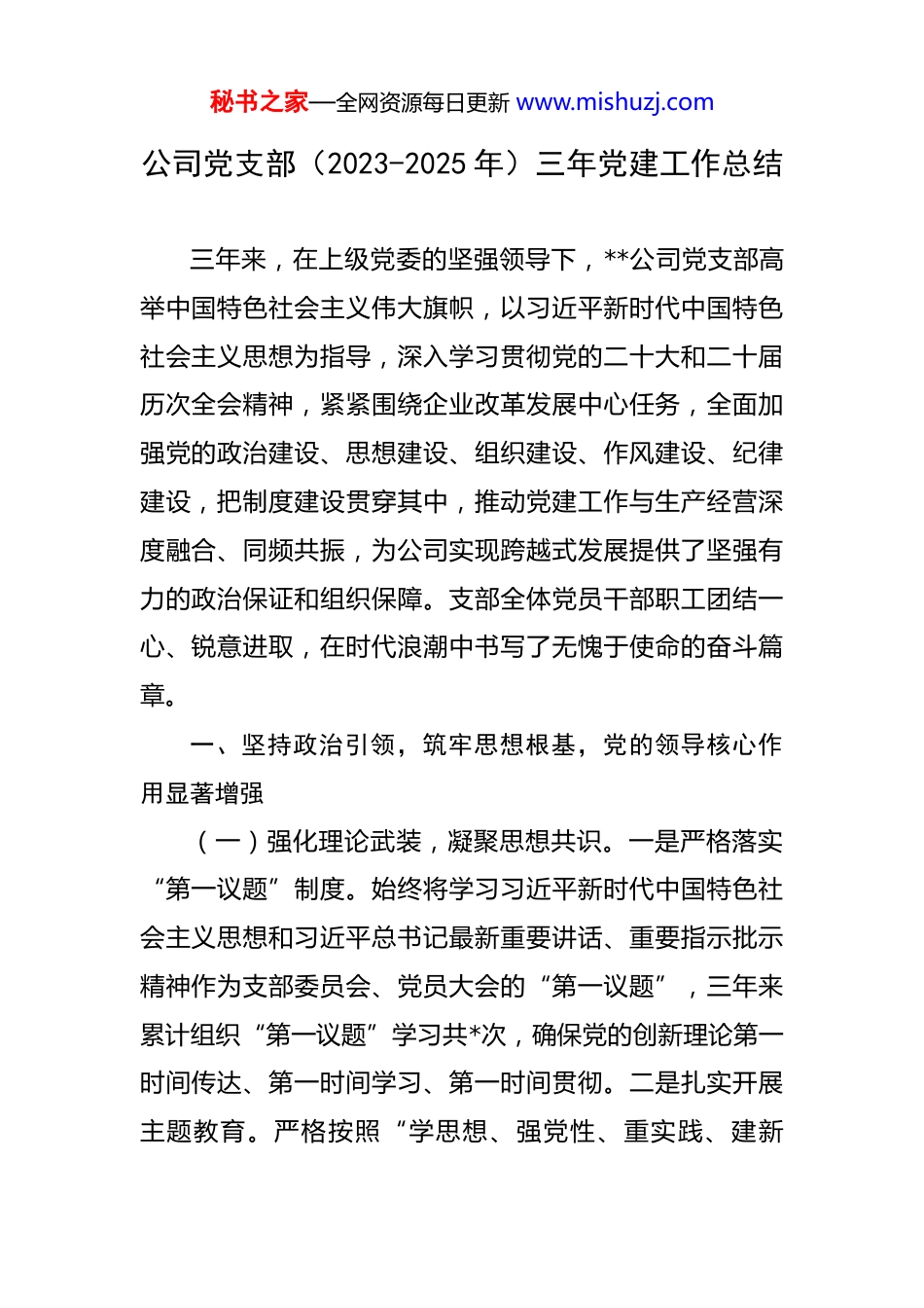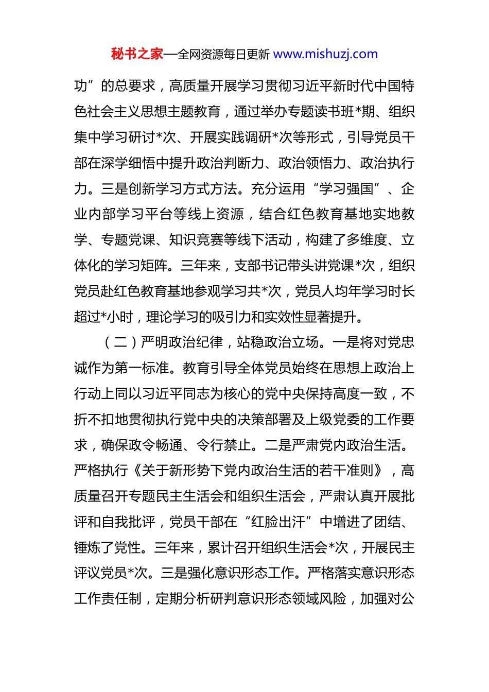 秘书之家—全网资源每日更新 www.mishuzj.com公司党支部(2023-2025 年)三年党建工作总结 三年来,在上级党委的坚强领导下,**公司党支部高举中国特色社会主义伟大旗帜,以习近平新时代中国特色社会主义思想为指导,深入学习贯彻党的二十大和二十届历次全会精神,紧紧围绕企业改革发展中心任务,全面加强党的政治建设、思想建设、组织建设、作风建设、纪律建设,把制度建设贯穿其中,推动党建工作与生产经营深度融合、同频共振,为公司实现跨越式发展提供了坚强有力的政治保证和组织保障。支部全体党员干部职工团结一心、锐意进取,在时代浪潮中书写了无愧于使命的奋斗篇章。一、坚持政治引领,筑牢思想根基,党的领导核心作用显著增强(一)强化理论武装,凝聚思想共识。一是严格落实“第一议题”制度。始终将学习习近平新时代中国特色社会主义思想和习近平总书记最新重要讲话、重要指示批示精神作为支部委员会、党员大会的“第一议题”,三年来累计组织“第一议题”学习共*次,确保党的创新理论第一时间传达、第一时间学习、第一时间贯彻。二是扎实开展主题教育。严格按照“学思想、强党性、重实践、建新秘书之家—全网资源每日更新 www.mishuzj.com功”的总要求,高质量开展学习贯彻习近平新时代中国特色社会主义思想主题教育,通过举办专题读书班*期、组织集中学习研讨*次、开展实践调研*次等形式,引导党员干部在深学细悟中提升政治判断力、政治领悟力、政治执行力。三是创新学习方式方法。充分运用“学习强国”、企业内部学习平台等线上资源,结合红色教育基地实地教学、专题党课、知识竞赛等线下活动,构建了多维度、立体化的学习矩阵。三年来,支部书记带头讲党课*次,组织党员赴红色教育基地参观学习共*次,党员人均年学习时长超过*小时,理论学习的吸引力和实效性显著提升。(二)严明政治纪律,站稳政治立场。一是将对党忠诚作为第一标准。教育引导全体党员始终在思想上政治上行动上同以习近平同志为核心的党中央保持高度一致,不折不扣地贯彻执行党中央的决策部署及上级党委的工作要求,确保政令畅通、令行禁止。二是严肃党内政治生活。严格执行《关于新形势下党内政治生活的若干准则》,高质量召开专题民主生活会和组织生活会,严肃认真开展批评和自我批评,党员干部在“红脸出汗”中增进了团结、锤炼了党性。三年来,累计召开组织生活会*次,开展民主评议党员*次。三是强化意识形态工作。严格落实意识形态工作责任制,定期分析研判意识形态领域风险,加强对公秘书之家—全网资源每日更新 www.mishuzj.com司网站、公众号等宣传阵地的管理,牢牢掌握意识形态工作领导权。三年来,未发生任何意识形态领域负面事件,营造了积极健康向上的舆论氛围。(三)落实主体责任,夯实政治根基。一是健全责任体系。明确了支部书记为第一责任人、支部委员“一岗双责”的党建工作责任体系,定期召开党建工作专题会议,研究部署、推动落实年度党建工作要点。三年来,累计召开党建工作专题会议*次,解决重点难点问题*个。二是完善决策机制。坚持将党支部研究讨论作为董事会、经理层决策重大事项的前置程序,确保党组织在公司治理中“把方向、管大局、保落实”的领导作用得到充分发挥。三年来,支部前置研究讨论重大事项*项,提出建设性意见*条。二、夯实组织基础,建强战斗堡垒,基层党组织组织力全面提升(一)推进党支部标准化规范化建设。一是严格落实基本制度。不折不扣执行“三会一课”、主题党日、组织生活会、民主评议党员等基本制度,做到形式规范、内容充实、记录完整。三年来,累计召开支部党员大会*次、支委会*次,开展主题党日活动*次,实现了组织生活的常态化、制度化。二是优化组织设置。根据业务发展和党员分秘书之家—全网资源每日更新 www.mishuzj.com布情况,科学划分党小组,选优配强党小组长,确保党的组织和工作全覆盖,有效打通了联系服务党员的“最后一公里”。三是加强阵地建设。投入专项资金*万元,高标准建成了集学习、议事、活动于一体的党员活动室,为党员教育管理提供了坚实阵地。(二)抓好党员队伍教育管理。一是严把党员“入口关”。坚持政治标...