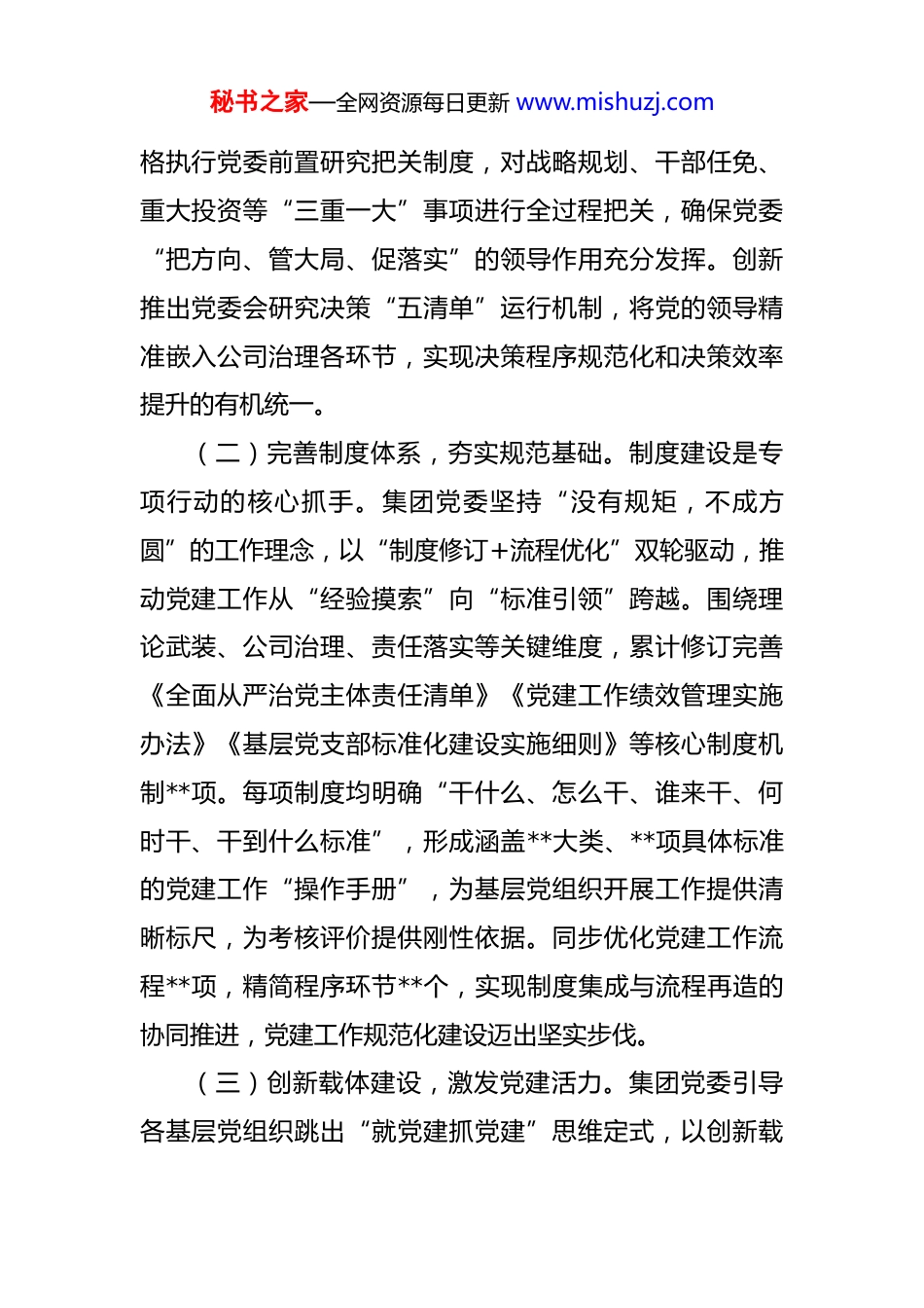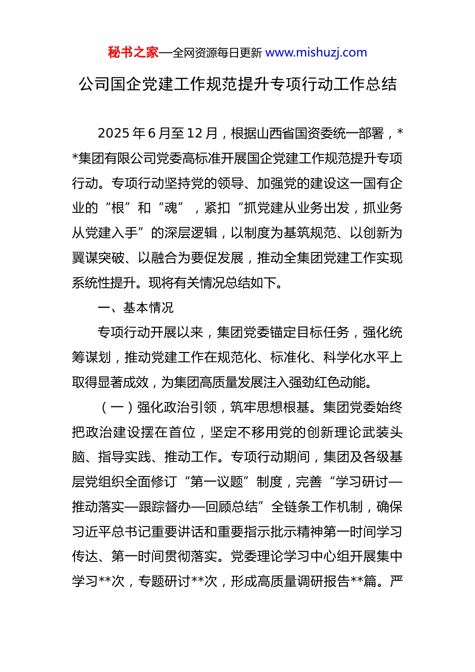 秘书之家—全网资源每日更新 www.mishuzj.com公司国企党建工作规范提升专项行动工作总结 2025 年 6 月至 12 月,根据山西省国资委统一部署,**集团有限公司党委高标准开展国企党建工作规范提升专项行动。专项行动坚持党的领导、加强党的建设这一国有企业的“根”和“魂”,紧扣“抓党建从业务出发,抓业务从党建入手”的深层逻辑,以制度为基筑规范、以创新为翼谋突破、以融合为要促发展,推动全集团党建工作实现系统性提升。现将有关情况总结如下。一、基本情况专项行动开展以来,集团党委锚定目标任务,强化统筹谋划,推动党建工作在规范化、标准化、科学化水平上取得显著成效,为集团高质量发展注入强劲红色动能。(一)强化政治引领,筑牢思想根基。集团党委始终把政治建设摆在首位,坚定不移用党的创新理论武装头脑、指导实践、推动工作。专项行动期间,集团及各级基层党组织全面修订“第一议题”制度,完善“学习研讨—推动落实—跟踪督办—回顾总结”全链条工作机制,确保习近平总书记重要讲话和重要指示批示精神第一时间学习传达、第一时间贯彻落实。党委理论学习中心组开展集中学习**次,专题研讨**次,形成高质量调研报告**篇。严秘书之家—全网资源每日更新 www.mishuzj.com格执行党委前置研究把关制度,对战略规划、干部任免、重大投资等“三重一大”事项进行全过程把关,确保党委“把方向、管大局、促落实”的领导作用充分发挥。创新推出党委会研究决策“五清单”运行机制,将党的领导精准嵌入公司治理各环节,实现决策程序规范化和决策效率提升的有机统一。(二)完善制度体系,夯实规范基础。制度建设是专项行动的核心抓手。集团党委坚持“没有规矩,不成方圆”的工作理念,以“制度修订+流程优化”双轮驱动,推动党建工作从“经验摸索”向“标准引领”跨越。围绕理论武装、公司治理、责任落实等关键维度,累计修订完善《全面从严治党主体责任清单》《党建工作绩效管理实施办法》《基层党支部标准化建设实施细则》等核心制度机制**项。每项制度均明确“干什么、怎么干、谁来干、何时干、干到什么标准”,形成涵盖**大类、**项具体标准的党建工作“操作手册”,为基层党组织开展工作提供清晰标尺,为考核评价提供刚性依据。同步优化党建工作流程**项,精简程序环节**个,实现制度集成与流程再造的协同推进,党建工作规范化建设迈出坚实步伐。(三)创新载体建设,激发党建活力。集团党委引导各基层党组织跳出“就党建抓党建”思维定式,以创新载秘书之家—全网资源每日更新 www.mishuzj.com体激发党建活力,推动党建工作从“组织存在”向“功能发挥”跃升。在理论宣讲方面,连续举办*届集团理论宣讲大赛,培育形成“**宣讲团”“**学习轻骑兵”等一批接地气、有温度的宣讲品牌,通过快板、情景剧、微视频等职工喜闻乐见形式,开展基层宣讲**场次,覆盖职工**万人次,让党的创新理论走进职工心里。在干部培养方面,聚焦中高级管理人员“德性、悟性、执行力”提升,实施“分层分类+按需施教”专题培训**期,培训干部**人次。创新推行“两前一贯”立体化知事识人体系,为**名中层正职干部建立现实表现档案,新提拔的**名管理人员全部进行“墩苗”历练,在急难险重岗位淬炼成长。在品牌创建方面,指导各基层党组织结合产业特点打造特色党建品牌,形成“党建+降本增效”“党建+扭亏脱困”“党建+技术攻关”等**个品牌项目,实现党建工作与业务工作同频共振、互促共进。(四)深化融合赋能,服务中心大局。集团党委牢固树立“党建工作不能悬在空中,必须融入生产经营毛细血管”的理念,以“党建赋能业务,业务检验党建”为导向,构建“责任共担、目标共融、成果共享”的党建与业务融合机制。按照区域相邻、产业相近、职能相关、优势互补原则,积极开展党建联建共建,集团所属**单位党委秘书之家—全网资源每日更新 www.mishuzj.com与科研院所、上下游企业党组织建立联建关系**个,组建联合攻关团队**个,在清洁能源、智能制造等领域取得突破性进展。充分发挥党支部战斗堡垒作用,聚焦改革发展、生产经营、扭亏减亏等重难点任务,各级党组织累计创建党建课题**个...