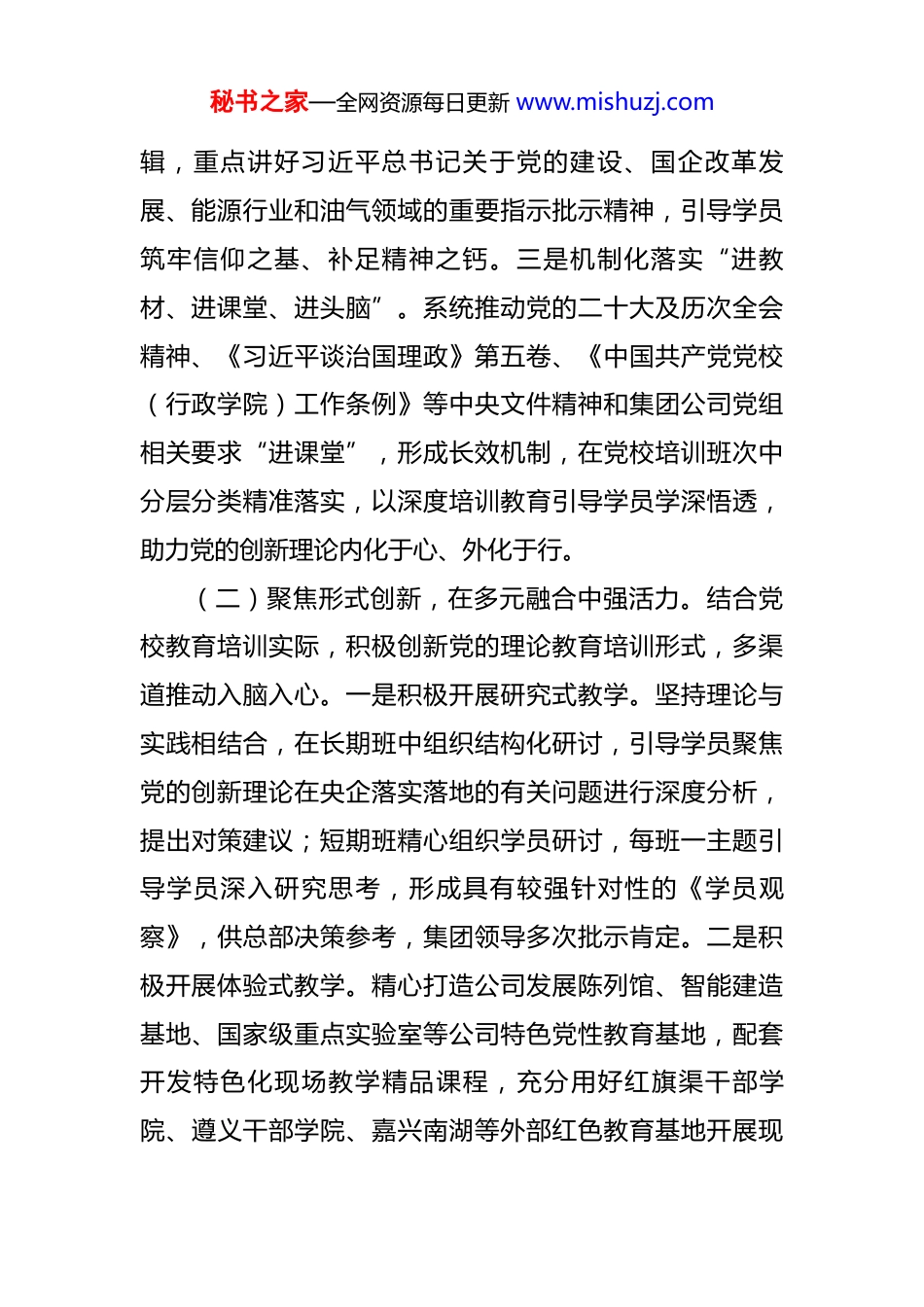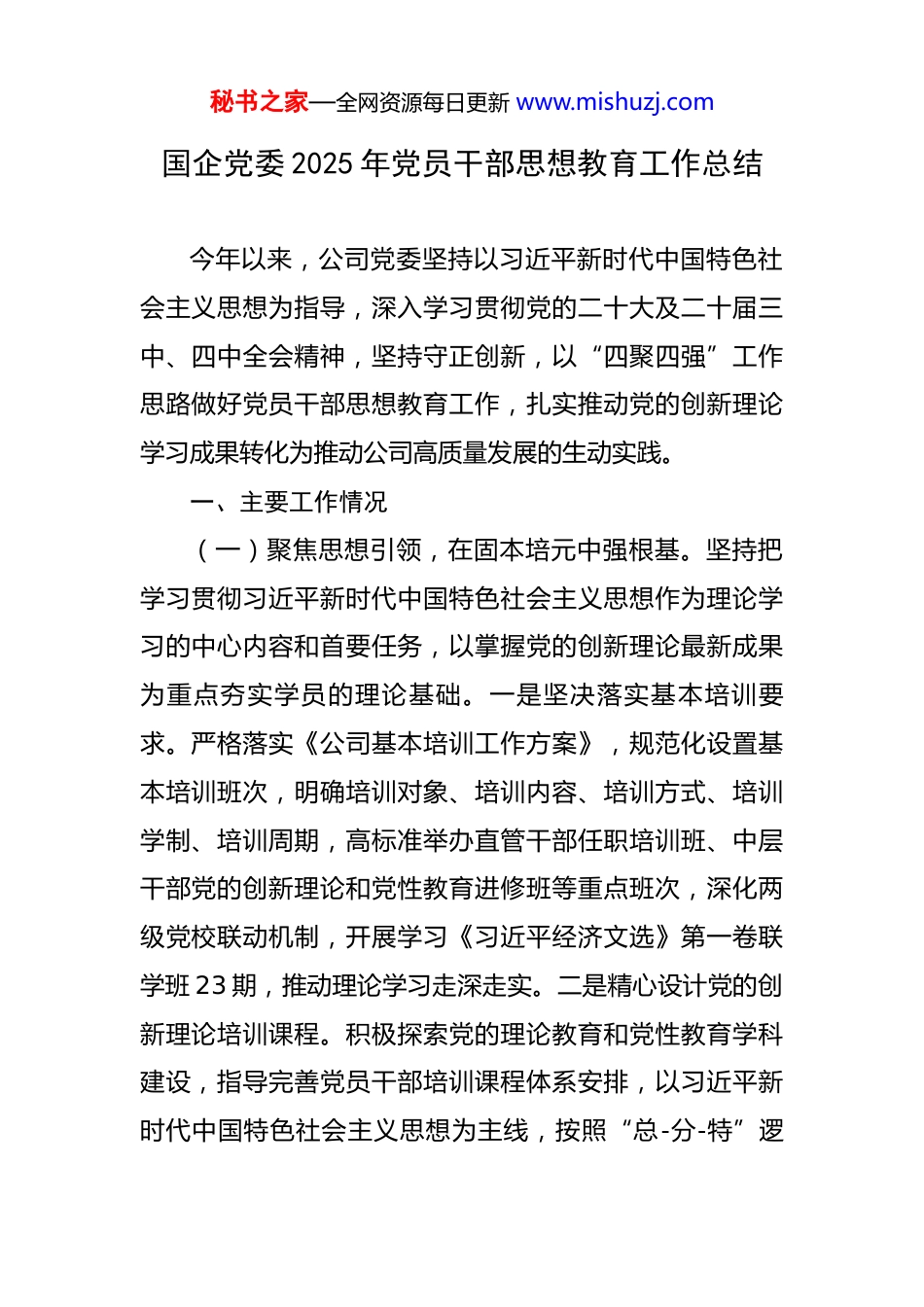 秘书之家—全网资源每日更新 www.mishuzj.com国企党委 2025 年党员干部思想教育工作总结 今年以来,公司党委坚持以习近平新时代中国特色社会主义思想为指导,深入学习贯彻党的二十大及二十届三中、四中全会精神,坚持守正创新,以“四聚四强”工作思路做好党员干部思想教育工作,扎实推动党的创新理论学习成果转化为推动公司高质量发展的生动实践。一、主要工作情况(一)聚焦思想引领,在固本培元中强根基。坚持把学习贯彻习近平新时代中国特色社会主义思想作为理论学习的中心内容和首要任务,以掌握党的创新理论最新成果为重点夯实学员的理论基础。一是坚决落实基本培训要求。严格落实《公司基本培训工作方案》,规范化设置基本培训班次,明确培训对象、培训内容、培训方式、培训学制、培训周期,高标准举办直管干部任职培训班、中层干部党的创新理论和党性教育进修班等重点班次,深化两级党校联动机制,开展学习《习近平经济文选》第一卷联学班 23 期,推动理论学习走深走实。二是精心设计党的创新理论培训课程。积极探索党的理论教育和党性教育学科建设,指导完善党员干部培训课程体系安排,以习近平新时代中国特色社会主义思想为主线,按照“总-分-特”逻秘书之家—全网资源每日更新 www.mishuzj.com辑,重点讲好习近平总书记关于党的建设、国企改革发展、能源行业和油气领域的重要指示批示精神,引导学员筑牢信仰之基、补足精神之钙。三是机制化落实“进教材、进课堂、进头脑”。系统推动党的二十大及历次全会精神、《习近平谈治国理政》第五卷、《中国共产党党校(行政学院)工作条例》等中央文件精神和集团公司党组相关要求“进课堂”,形成长效机制,在党校培训班次中分层分类精准落实,以深度培训教育引导学员学深悟透,助力党的创新理论内化于心、外化于行。(二)聚焦形式创新,在多元融合中强活力。结合党校教育培训实际,积极创新党的理论教育培训形式,多渠道推动入脑入心。一是积极开展研究式教学。坚持理论与实践相结合,在长期班中组织结构化研讨,引导学员聚焦党的创新理论在央企落实落地的有关问题进行深度分析,提出对策建议;短期班精心组织学员研讨,每班一主题引导学员深入研究思考,形成具有较强针对性的《学员观察》,供总部决策参考,集团领导多次批示肯定。二是积极开展体验式教学。精心打造公司发展陈列馆、智能建造基地、国家级重点实验室等公司特色党性教育基地,配套开发特色化现场教学精品课程,充分用好红旗渠干部学院、遵义干部学院、嘉兴南湖等外部红色教育基地开展现秘书之家—全网资源每日更新 www.mishuzj.com场教学,以实践讲理论,以案例说思想,增强理论学习的吸引力感染力说服力。三是积极开展互动式教学。面向中青年干部、基层党组织书记等重点人群,创新应用书记党课、理论知识竞赛、拆书会、学员讲堂等丰富多样的学习形式,切实激发学员学习内生动力,打造培训班理论学习“比学赶帮超”的浓厚局面。四是积极开展“互联网+”式教学。充分用好“公司学习网”线上专区专题教学资源,整合优质教学资源,开设近 50 个常态化学习专区,学习人次超 30 万,为广大党员干部提供灵活的自学渠道,持续巩固学习效果。(三)聚焦资源拓展,在赋能基层中强实效。积极发挥党校教育培训优势,为基层单位提供丰富的优质学习资源,推动建立公司系统内理论学习一贯到底、上下联动的高效工作机制。一是建设强有力课程师资力量。坚持“师课共生”,以学科建设为统领,结构化推进公司特色精品课程开发和优质讲师队伍建设,定期开展全系统“好课程好讲师好案例”大赛,组织认证讲师下基层授课,实现优质资源直达一线、覆盖基层。《党章和党内法规》等多门精品课程获评中组部好课程、国资央企党校系统“优秀教案”。二是开发特色化案例及教材。以“红+蓝”为主线,构建超 1000 个案例的结构化精品案例库,开发 16 本特色秘书之家—全网资源每日更新 www.mishuzj.com辅导教材和辅学读本,将基层实践经验转化为可复制、可推广的案例教学资源,并在课程开发中有效转化,多个精品案例获评中国政研会“基层思想政治工作优秀案例”。三是开展针对...