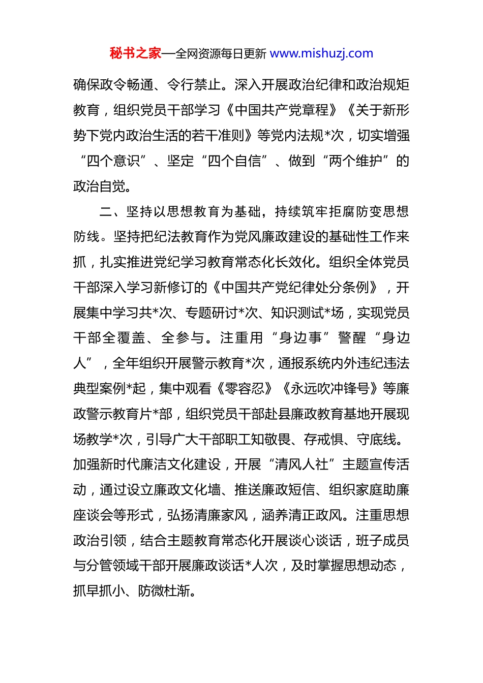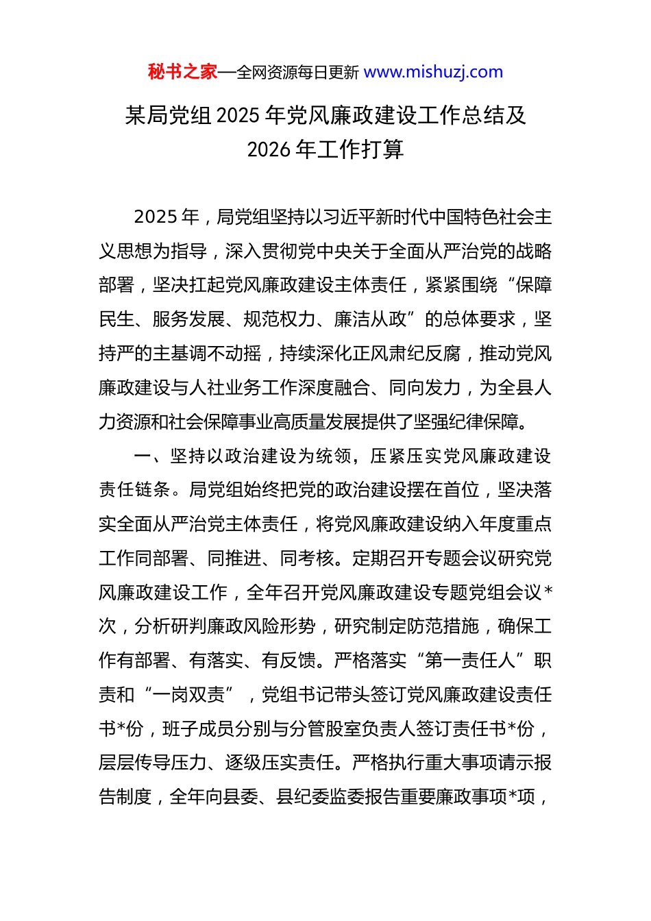 秘书之家—全网资源每日更新 www.mishuzj.com某局党组 2025 年党风廉政建设工作总结及2026 年工作打算 2025 年,局党组坚持以习近平新时代中国特色社会主义思想为指导,深入贯彻党中央关于全面从严治党的战略部署,坚决扛起党风廉政建设主体责任,紧紧围绕“保障民生、服务发展、规范权力、廉洁从政”的总体要求,坚持严的主基调不动摇,持续深化正风肃纪反腐,推动党风廉政建设与人社业务工作深度融合、同向发力,为全县人力资源和社会保障事业高质量发展提供了坚强纪律保障。一、坚持以政治建设为统领,压紧压实党风廉政建设责任链条。局党组始终把党的政治建设摆在首位,坚决落实全面从严治党主体责任,将党风廉政建设纳入年度重点工作同部署、同推进、同考核。定期召开专题会议研究党风廉政建设工作,全年召开党风廉政建设专题党组会议*次,分析研判廉政风险形势,研究制定防范措施,确保工作有部署、有落实、有反馈。严格落实“第一责任人”职责和“一岗双责”,党组书记带头签订党风廉政建设责任书*份,班子成员分别与分管股室负责人签订责任书*份,层层传导压力、逐级压实责任。严格执行重大事项请示报告制度,全年向县委、县纪委监委报告重要廉政事项*项,秘书之家—全网资源每日更新 www.mishuzj.com确保政令畅通、令行禁止。深入开展政治纪律和政治规矩教育,组织党员干部学习《中国共产党章程》《关于新形势下党内政治生活的若干准则》等党内法规*次,切实增强“四个意识”、坚定“四个自信”、做到“两个维护”的政治自觉。二、坚持以思想教育为基础,持续筑牢拒腐防变思想防线。坚持把纪法教育作为党风廉政建设的基础性工作来抓,扎实推进党纪学习教育常态化长效化。组织全体党员干部深入学习新修订的《中国共产党纪律处分条例》,开展集中学习共*次、专题研讨*次、知识测试*场,实现党员干部全覆盖、全参与。注重用“身边事”警醒“身边人”,全年组织开展警示教育*次,通报系统内外违纪违法典型案例*起,集中观看《零容忍》《永远吹冲锋号》等廉政警示教育片*部,组织党员干部赴县廉政教育基地开展现场教学*次,引导广大干部职工知敬畏、存戒惧、守底线。加强新时代廉洁文化建设,开展“清风人社”主题宣传活动,通过设立廉政文化墙、推送廉政短信、组织家庭助廉座谈会等形式,弘扬清廉家风,涵养清正政风。注重思想政治引领,结合主题教育常态化开展谈心谈话,班子成员与分管领域干部开展廉政谈话*人次,及时掌握思想动态,抓早抓小、防微杜渐。秘书之家—全网资源每日更新 www.mishuzj.com三、坚持以制度建设为抓手,健全廉政风险防控机制。聚焦人社领域权力运行的关键环节,持续完善内控制度体系,织密扎牢制度笼子。围绕社保基金、就业专项资金、人事考试、职称评审、工资审批等重点领域和关键岗位,组织开展廉政风险点排查*轮,共梳理风险点*个,制定防控措施*条,明确责任主体和监管流程。修订完善《局党组议事规则》《财务管理制度》《项目资金管理办法》《政府采购实施细则》等制度*项,进一步规范决策程序和权力运行。严格执行“三重一大”事项集体研究制度,全年集体决策重大事项*项,均做到会前论证、会上民主、会后公开。强化基金安全管理,配合上级部门完成社保基金审计*次,发现问题全部整改到位;加强待遇资格认证管理,全年开展数据比对*万条,堵住基金流失漏洞*起,追回违规领取待遇资金*万元。推进政务公开标准化规范化建设,通过政府网站、政务新媒体等平台主动公开政策文件、服务事项、资金使用等情况*条,接受社会监督。四、坚持以作风建设为重点,持续纠治“四风”顽瘴痼疾。深入贯彻落实纪律规定及其要求,紧盯重要节点、重点人群、重点问题,常态化开展明察暗访和专项检查。全年组织开展节日期间作风纪律检查*次,抽查股室和下属单位*个,未发现违规收送礼品礼金、公款吃喝等问题。持秘书之家—全网资源每日更新 www.mishuzj.com续整治形式主义、官僚主义,精简文件会议,全年印发文件同比下降*%,召开会议减少*%,切实为基层减负松绑。优化政务服务环境,深入推进“人社服务快办行动”,梳理“打包办”事项*项、“提速办”事项*...