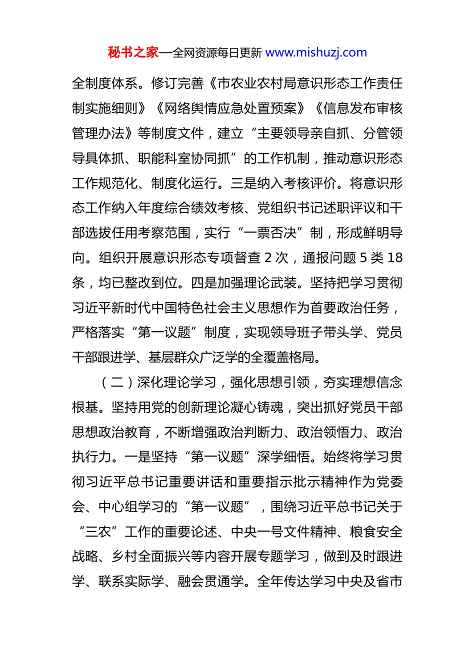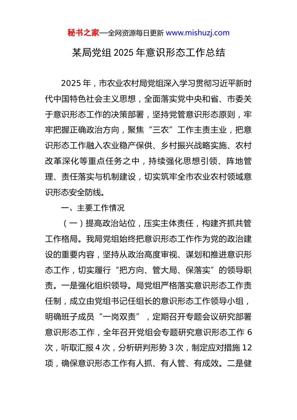 秘书之家—全网资源每日更新 www.mishuzj.com某局党组 2025 年意识形态工作总结 2025 年,市农业农村局党组深入学习贯彻习近平新时代中国特色社会主义思想,全面落实党中央和省、市委关于意识形态工作的决策部署,坚持党管意识形态原则,牢牢把握正确政治方向,聚焦“三农”工作主责主业,把意识形态工作融入农业稳产保供、乡村振兴战略实施、农村改革深化等重点任务之中,持续强化思想引领、阵地管理、责任落实与机制建设,切实筑牢全市农业农村领域意识形态安全防线。一、主要工作情况(一)提高政治站位,压实主体责任,构建齐抓共管工作格局。我局党组始终把意识形态工作作为党的政治建设的重要内容,坚持从政治高度审视、谋划和推进意识形态工作,切实履行“把方向、管大局、保落实”的领导职责。一是强化组织领导。局党组严格落实意识形态工作责任制,成立由党组书记任组长的意识形态工作领导小组,明确班子成员“一岗双责”,定期召开专题会议研究部署意识形态工作,全年召开党组会专题研究意识形态工作 6次,听取汇报 4 次,分析研判形势 3 次,制定应对措施 12项,确保意识形态工作有人抓、有人管、有成效。二是健秘书之家—全网资源每日更新 www.mishuzj.com全制度体系。修订完善《市农业农村局意识形态工作责任制实施细则》《网络舆情应急处置预案》《信息发布审核管理办法》等制度文件,建立“主要领导亲自抓、分管领导具体抓、职能科室协同抓”的工作机制,推动意识形态工作规范化、制度化运行。三是纳入考核评价。将意识形态工作纳入年度综合绩效考核、党组织书记述职评议和干部选拔任用考察范围,实行“一票否决”制,形成鲜明导向。组织开展意识形态专项督查 2 次,通报问题 5 类 18条,均已整改到位。四是加强理论武装。坚持把学习贯彻习近平新时代中国特色社会主义思想作为首要政治任务,严格落实“第一议题”制度,实现领导班子带头学、党员干部跟进学、基层群众广泛学的全覆盖格局。(二)深化理论学习,强化思想引领,夯实理想信念根基。坚持用党的创新理论凝心铸魂,突出抓好党员干部思想政治教育,不断增强政治判断力、政治领悟力、政治执行力。一是坚持“第一议题”深学细悟。始终将学习贯彻习近平总书记重要讲话和重要指示批示精神作为党委会、中心组学习的“第一议题”,围绕习近平总书记关于“三农”工作的重要论述、中央一号文件精神、粮食安全战略、乡村全面振兴等内容开展专题学习,做到及时跟进学、联系实际学、融会贯通学。全年传达学习中央及省市秘书之家—全网资源每日更新 www.mishuzj.com重要会议精神。二是推动理论学习走深走实。结合主题教育常态化长效化要求,制定年度学习计划,编印《“三农”政策理论学习读本》,开设“农讲堂”专题讲座 12期,邀请党校专家、高校教授、行业领军人才授课,提升学习的专业性与实效性。组织党员干部赴井冈山、瑞金等地开展红色研学活动 3 批次,重温入党誓词、缅怀革命先烈,赓续红色血脉。三是创新学习形式载体。依托“学习强国”平台、“赣鄱党建云”“江西农业农村”微信公众号等新媒体阵地,打造线上线下融合的学习矩阵。建立青年理论学习小组 8 个,开展读书分享、主题演讲、调研征文等活动,激发青年干部学习热情。四是注重学用结合转化。坚持理论指导实践,围绕耕地保护、种业振兴、现代农业产业园建设、农村人居环境整治等重点工作,组织开展专题调研 15 项,形成高质量调研报告 20 篇,其中《关于破解撂荒地治理难题的对策建议》获市委主要领导批示,《数字赋能智慧农业发展的路径探索》被纳入市政府决策参考。(三)守好宣传阵地,弘扬主流价值,营造强信心鼓干劲氛围。牢牢掌握意识形态话语权和主导权,积极构建全方位、立体化的宣传格局,讲好“三农”故事,传播正能量。一是加强正面宣传引导。紧扣粮食生产、脱贫攻坚秘书之家—全网资源每日更新 www.mishuzj.com成果巩固、美丽乡村建设等重大主题,策划推出“春耕一线党旗红”“丰收时节话振兴”“最美乡村带头人”系列报道,在市级以上主流媒体刊发稿件 230 余篇,央视《新闻联播》《人民日报》《农民日报》...