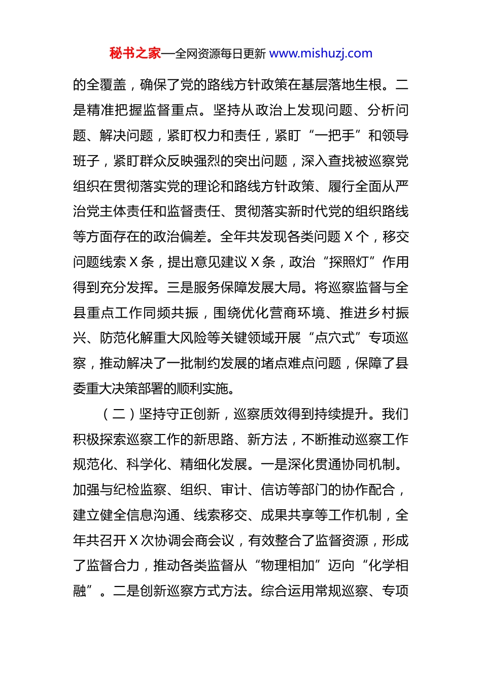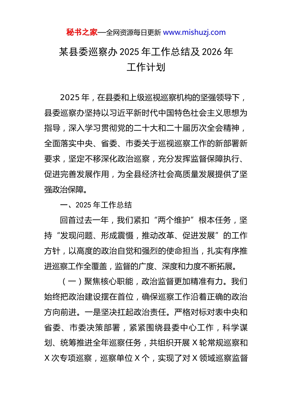 秘书之家—全网资源每日更新 www.mishuzj.com某县委巡察办 2025 年工作总结及 2026 年工作计划 2025 年,在县委和上级巡视巡察机构的坚强领导下,县委巡察办坚持以习近平新时代中国特色社会主义思想为指导,深入学习贯彻党的二十大和二十届历次全会精神,全面落实中央、省委、市委关于巡视巡察工作的新部署新要求,坚定不移深化政治巡察,充分发挥监督保障执行、促进完善发展作用,为全县经济社会高质量发展提供了坚强政治保障。一、2025 年工作总结回首过去一年,我们紧扣“两个维护”根本任务,坚持“发现问题、形成震慑,推动改革、促进发展”的工作方针,以高度的政治自觉和强烈的使命担当,扎实有序推进巡察工作全覆盖,监督的广度、深度和力度不断拓展。(一)聚焦核心职能,政治监督更加精准有力。我们始终把政治建设摆在首位,确保巡察工作沿着正确的政治方向前进。一是坚决扛起政治责任。严格对标对表中央和省委、市委决策部署,紧紧围绕县委中心工作,科学谋划、统筹推进全年巡察任务,共组织开展 X 轮常规巡察和X 次专项巡察,巡察单位 X 个,实现了对 X 领域巡察监督秘书之家—全网资源每日更新 www.mishuzj.com的全覆盖,确保了党的路线方针政策在基层落地生根。二是精准把握监督重点。坚持从政治上发现问题、分析问题、解决问题,紧盯权力和责任,紧盯“一把手”和领导班子,紧盯群众反映强烈的突出问题,深入查找被巡察党组织在贯彻落实党的理论和路线方针政策、履行全面从严治党主体责任和监督责任、贯彻落实新时代党的组织路线等方面存在的政治偏差。全年共发现各类问题 X 个,移交问题线索 X 条,提出意见建议 X 条,政治“探照灯”作用得到充分发挥。三是服务保障发展大局。将巡察监督与全县重点工作同频共振,围绕优化营商环境、推进乡村振兴、防范化解重大风险等关键领域开展“点穴式”专项巡察,推动解决了一批制约发展的堵点难点问题,保障了县委重大决策部署的顺利实施。(二)坚持守正创新,巡察质效得到持续提升。我们积极探索巡察工作的新思路、新方法,不断推动巡察工作规范化、科学化、精细化发展。一是深化贯通协同机制。加强与纪检监察、组织、审计、信访等部门的协作配合,建立健全信息沟通、线索移交、成果共享等工作机制,全年共召开 X 次协调会商会议,有效整合了监督资源,形成了监督合力,推动各类监督从“物理相加”迈向“化学相融”。二是创新巡察方式方法。综合运用常规巡察、专项秘书之家—全网资源每日更新 www.mishuzj.com巡察、“回头看”等多种方式,探索开展“巡乡带村”“提级交叉”等有效做法,增强了巡察的灵活性和穿透力。同时,积极运用大数据、信息化技术为巡察赋能,建立了巡察数据分析模型,提高了发现问题的精准度和效率。三是优化工作流程。严格按照巡察工作条例和有关规定,进一步完善了巡察准备、了解、报告、反馈、移交、整改等各环节的工作规程,制定和修订了 X 项内部管理制度,确保巡察工作每个环节都有章可循、有规可依。(三)做实“后半篇文章”,整改成果运用不断深化。我们牢固树立“巡察发现问题是生命线,推动解决问题是落脚点”的理念,一体推进揭示问题、推动整改、促进治理。一是压紧压实整改责任。严格执行巡察反馈制度,坚持向被巡察党组织主要负责人和领导班子“双反馈”,原汁原味指出问题,提出明确整改要求。建立县级领导联系督导巡察整改工作机制,推动被巡察党组织切实担负起整改主体责任,确保整改工作真改实改、全面整改。二是强化整改日常监督。建立整改台账,实行“销号”管理,通过定期听取汇报、开展专项督查、组织整改评估等方式,对整改情况进行全过程跟踪、全方位监督,坚决防止“纸上整改”“虚假整改”。全年共对 X 个单位的整改情况开展了“回头看”,推动解决了 X 个整改不力秘书之家—全网资源每日更新 www.mishuzj.com的问题。三是注重标本兼治。坚持举一反三,推动被巡察单位把解决具体问题与普遍性问题、当前问题与长远问题结合起来,深挖问题根源,健全制度机制。全年共推动被巡察单位新建和完善各类制度 X 项,巡察标本兼治的战略作用得到...