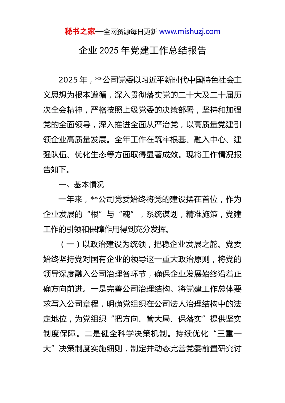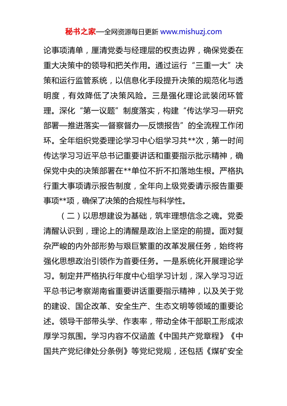秘书之家—全网资源每日更新 www.mishuzj.com企业 2025 年党建工作总结报告 2025 年,**公司党委以习近平新时代中国特色社会主义思想为根本遵循,深入贯彻落实党的二十大及二十届历次全会精神,严格按照上级党委的决策部署,坚持和加强党的全面领导,深入推进全面从严治党,以高质量党建引领企业高质量发展。全年工作在筑牢根基、融入中心、建强队伍、优化生态等方面取得显著成效。现将工作情况报告如下。一、基本情况一年来,**公司党委始终将党的建设摆在首位,作为企业发展的“根”与“魂”,系统谋划,精准施策,党建工作的引领和保障作用得到充分发挥。(一)以政治建设为统领,把稳企业发展之舵。党委始终坚持党对国有企业的领导这一重大政治原则,将党的领导深度融入公司治理各环节,确保企业发展始终沿着正确方向前进。一是完善公司治理结构。将党建工作总体要求写入公司章程,明确党组织在公司法人治理结构中的法定地位,为党组织“把方向、管大局、保落实”提供坚实制度保障。二是健全科学决策机制。持续优化“三重一大”决策制度实施细则,制定并动态完善党委前置研究讨秘书之家—全网资源每日更新 www.mishuzj.com论事项清单,厘清党委与经理层的权责边界,确保党委在重大决策中的领导和把关作用。通过运行“三重一大”决策和运行监管系统,以信息化手段提升决策的规范化与透明度,有效降低了决策风险。三是强化理论武装闭环管理。深化“第一议题”制度落实,构建“传达学习—研究部署—推进落实—督察督办—反馈报告”的全流程工作闭环。全年组织党委理论学习中心组学习共**次,第一时间传达学习习近平总书记重要讲话和重要指示批示精神,确保党中央的决策部署在**单位不折不扣落地生根。严格执行重大事项请示报告制度,全年向上级党委请示报告重要事项**项,确保了决策的合规性与科学性。(二)以思想建设为基础,筑牢理想信念之魂。党委清醒认识到,理论上的清醒是政治上坚定的前提。面对复杂严峻的内外部形势与艰巨繁重的改革发展任务,始终将强化思想政治引领作为首要任务。一是系统化开展理论学习。制定并严格执行年度中心组学习计划,深入学习习近平总书记考察湖南省重要讲话重要指示精神,以及关于党的建设、国企改革、安全生产、生态文明等领域的重要论述。领导干部带头学、作表率,带动全体干部职工形成浓厚学习氛围。学习内容不仅涵盖《中国共产党章程》《中国共产党纪律处分条例》等党纪党规,还包括《煤矿安全秘书之家—全网资源每日更新 www.mishuzj.com规程》《煤矿重大隐患判定标准》等专业法规,实现了党建理论与业务知识的融会贯通。二是常态化加强宣传引导。扎实开展形势任务教育,深入践行“三知四讲五访”活动,全面落实党支部联系点制度。领导班子成员全年深入基层联系点**次,宣讲政策、倾听呼声、解决实际困难**余项。压紧压实意识形态工作责任制,强化网络舆情监控和信访维稳工作,牢牢掌握了意识形态工作的主动权。三是立体化塑造企业形象。围绕中心工作,大力宣传在安全生产、技术创新、经营管理等方面的经验做法和先进典型,全年对内发布宣传稿件**篇,对外在主流媒体发稿**篇,有效凝聚了内部人心,提振了员工士气,也向社会展示了良好的企业形象。(三)以组织建设为抓手,筑强基层战斗堡垒。党委牢固树立大抓基层的鲜明导向,着力提升基层党组织的组织力、凝聚力和战斗力。一是打造特色党建品牌。创立“**先锋”党建品牌,以品牌建设引领党建与生产经营深度融合。确立《“党建+安全”打造平安**》重点创建项目,由党委书记、矿长亲自挂帅,明确党建理念、创建措施与目标成效,通过党建工作例会等机制强力推进,确保任务落地见效。二是提升支部建设水平。实施党建工作规范提升专项行动,聚焦政治功能强、支部班子强、党员队伍强、秘书之家—全网资源每日更新 www.mishuzj.com作用发挥强“四强”党支部创建目标,围绕思想建设、组织生活等七个方面、20 项重点任务、44 项具体举措,清单化管理、项目化推进,责任到人,精准发力。三是激发党员先锋作用。大力推动党建项目化管理,截至 10 月底,在区队班组中开展“党员先锋岗...
