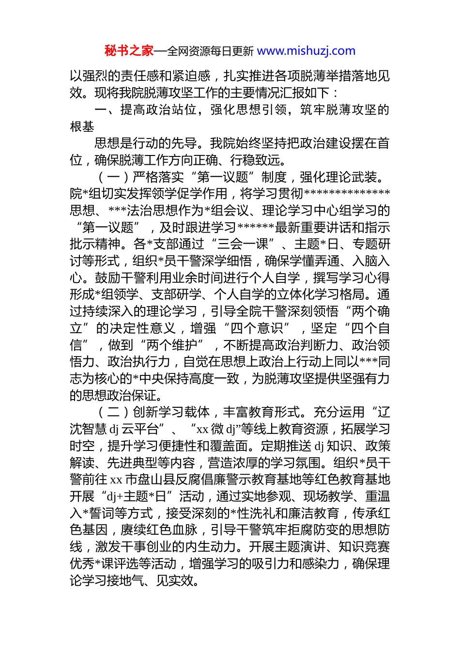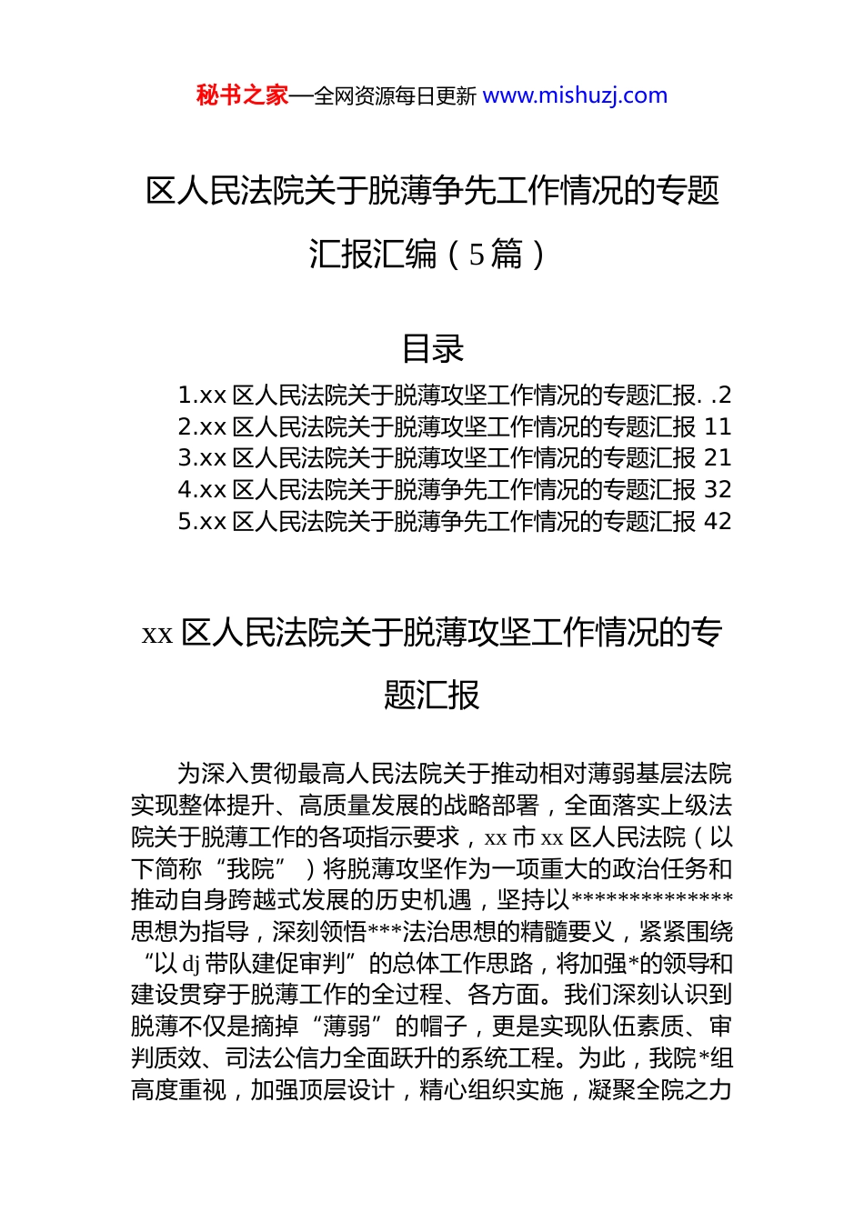 秘书之家—全网资源每日更新 www.mishuzj.com区人民法院关于脱薄争先工作情况的专题汇报汇编(5 篇)目录1.xx 区人民法院关于脱薄攻坚工作情况的专题汇报. .22.xx 区人民法院关于脱薄攻坚工作情况的专题汇报 113.xx 区人民法院关于脱薄攻坚工作情况的专题汇报 214.xx 区人民法院关于脱薄争先工作情况的专题汇报 325.xx 区人民法院关于脱薄争先工作情况的专题汇报 42xx 区人民法院关于脱薄攻坚工作情况的专题汇报为深入贯彻最高人民法院关于推动相对薄弱基层法院实现整体提升、高质量发展的战略部署,全面落实上级法院关于脱薄工作的各项指示要求,xx 市 xx 区人民法院(以下简称“我院”)将脱薄攻坚作为一项重大的政治任务和推动自身跨越式发展的历史机遇,坚持以**************思想为指导,深刻领悟***法治思想的精髓要义,紧紧围绕“以 dj 带队建促审判”的总体工作思路,将加强*的领导和建设贯穿于脱薄工作的全过程、各方面。我们深刻认识到脱薄不仅是摘掉“薄弱”的帽子,更是实现队伍素质、审判质效、司法公信力全面跃升的系统工程。为此,我院*组高度重视,加强顶层设计,精心组织实施,凝聚全院之力秘书之家—全网资源每日更新 www.mishuzj.com以强烈的责任感和紧迫感,扎实推进各项脱薄举措落地见效。现将我院脱薄攻坚工作的主要情况汇报如下:一、提高政治站位,强化思想引领,筑牢脱薄攻坚的根基思想是行动的先导。我院始终坚持把政治建设摆在首位,确保脱薄工作方向正确、行稳致远。(一)严格落实“第一议题”制度,强化理论武装。院*组切实发挥领学促学作用,将学习贯彻**************思想、***法治思想作为*组会议、理论学习中心组学习的“第一议题”,及时跟进学习******最新重要讲话和指示批示精神。各*支部通过“三会一课”、主题*日、专题研讨等形式,组织*员干警深学细悟,确保学懂弄通、入脑入心。鼓励干警利用业余时间进行个人自学,撰写学习心得形成*组领学、支部研学、个人自学的立体化学习格局。通过持续深入的理论学习,引导全院干警深刻领悟“两个确立”的决定性意义,增强“四个意识”,坚定“四个自信”,做到“两个维护”,不断提高政治判断力、政治领悟力、政治执行力,自觉在思想上政治上行动上同以***同志为核心的*中央保持高度一致,为脱薄攻坚提供坚强有力的思想政治保证。(二)创新学习载体,丰富教育形式。充分运用“辽沈智慧 dj 云平台”、“xx 微 dj”等线上教育资源,拓展学习时空,提升学习便捷性和覆盖面。定期推送 dj 知识、政策解读、先进典型等内容,营造浓厚的学习氛围。组织*员干警前往 xx 市盘山县反腐倡廉警示教育基地等红色教育基地开展“dj+主题*日”活动,通过实地参观、现场教学、重温入*誓词等方式,接受深刻的*性洗礼和廉洁教育,传承红色基因,赓续红色血脉,引导干警筑牢拒腐防变的思想防线,激发干事创业的内生动力。开展主题演讲、知识竞赛优秀*课评选等活动,增强学习的吸引力和感染力,确保理论学习接地气、见实效。秘书之家—全网资源每日更新 www.mishuzj.com二、夯实组织基础,建强战斗堡垒,凝聚脱薄攻坚的合力组织强则事业兴。我院坚持大抓基层的鲜明导向,着力将*支部建设成为脱薄攻坚的坚强战斗堡垒。(一)优化组织设置,实现深度融合。严格按照“支部建在庭上”的原则,科学调整和优化*支部设置,确保将*支部建立在各审判业务庭室和综合部门,实现*的组织和工作全覆盖。这一设置模式有效促进了 dj 工作与审判执行司法行政等中心工作的深度融合,避免了“两张皮”现象使 dj 工作真正围绕中心、服务大局,为审判执行主业提供坚强的组织支撑。(二)选优配强班子,提升履职能力。高度重视*支部班子建设,严格选拔程序,将那些政治素质高、审判业务精、协调能力强、群众基础好的优秀*员干警选拔到*支部书记和支部委员的岗位上。加强对支部班子成员的培训和管理,提升其抓 dj、带队伍、促业务的能力水平。明确支部委员职责分工,形成工作合力,确保支部各项工作有人抓、有人管、能落实,充分发挥支部班子在脱薄攻坚中的“头雁效应”和核心作用。(三)严格组织生活,锤炼过硬...