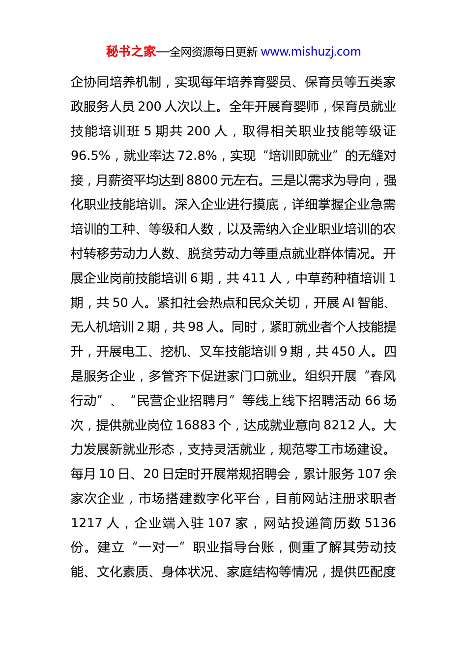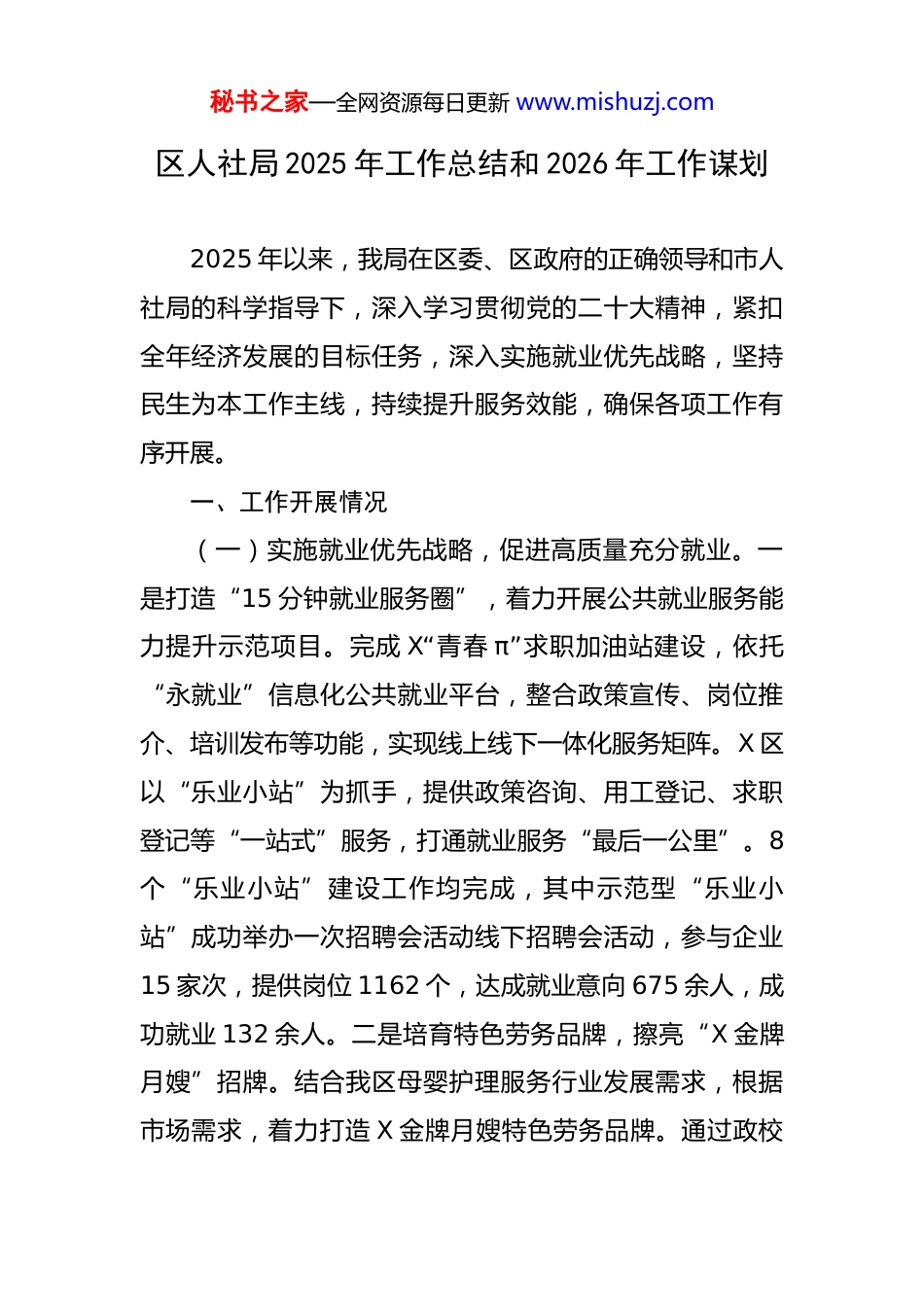 秘书之家—全网资源每日更新 www.mishuzj.com区人社局 2025 年工作总结和 2026 年工作谋划 2025 年以来,我局在区委、区政府的正确领导和市人社局的科学指导下,深入学习贯彻党的二十大精神,紧扣全年经济发展的目标任务,深入实施就业优先战略,坚持民生为本工作主线,持续提升服务效能,确保各项工作有序开展。一、工作开展情况(一)实施就业优先战略,促进高质量充分就业。一是打造“15 分钟就业服务圈”,着力开展公共就业服务能力提升示范项目。完成 X“青春 π”求职加油站建设,依托“永就业”信息化公共就业平台,整合政策宣传、岗位推介、培训发布等功能,实现线上线下一体化服务矩阵。X 区以“乐业小站”为抓手,提供政策咨询、用工登记、求职登记等“一站式”服务,打通就业服务“最后一公里”。8个“乐业小站”建设工作均完成,其中示范型“乐业小站”成功举办一次招聘会活动线下招聘会活动,参与企业15 家次,提供岗位 1162 个,达成就业意向 675 余人,成功就业 132 余人。二是培育特色劳务品牌,擦亮“X 金牌月嫂”招牌。结合我区母婴护理服务行业发展需求,根据市场需求,着力打造 X 金牌月嫂特色劳务品牌。通过政校秘书之家—全网资源每日更新 www.mishuzj.com企协同培养机制,实现每年培养育婴员、保育员等五类家政服务人员 200 人次以上。全年开展育婴师,保育员就业技能培训班 5 期共 200 人,取得相关职业技能等级证96.5%,就业率达 72.8%,实现“培训即就业”的无缝对接,月薪资平均达到 8800 元左右。三是以需求为导向,强化职业技能培训。深入企业进行摸底,详细掌握企业急需培训的工种、等级和人数,以及需纳入企业职业培训的农村转移劳动力人数、脱贫劳动力等重点就业群体情况。开展企业岗前技能培训 6 期,共 411 人,中草药种植培训 1期,共 50 人。紧扣社会热点和民众关切,开展 AI 智能、无人机培训 2 期,共 98 人。同时,紧盯就业者个人技能提升,开展电工、挖机、叉车技能培训 9 期,共 450 人。四是服务企业,多管齐下促进家门口就业。组织开展“春风行动”、“民营企业招聘月”等线上线下招聘活动 66 场次,提供就业岗位 16883 个,达成就业意向 8212 人。大力发展新就业形态,支持灵活就业,规范零工市场建设。每月 10 日、20 日定时开展常规招聘会,累计服务 107 余家次企业,市场搭建数字化平台,目前网站注册求职者1217 人,企业端入驻 107 家,网站投递简历数 5136份。建立“一对一”职业指导台账,侧重了解其劳动技能、文化素质、身体状况、家庭结构等情况,提供匹配度秘书之家—全网资源每日更新 www.mishuzj.com强的普工、保安、保洁等工种岗位,并及时回访。重点保障高校毕业生、农民工、退役军人、就业困难人员等群体就业,全区新增城镇就业 5293 人,城镇调查失业率均控制在 5.5%以内,新增农村劳动力转移就业 5100 人,公益性岗位安置就业困难人员和脱贫劳动力 413 人,发放公益性岗位补贴 385.9 万元。(二)加强基金监管,确保社保基金安全高效运行。一是扩面提质增效。深入实施全民参保计划,基本养老保险、失业保险、工伤保险参保人数分别达到 37.82 万人、2.65 万人、3.9 万人。全力提升社会保障水平,积极落实社保待遇调整机制,确保按时足额发放各项社保待遇。城乡居民基本养老保险待遇月人均水平提升至 185元。开展“相约九月”集中认证活动,通过集中时段对城乡居保领待人员进行生存认证,化解城乡居保暂停待遇人员难题。推进养老保险全国统筹衔接,稳妥做好渐进式延迟法定退休年龄改革实施工作。二是多措并举确保基金运行安全。加强社保基金监管,开展专项检查 2 次,异地交叉检查 1 次,确保基金安全可持续运行。部省下发基础信息数据治理 701 条、死亡疑点数据 5872 条、服刑疑点数据 398 条、供养亲属关系疑点信息 10 条,按照要求认真开展数据核查,没有发现疑点问题。持续开展政策学习和秘书之家—全网资源每日更新 www.mishuzj.com警示教育,以案释法、以案示警、以案明纪,时刻牢记基金安全是红线、底线、带电的高...