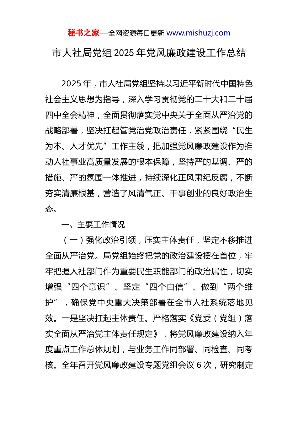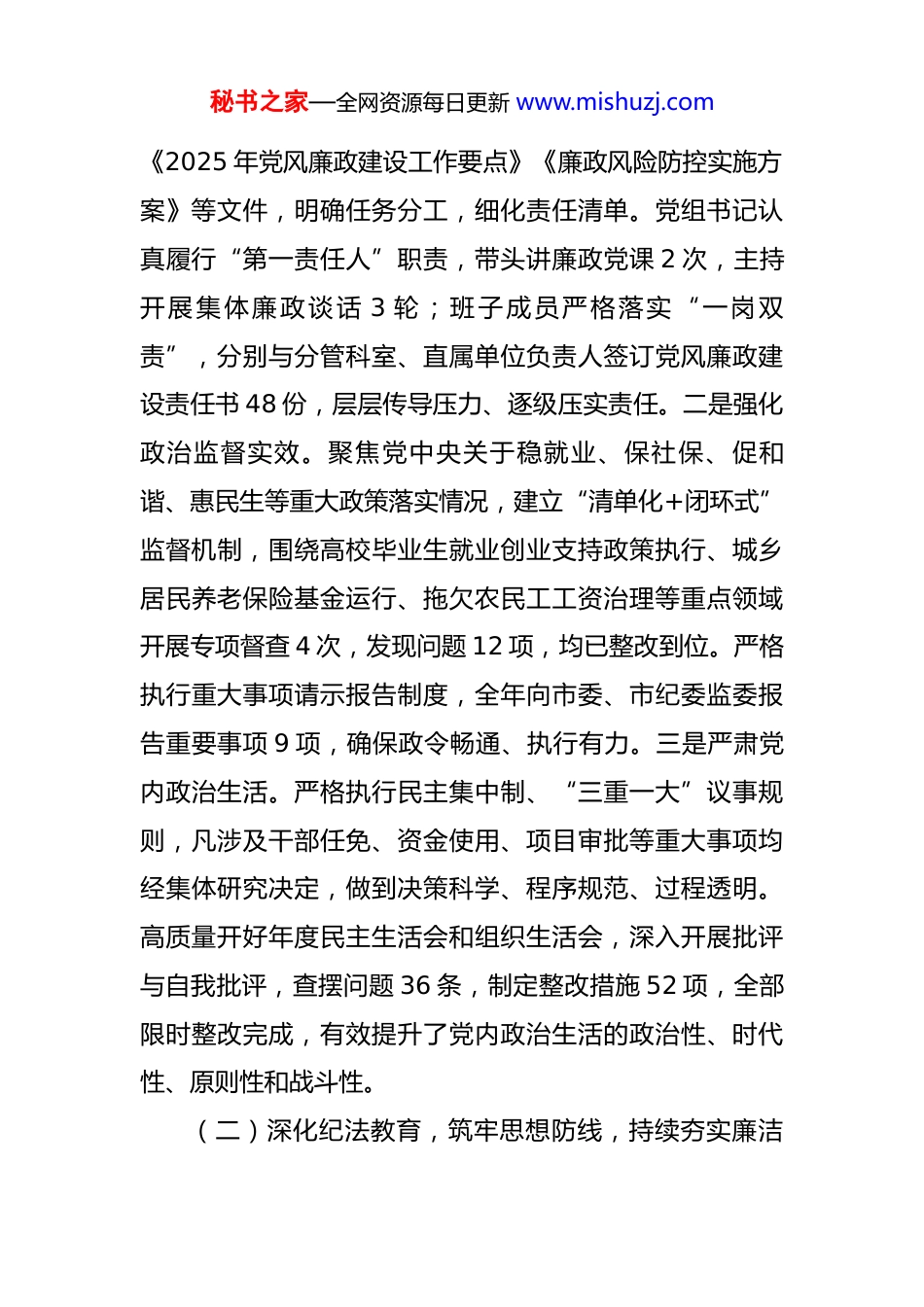 秘书之家—全网资源每日更新 www.mishuzj.com市人社局党组 2025 年党风廉政建设工作总结 2025 年,市人社局党组坚持以习近平新时代中国特色社会主义思想为指导,深入学习贯彻党的二十大和二十届四中全会精神,全面贯彻落实党中央关于全面从严治党的战略部署,坚决扛起管党治党政治责任,紧紧围绕“民生为本、人才优先”工作主线,把加强党风廉政建设作为推动人社事业高质量发展的根本保障,坚持严的基调、严的措施、严的氛围一体推进,持续深化正风肃纪反腐,不断夯实清廉根基,营造了风清气正、干事创业的良好政治生态。一、主要工作情况(一)强化政治引领,压实主体责任,坚定不移推进全面从严治党。局党组始终把党的政治建设摆在首位,牢牢把握人社部门作为重要民生职能部门的政治属性,切实增强“四个意识”、坚定“四个自信”、做到“两个维护”,确保党中央重大决策部署在全市人社系统落地见效。一是坚决扛起主体责任。严格落实《党委(党组)落实全面从严治党主体责任规定》,将党风廉政建设纳入年度重点工作总体规划,与业务工作同部署、同检查、同考核。全年召开党风廉政建设专题党组会议 6 次,研究制定秘书之家—全网资源每日更新 www.mishuzj.com《2025 年党风廉政建设工作要点》《廉政风险防控实施方案》等文件,明确任务分工,细化责任清单。党组书记认真履行“第一责任人”职责,带头讲廉政党课 2 次,主持开展集体廉政谈话 3 轮;班子成员严格落实“一岗双责”,分别与分管科室、直属单位负责人签订党风廉政建设责任书 48 份,层层传导压力、逐级压实责任。二是强化政治监督实效。聚焦党中央关于稳就业、保社保、促和谐、惠民生等重大政策落实情况,建立“清单化+闭环式”监督机制,围绕高校毕业生就业创业支持政策执行、城乡居民养老保险基金运行、拖欠农民工工资治理等重点领域开展专项督查 4 次,发现问题 12 项,均已整改到位。严格执行重大事项请示报告制度,全年向市委、市纪委监委报告重要事项 9 项,确保政令畅通、执行有力。三是严肃党内政治生活。严格执行民主集中制、“三重一大”议事规则,凡涉及干部任免、资金使用、项目审批等重大事项均经集体研究决定,做到决策科学、程序规范、过程透明。高质量开好年度民主生活会和组织生活会,深入开展批评与自我批评,查摆问题 36 条,制定整改措施 52 项,全部限时整改完成,有效提升了党内政治生活的政治性、时代性、原则性和战斗性。(二)深化纪法教育,筑牢思想防线,持续夯实廉洁秘书之家—全网资源每日更新 www.mishuzj.com从政根基。坚持教育在先、预防为主,把思想政治建设和纪律规矩教育贯穿干部成长全过程,着力构建不敢腐、不能腐、不想腐的长效机制。一是展示开展深入贯彻学习教育的教育。坚持学查改一体推进,组织开展“纪律教育月”活动,采取集中学习、专题研讨、辅导讲座、知识测试等多种形式,实现党员干部全覆盖。全年组织集中学习12 次,专题研讨 4 场,举办党纪知识竞赛 1 次,参与率达100%。将党纪教育纳入干部培训必修课程,在新进人员岗前培训、中层干部轮训中设置廉政专题模块,切实增强纪律意识和底线思维。二是用好警示教育“活教材”。坚持用身边事教育身边人,选取近年来全国及省内人社系统发生的典型违纪违法案例,编印《人社系统廉政警示录》200册,发放至各科室、基层单位。组织观看《零容忍》《永远吹冲锋号》《警钟长鸣》等专题片 5 部,开展警示教育大会 3 次,通报典型案例 18 起,受教育人数达 600 余人次。组织党员干部赴市廉政教育基地开展现场教学 2 批次,实地接受廉政洗礼,真正让警钟长鸣于耳、敬畏常驻于心。三是弘扬新时代廉洁文化。持续推进“清风人社”品牌建设,打造具有人社特色的廉洁文化阵地。在机关办公区域设立廉政文化墙、设置“清廉格言”展板,在电子屏滚动播放廉政标语;利用微信公众号、内部 OA 系统定期秘书之家—全网资源每日更新 www.mishuzj.com推送廉政提醒、家风故事;组织开展“家庭助廉”座谈会 2次,发放《致干部职工家属的一封廉洁信》,倡导清廉家风,构筑家庭反腐防线。结合主题教育常...