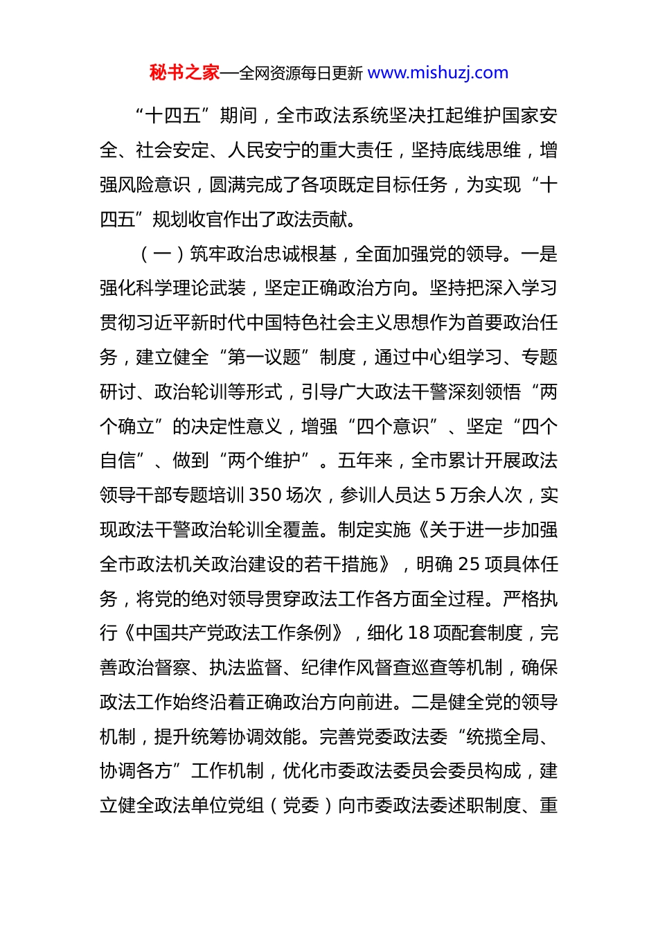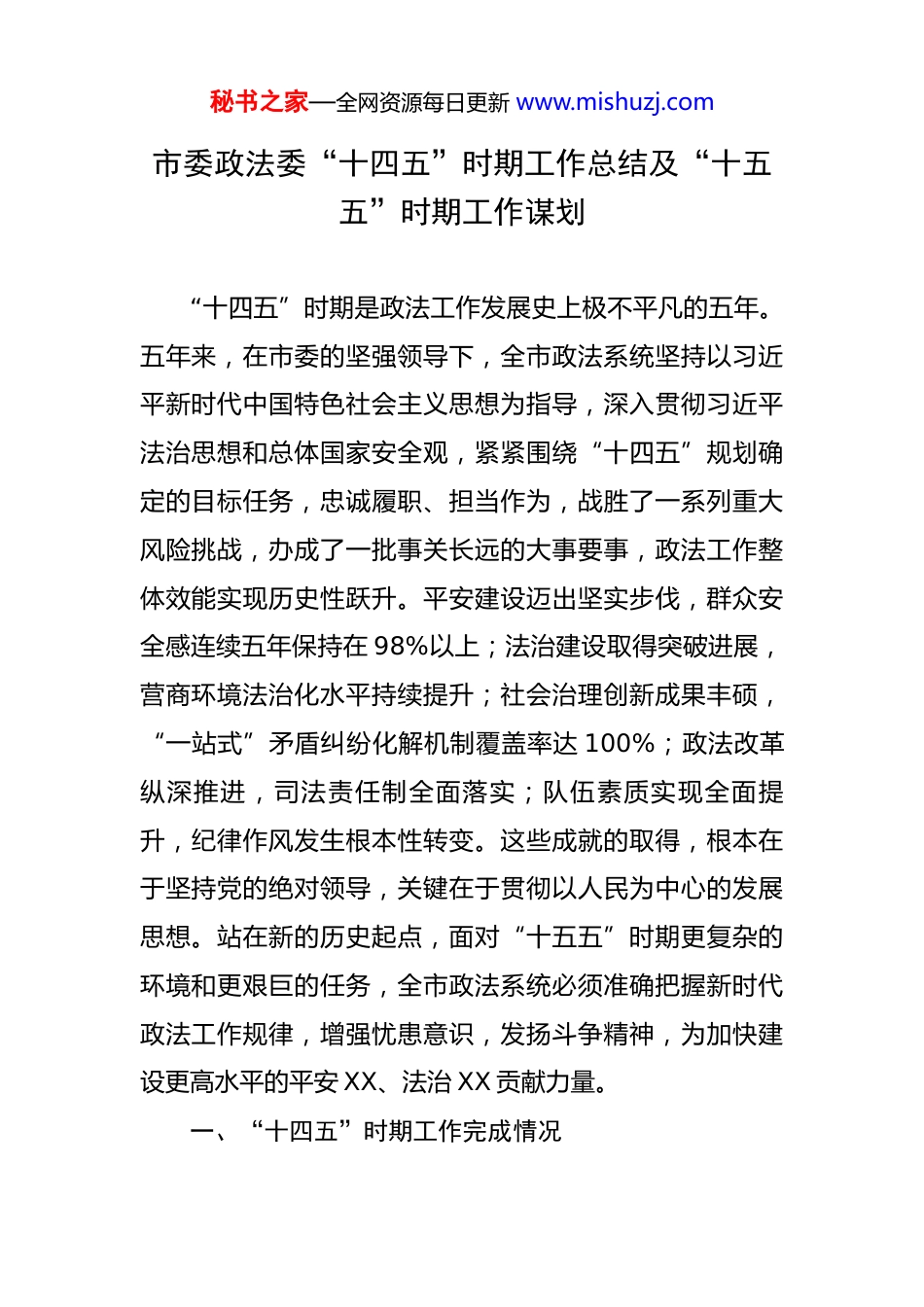 秘书之家—全网资源每日更新 www.mishuzj.com市委政法委“十四五”时期工作总结及“十五五”时期工作谋划 “十四五”时期是政法工作发展史上极不平凡的五年。五年来,在市委的坚强领导下,全市政法系统坚持以习近平新时代中国特色社会主义思想为指导,深入贯彻习近平法治思想和总体国家安全观,紧紧围绕“十四五”规划确定的目标任务,忠诚履职、担当作为,战胜了一系列重大风险挑战,办成了一批事关长远的大事要事,政法工作整体效能实现历史性跃升。平安建设迈出坚实步伐,群众安全感连续五年保持在 98%以上;法治建设取得突破进展,营商环境法治化水平持续提升;社会治理创新成果丰硕,“一站式”矛盾纠纷化解机制覆盖率达 100%;政法改革纵深推进,司法责任制全面落实;队伍素质实现全面提升,纪律作风发生根本性转变。这些成就的取得,根本在于坚持党的绝对领导,关键在于贯彻以人民为中心的发展思想。站在新的历史起点,面对“十五五”时期更复杂的环境和更艰巨的任务,全市政法系统必须准确把握新时代政法工作规律,增强忧患意识,发扬斗争精神,为加快建设更高水平的平安 XX、法治 XX 贡献力量。一、“十四五”时期工作完成情况秘书之家—全网资源每日更新 www.mishuzj.com“十四五”期间,全市政法系统坚决扛起维护国家安全、社会安定、人民安宁的重大责任,坚持底线思维,增强风险意识,圆满完成了各项既定目标任务,为实现“十四五”规划收官作出了政法贡献。(一)筑牢政治忠诚根基,全面加强党的领导。一是强化科学理论武装,坚定正确政治方向。坚持把深入学习贯彻习近平新时代中国特色社会主义思想作为首要政治任务,建立健全“第一议题”制度,通过中心组学习、专题研讨、政治轮训等形式,引导广大政法干警深刻领悟“两个确立”的决定性意义,增强“四个意识”、坚定“四个自信”、做到“两个维护”。五年来,全市累计开展政法领导干部专题培训 350 场次,参训人员达 5 万余人次,实现政法干警政治轮训全覆盖。制定实施《关于进一步加强全市政法机关政治建设的若干措施》,明确 25 项具体任务,将党的绝对领导贯穿政法工作各方面全过程。严格执行《中国共产党政法工作条例》,细化 18 项配套制度,完善政治督察、执法监督、纪律作风督查巡查等机制,确保政法工作始终沿着正确政治方向前进。二是健全党的领导机制,提升统筹协调效能。完善党委政法委“统揽全局、协调各方”工作机制,优化市委政法委员会委员构成,建立健全政法单位党组(党委)向市委政法委述职制度、重秘书之家—全网资源每日更新 www.mishuzj.com大事项请示报告制度,制定《市委政法委工作规则》和《市委政法委全体会议议事规则》,明确 12 类重大事项必须事前请示报告。五年来,市委政法委共召开全体会议 42次,研究重要议题 186 项,制定规范性文件 67 件,有效加强对政法工作的统筹协调。创新建立政法工作跨部门协调机制,针对扫黑除恶、打击跨境犯罪、市域社会治理等重点工作,组建 15 个专项工作组,打破部门壁垒,形成工作合力。健全完善政法机关与纪检监察机关协作配合机制,在线索移送、案件通报、协同办案等方面实现无缝衔接。三是夯实基层组织基础,建强政法战斗堡垒。牢固树立大抓基层的鲜明导向,全面加强政法单位基层党组织标准化规范化建设,实施“政法党建示范工程”,五年内打造 100 个政法基层党建示范点。优化政法单位基层党组织设置,在审判团队、检察办案组、派出所、司法所等基本单元实现党组织全覆盖,在专案组、专案临时机构普遍设立临时党支部。严格党的组织生活制度,制定《全市政法机关基层党组织生活规范化指引》,明确“三会一课”、民主评议党员等 10 项标准。加强政法系统党员教育管理,实施党员先锋岗、责任区制度,开展“亮身份、当先锋、树形象”活动,充分发挥党员干警在执法办案、服务群众、应急处突中的先锋模范作用。秘书之家—全网资源每日更新 www.mishuzj.com(二)捍卫国家安全防线,维护社会大局稳定。一是严密防范政治风险,坚决捍卫政权安全。坚决贯彻总体国家安全观,始终保持“时时放心不下”的责任感,健全国家安...