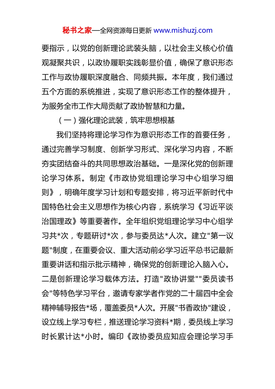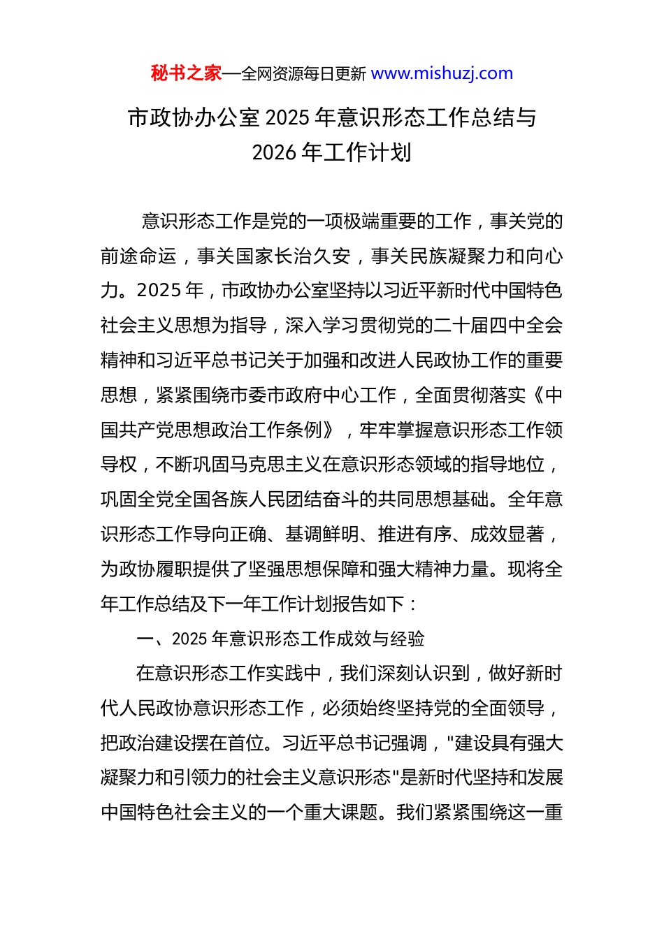 秘书之家—全网资源每日更新 www.mishuzj.com市政协办公室 2025 年意识形态工作总结与2026 年工作计划 意识形态工作是党的一项极端重要的工作,事关党的前途命运,事关国家长治久安,事关民族凝聚力和向心力。2025 年,市政协办公室坚持以习近平新时代中国特色社会主义思想为指导,深入学习贯彻党的二十届四中全会精神和习近平总书记关于加强和改进人民政协工作的重要思想,紧紧围绕市委市政府中心工作,全面贯彻落实《中国共产党思想政治工作条例》,牢牢掌握意识形态工作领导权,不断巩固马克思主义在意识形态领域的指导地位,巩固全党全国各族人民团结奋斗的共同思想基础。全年意识形态工作导向正确、基调鲜明、推进有序、成效显著,为政协履职提供了坚强思想保障和强大精神力量。现将全年工作总结及下一年工作计划报告如下:一、2025 年意识形态工作成效与经验在意识形态工作实践中,我们深刻认识到,做好新时代人民政协意识形态工作,必须始终坚持党的全面领导,把政治建设摆在首位。习近平总书记强调,"建设具有强大凝聚力和引领力的社会主义意识形态"是新时代坚持和发展中国特色社会主义的一个重大课题。我们紧紧围绕这一重秘书之家—全网资源每日更新 www.mishuzj.com要指示,以党的创新理论武装头脑,以社会主义核心价值观凝聚共识,以政协履职实践彰显价值,确保了意识形态工作与政协履职深度融合、同频共振。本年度,我们通过五个方面的系统推进,实现了意识形态工作的整体提升,为服务全市工作大局贡献了政协智慧和力量。(一)强化理论武装,筑牢思想根基我们坚持将理论学习作为意识形态工作的首要任务,通过完善学习制度、创新学习形式、深化学习内容,不断夯实团结奋斗的共同思想政治基础。一是深化党的创新理论学习体系。制定《市政协党组理论学习中心组学习细则》,明确年度学习计划和专题安排,将习近平新时代中国特色社会主义思想作为核心内容,系统学习《习近平谈治国理政》等重要著作。全年组织党组理论学习中心组学习共*次,专题研讨*次,参与委员达*人次。建立"第一议题"制度,在重要会议、重大活动前必学习近平总书记最新重要讲话和指示批示精神,确保党的创新理论入脑入心。二是创新理论学习载体方法。打造"政协讲堂""委员读书会"等特色学习平台,邀请专家学者作党的二十届四中全会精神辅导报告*场,覆盖委员*人次。开展"书香政协"建设,设立线上学习专栏,推送理论学习资料*期,委员线上学习时长累计达*小时。编印《政协委员应知应会理论学习手秘书之家—全网资源每日更新 www.mishuzj.com册》,发放*余册,实现委员理论学习全覆盖。三是强化学用结合成果转化。建立委员理论学习与实践结合评价机制,将理论学习成果转化为提案、社情民意信息等履职实践。全年委员提交理论学习心得体会*篇,形成高质量调研报告*份,其中*份获市委市政府领导批示。开展"理论指导实践"典型案例征集活动,评选优秀案例*个,通过《政协工作交流》刊发推广,有效推动理论学习成果向履职实效转化。(二)把握正确导向,巩固舆论阵地我们始终坚持党管宣传、党管意识形态、党管媒体原则,牢牢把握正确舆论导向,不断巩固和壮大主流思想舆论。一是构建全媒体宣传格局。优化市政协门户网站、微信公众号、《政协天地》杂志等宣传平台,开设"委员风采""协商议事"等专题专栏,全年发布稿件*篇,总阅读量突破*万次。与*日报、*电视台等主流媒体建立战略合作,推出"政协视点"专版*期,制作"委员话民生"专题节目*期,有效扩大政协工作影响力。建立网络舆情监测分析机制,实行 24 小时值班制度,及时发现处置涉政协调性负面信息*条,确保网络空间清朗。二是深化主题宣传引领。组织开展"辉煌历程·政协见证"系列宣传活动,举办图片展*场,征集文史资料*篇,参观人次达*人。开展"委员故事汇"活动,秘书之家—全网资源每日更新 www.mishuzj.com宣传优秀委员履职事迹*人次,制作先进事迹展板*块,在全市*个委员工作室巡回展示,激发委员履职热情。三是提升新闻发布质量。完善新闻发布制度,规范重要活动报道流程,召开新闻发布会*场,发布重要履职成果*项。建立宣传内容三级审核机...