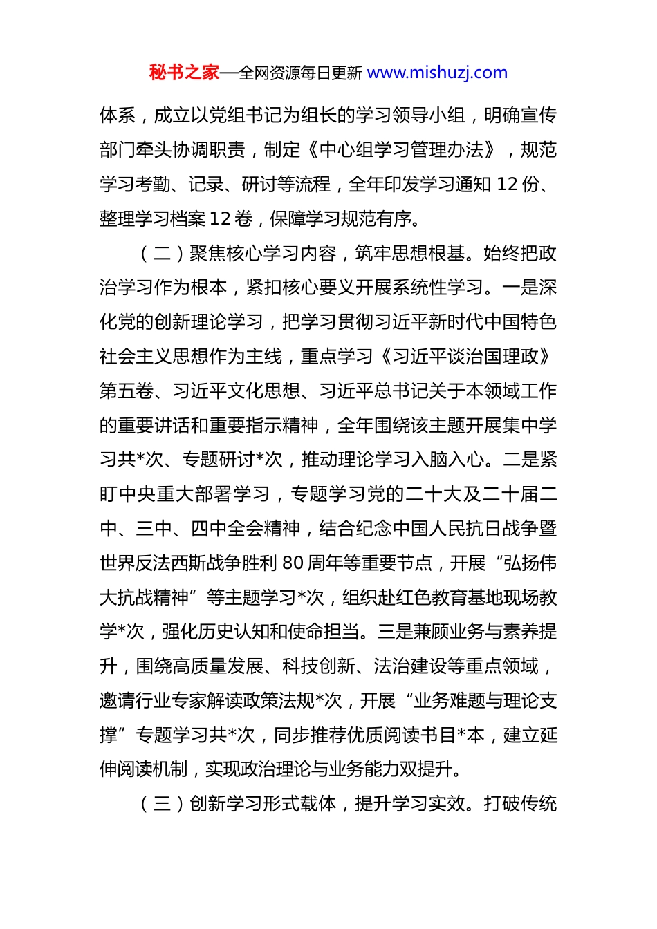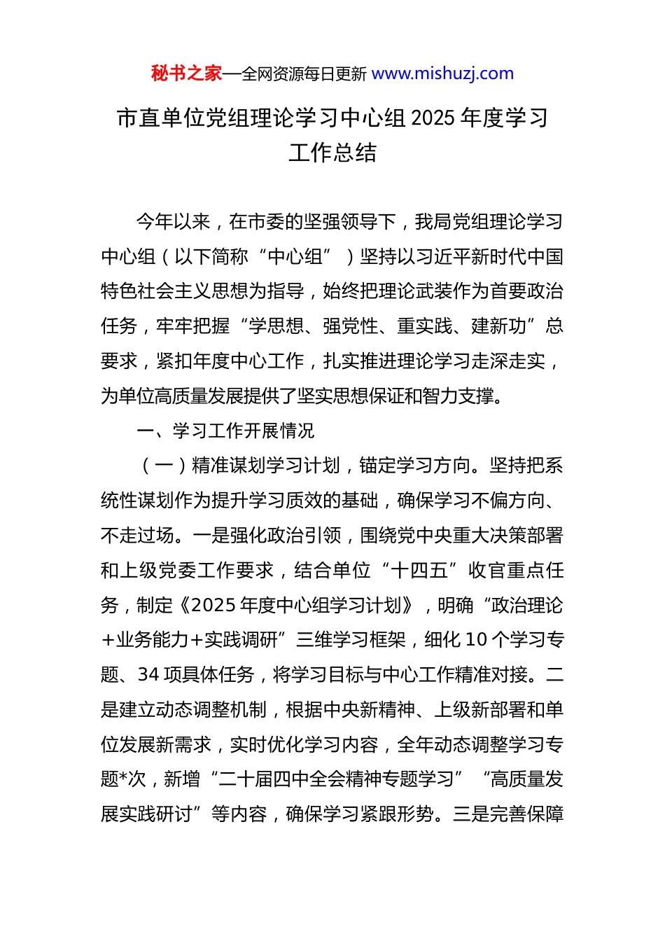 秘书之家—全网资源每日更新 www.mishuzj.com市直单位党组理论学习中心组 2025 年度学习工作总结 今年以来,在市委的坚强领导下,我局党组理论学习中心组(以下简称“中心组”)坚持以习近平新时代中国特色社会主义思想为指导,始终把理论武装作为首要政治任务,牢牢把握“学思想、强党性、重实践、建新功”总要求,紧扣年度中心工作,扎实推进理论学习走深走实,为单位高质量发展提供了坚实思想保证和智力支撑。一、学习工作开展情况(一)精准谋划学习计划,锚定学习方向。坚持把系统性谋划作为提升学习质效的基础,确保学习不偏方向、不走过场。一是强化政治引领,围绕党中央重大决策部署和上级党委工作要求,结合单位“十四五”收官重点任务,制定《2025 年度中心组学习计划》,明确“政治理论+业务能力+实践调研”三维学习框架,细化 10 个学习专题、34 项具体任务,将学习目标与中心工作精准对接。二是建立动态调整机制,根据中央新精神、上级新部署和单位发展新需求,实时优化学习内容,全年动态调整学习专题*次,新增“二十届四中全会精神专题学习”“高质量发展实践研讨”等内容,确保学习紧跟形势。三是完善保障秘书之家—全网资源每日更新 www.mishuzj.com体系,成立以党组书记为组长的学习领导小组,明确宣传部门牵头协调职责,制定《中心组学习管理办法》,规范学习考勤、记录、研讨等流程,全年印发学习通知 12 份、整理学习档案 12 卷,保障学习规范有序。(二)聚焦核心学习内容,筑牢思想根基。始终把政治学习作为根本,紧扣核心要义开展系统性学习。一是深化党的创新理论学习,把学习贯彻习近平新时代中国特色社会主义思想作为主线,重点学习《习近平谈治国理政》第五卷、习近平文化思想、习近平总书记关于本领域工作的重要讲话和重要指示精神,全年围绕该主题开展集中学习共*次、专题研讨*次,推动理论学习入脑入心。二是紧盯中央重大部署学习,专题学习党的二十大及二十届二中、三中、四中全会精神,结合纪念中国人民抗日战争暨世界反法西斯战争胜利 80 周年等重要节点,开展“弘扬伟大抗战精神”等主题学习*次,组织赴红色教育基地现场教学*次,强化历史认知和使命担当。三是兼顾业务与素养提升,围绕高质量发展、科技创新、法治建设等重点领域,邀请行业专家解读政策法规*次,开展“业务难题与理论支撑”专题学习共*次,同步推荐优质阅读书目*本,建立延伸阅读机制,实现政治理论与业务能力双提升。(三)创新学习形式载体,提升学习实效。打破传统秘书之家—全网资源每日更新 www.mishuzj.com学习模式,推动“守正创新”融合发力。一是严格落实规定动作,坚持“第一议题”制度,全年党组会议“第一议题”学习共*次;中心组开展集中学习共*次,其中专题学习共*次,中心组成员带头领学*次,撰写高质量心得体会*篇。二是丰富拓展学习场景,打造“线上+线下”学习矩阵,线下举办“强素质·作表率”读书活动*场、专题辅导讲座*期;线上依托“两微一端”开设“中心组学习专栏”,推送解读文章*篇,组织线上答题*次。创新“现场调研+集中研讨”模式,中心组成员深入基层一线调研*次,围绕项目建设、民生服务等实地观摩,形成调研报告*份,在集中学习中专题交流研讨。三是强化互动交流提升,推行“重点发言+全员研讨+随机互动”机制,每次学习安排*名分管领导结合工作实际重点发言,其他成员书面交流,随机提问互动*次;联合*兄弟单位开展中心组联学活动*次,借鉴先进经验*条,拓宽学习视野。(四)强化学习成果转化,推动学用结合。坚持学以致用导向,建立“学习—研讨—实践”转化链条。一是紧扣中心工作破解难题,围绕单位年度*项重点任务,开展“理论学习助攻坚”专题研讨*次,将学习成果转化为破解发展瓶颈的举措,推动*项历史遗留问题解决、*个重点项目落地。二是健全转化落实机制,建立学习成果转化台秘书之家—全网资源每日更新 www.mishuzj.com账,对研讨中形成的*条意见建议分类梳理,明确责任部门和完成时限,全年跟踪督办完成*项,转化率达*%。三是带动全员学习提升,中心组成员落实“一岗双责”,带头到分管部门、联系支部宣讲*场,...