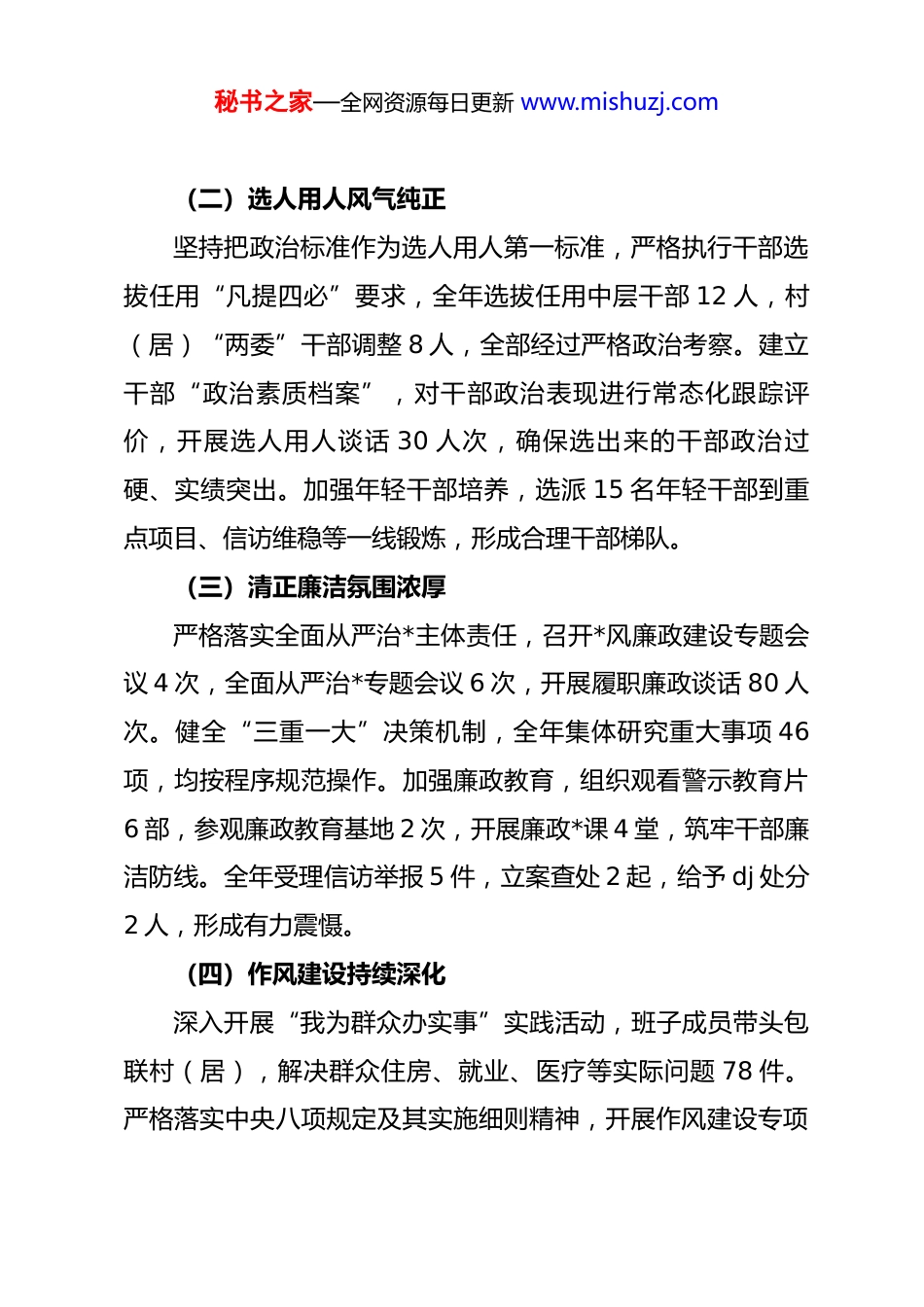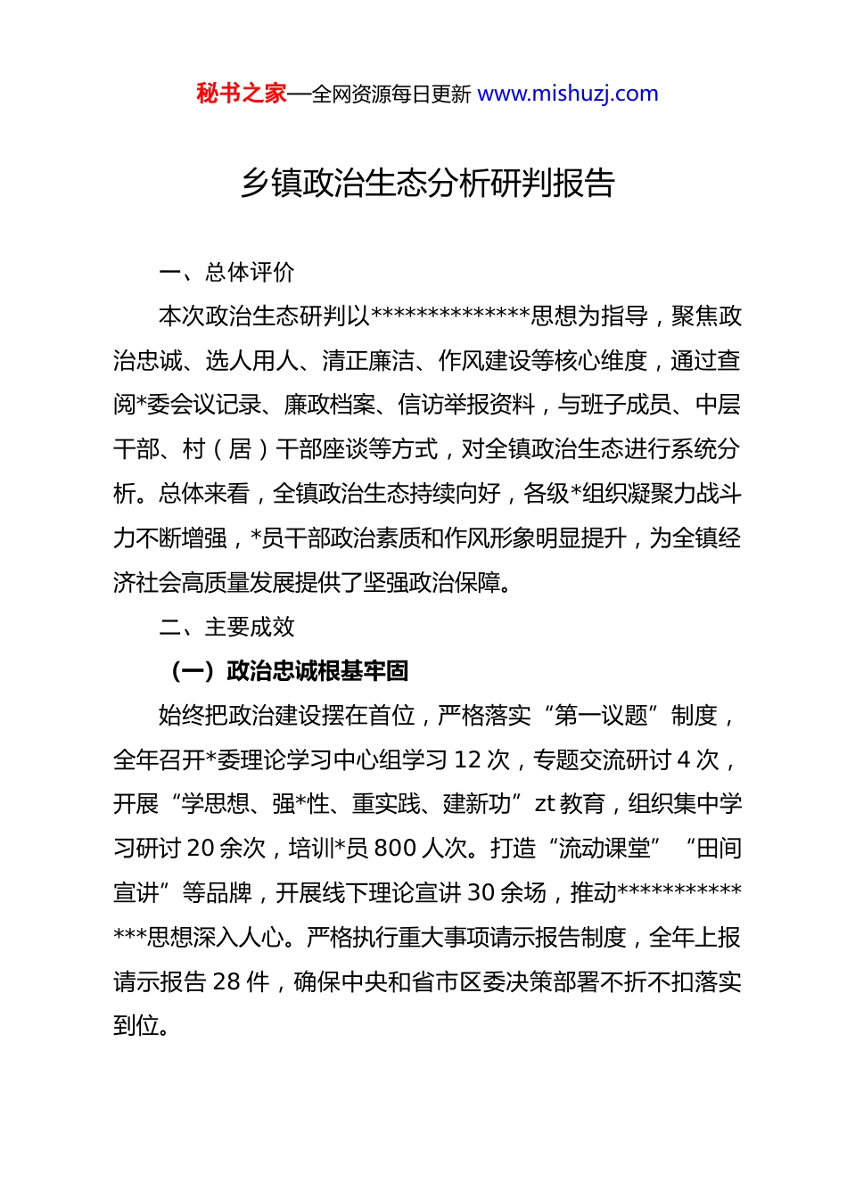 秘书之家—全网资源每日更新 www.mishuzj.com乡镇政治生态分析研判报告一、总体评价本次政治生态研判以**************思想为指导,聚焦政治忠诚、选人用人、清正廉洁、作风建设等核心维度,通过查阅*委会议记录、廉政档案、信访举报资料,与班子成员、中层干部、村(居)干部座谈等方式,对全镇政治生态进行系统分析。总体来看,全镇政治生态持续向好,各级*组织凝聚力战斗力不断增强,*员干部政治素质和作风形象明显提升,为全镇经济社会高质量发展提供了坚强政治保障。二、主要成效(一)政治忠诚根基牢固始终把政治建设摆在首位,严格落实“第一议题”制度,全年召开*委理论学习中心组学习 12 次,专题交流研讨 4 次,开展“学思想、强*性、重实践、建新功”zt 教育,组织集中学习研讨 20 余次,培训*员 800 人次。打造“流动课堂”“田间宣讲”等品牌,开展线下理论宣讲 30 余场,推动**************思想深入人心。严格执行重大事项请示报告制度,全年上报请示报告 28 件,确保中央和省市区委决策部署不折不扣落实到位。秘书之家—全网资源每日更新 www.mishuzj.com(二)选人用人风气纯正坚持把政治标准作为选人用人第一标准,严格执行干部选拔任用“凡提四必”要求,全年选拔任用中层干部 12 人,村(居)“两委”干部调整 8 人,全部经过严格政治考察。建立干部“政治素质档案”,对干部政治表现进行常态化跟踪评价,开展选人用人谈话 30 人次,确保选出来的干部政治过硬、实绩突出。加强年轻干部培养,选派 15 名年轻干部到重点项目、信访维稳等一线锻炼,形成合理干部梯队。(三)清正廉洁氛围浓厚严格落实全面从严治*主体责任,召开*风廉政建设专题会议 4 次,全面从严治*专题会议 6 次,开展履职廉政谈话 80 人次。健全“三重一大”决策机制,全年集体研究重大事项 46项,均按程序规范操作。加强廉政教育,组织观看警示教育片6 部,参观廉政教育基地 2 次,开展廉政*课 4 堂,筑牢干部廉洁防线。全年受理信访举报 5 件,立案查处 2 起,给予 dj 处分2 人,形成有力震慑。(四)作风建设持续深化深入开展“我为群众办实事”实践活动,班子成员带头包联村(居),解决群众住房、就业、医疗等实际问题 78 件。严格落实中央八项规定及其实施细则精神,开展作风建设专项秘书之家—全网资源每日更新 www.mishuzj.com整治 3 次,查处形式主义、官僚主义问题 3 起,整改问题 15项。精简会议文件,全年会议数量同比减少 20%,文件数量同比减少 18%,基层负担明显减轻。三、突出问题(一)政治学习深度不足部分*员干部学习**************思想存在“浅尝辄止”现象,学习笔记流于形式,专题研讨发言缺乏深度,难以将理论学习与实际工作有效结合。少数村(居)支部学习组织不规范,“三会一课”学习内容单一,对政策文件解读不透彻,*员学习积极性不高。(二)选人用人精准度有待提升干部考察评价体系不够完善,对干部日常表现的跟踪了解不够全面,考察多集中在任职前,常态化考察机制不健全。年轻干部培养锻炼力度不足,部分年轻干部缺乏基层工作经验,解决复杂问题能力有待提升。少数村(居)干部选拔过程中,群众参与度不够高,民主测评流于形式。(三)廉政风险防控存在漏洞部分重点领域廉政风险排查不够全面,如工程项目建设、惠民资金发放等领域,风险防控措施不够具体,缺乏针对性。村级财务管理不够规范,个别村存在票据审核不严、资金使用秘书之家—全网资源每日更新 www.mishuzj.com不透明等问题。纪检监察队伍力量薄弱,村级纪检委员履职能力不足,难以有效发挥监督作用。(四)作风建设仍需加强少数干部存在“躺平”思想,工作积极性不高,面对难点工作推诿扯皮。形式主义、官僚主义问题仍有残留,部分工作重部署轻落实,检查考核注重材料归档,对实际成效关注不够。个别干部服务群众态度生硬,缺乏耐心,群众满意度不高。四、原因分析(一)思想认识不到位部分*组织书记对政治生态建设的重要性认识不足,认为抓经济发展是硬任务,政治生态建设是“软工作”,投入精力不够。少数*员干部*性修养弱化,缺乏政治责任...