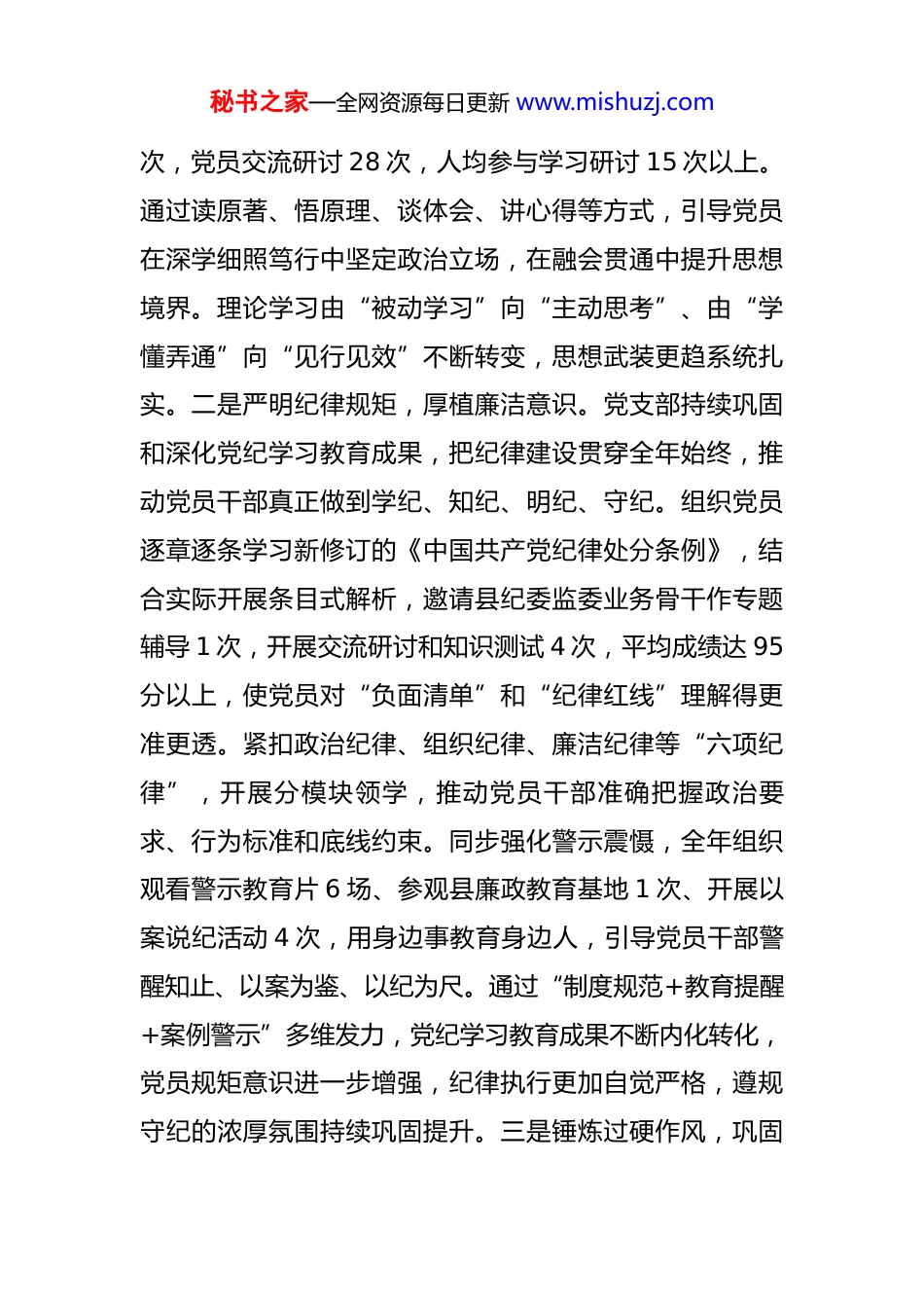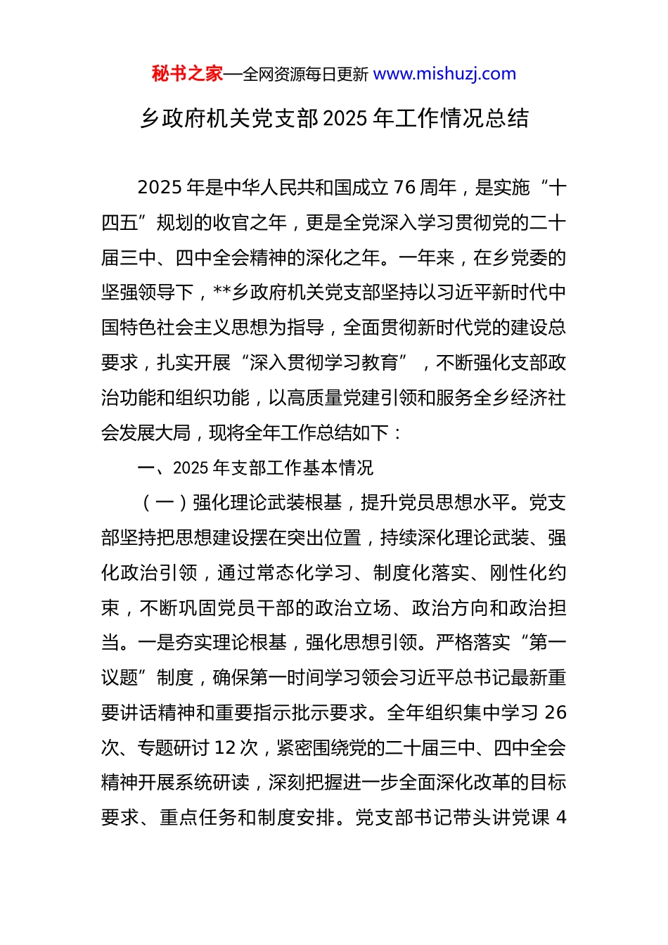 秘书之家—全网资源每日更新 www.mishuzj.com乡政府机关党支部 2025 年工作情况总结 2025 年是中华人民共和国成立 76 周年,是实施“十四五”规划的收官之年,更是全党深入学习贯彻党的二十届三中、四中全会精神的深化之年。一年来,在乡党委的坚强领导下,**乡政府机关党支部坚持以习近平新时代中国特色社会主义思想为指导,全面贯彻新时代党的建设总要求,扎实开展“深入贯彻学习教育”,不断强化支部政治功能和组织功能,以高质量党建引领和服务全乡经济社会发展大局,现将全年工作总结如下:一、2025 年支部工作基本情况(一)强化理论武装根基,提升党员思想水平。党支部坚持把思想建设摆在突出位置,持续深化理论武装、强化政治引领,通过常态化学习、制度化落实、刚性化约束,不断巩固党员干部的政治立场、政治方向和政治担当。一是夯实理论根基,强化思想引领。严格落实“第一议题”制度,确保第一时间学习领会习近平总书记最新重要讲话精神和重要指示批示要求。全年组织集中学习 26次、专题研讨 12 次,紧密围绕党的二十届三中、四中全会精神开展系统研读,深刻把握进一步全面深化改革的目标要求、重点任务和制度安排。党支部书记带头讲党课 4秘书之家—全网资源每日更新 www.mishuzj.com次,党员交流研讨 28 次,人均参与学习研讨 15 次以上。通过读原著、悟原理、谈体会、讲心得等方式,引导党员在深学细照笃行中坚定政治立场,在融会贯通中提升思想境界。理论学习由“被动学习”向“主动思考”、由“学懂弄通”向“见行见效”不断转变,思想武装更趋系统扎实。二是严明纪律规矩,厚植廉洁意识。党支部持续巩固和深化党纪学习教育成果,把纪律建设贯穿全年始终,推动党员干部真正做到学纪、知纪、明纪、守纪。组织党员逐章逐条学习新修订的《中国共产党纪律处分条例》,结合实际开展条目式解析,邀请县纪委监委业务骨干作专题辅导 1 次,开展交流研讨和知识测试 4 次,平均成绩达 95分以上,使党员对“负面清单”和“纪律红线”理解得更准更透。紧扣政治纪律、组织纪律、廉洁纪律等“六项纪律”,开展分模块领学,推动党员干部准确把握政治要求、行为标准和底线约束。同步强化警示震慑,全年组织观看警示教育片 6 场、参观县廉政教育基地 1 次、开展以案说纪活动 4 次,用身边事教育身边人,引导党员干部警醒知止、以案为鉴、以纪为尺。通过“制度规范+教育提醒+案例警示”多维发力,党纪学习教育成果不断内化转化,党员规矩意识进一步增强,纪律执行更加自觉严格,遵规守纪的浓厚氛围持续巩固提升。三是锤炼过硬作风,巩固秘书之家—全网资源每日更新 www.mishuzj.com优良风气。按照中央统一部署,全国两会后第一时间启动深入贯彻学习教育,制定时间表、明确任务书、压实责任链条,确保各项要求落地见效。组织党员认真学习《关于在全党开展深入贯彻学习教育的通知》,深入领会习近平总书记关于作风建设的重要论述,重温纪律规定及其要求,推动党员干部从思想深处树牢作风建设永远在路上的认识。紧扣作风领域突出问题,聚焦责任落实不严、群众观念不强、担当精神不足等方面开展对照检查,系统梳理问题清单、整改清单和责任清单“三张清单”,共查摆出 3大类 11 个具体问题,制定整改措施 25 条。组织开展重点督查、随机抽查、作风暗访 6 次,及时发现问题、督促整改,并对 2 名同志开展提醒谈话,促使党员干部防微渐、警钟常鸣。同步开展整改成效“回头看”2 次,逐项核验整改质量和完成情况,推动作风建设由集中整改向常态推进转化。(二)规范组织建设体系,夯实基层堡垒功能。党支部紧扣新时代党的建设总要求,始终把政治统领贯穿组织建设全过程,坚持以高标准严要求推动组织体系更加严密、运行机制更加规范、组织功能更加有力,持续夯实基层党建工作根基。一是规范政治生活,提升组织严肃性。严格执行新形势下党内政治生活若干准则,坚持民主集中秘书之家—全网资源每日更新 www.mishuzj.com制原则,重大事项按程序集体研究、集体决策,确保政治生活有力度、有规矩、有质量。全年召开党员大会 4 次、支委会 12 次、党...