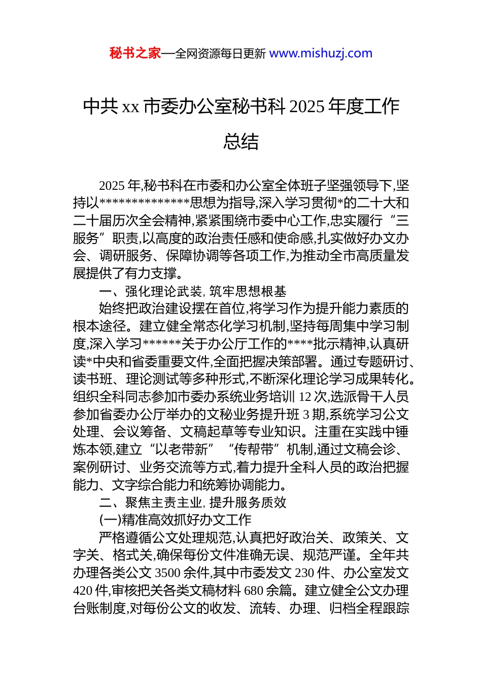 秘书之家—全网资源每日更新 www.mishuzj.com中共 xx 市委办公室秘书科 2025 年度工作总结2025 年,秘书科在市委和办公室全体班子坚强领导下,坚持以**************思想为指导,深入学习贯彻*的二十大和二十届历次全会精神,紧紧围绕市委中心工作,忠实履行“三服务”职责,以高度的政治责任感和使命感,扎实做好办文办会、调研服务、保障协调等各项工作,为推动全市高质量发展提供了有力支撑。一、强化理论武装,筑牢思想根基始终把政治建设摆在首位,将学习作为提升能力素质的根本途径。建立健全常态化学习机制,坚持每周集中学习制度,深入学习******关于办公厅工作的****批示精神,认真研读*中央和省委重要文件,全面把握决策部署。通过专题研讨、读书班、理论测试等多种形式,不断深化理论学习成果转化。组织全科同志参加市委办系统业务培训 12 次,选派骨干人员参加省委办公厅举办的文秘业务提升班 3 期,系统学习公文处理、会议筹备、文稿起草等专业知识。注重在实践中锤炼本领,建立“以老带新”“传帮带”机制,通过文稿会诊、案例研讨、业务交流等方式,着力提升全科人员的政治把握能力、文字综合能力和统筹协调能力。二、聚焦主责主业,提升服务质效(一)精准高效抓好办文工作严格遵循公文处理规范,认真把好政治关、政策关、文字关、格式关,确保每份文件准确无误、规范严谨。全年共办理各类公文 3500 余件,其中市委发文 230 件、办公室发文420 件,审核把关各类文稿材料 680 余篇。建立健全公文办理台账制度,对每份公文的收发、流转、办理、归档全程跟踪秘书之家—全网资源每日更新 www.mishuzj.com管理,做到件件有着落、事事有回音。完善公文审核机制,实行三级审核制度,从内容到格式逐一核查,全年未出现因文件质量问题被通报的情况。加强电子公文系统管理,优化办文流程,公文平均办理时限较 2024 年缩短 18%,办文效率明显提升。(二)精心周密做好办会工作坚持把会议服务作为重要职责,精心筹备市委全会、常委会、专题会等重要会议 130 余次。市委全会筹备工作中,提前两个月启动准备,从会议方案制定、文件材料起草、会场布置安排到后勤保障服务,逐项细化、逐一落实,确保会议圆满成功。常委会会议坚持提前协调议题、精准把握时间认真做好记录,会后及时整理会议纪要,梳理形成议决事项清单,建立督办台账,跟踪落实情况。全年共起草各类会议纪要、会议材料 520 余份,编发会议决策督办事项 128 项,反馈率达100%。创新会议服务方式,运用信息化手段提升会务效率,推行无纸化会议系统,既提高了工作效率,又践行了绿色办公理念。(三)用心用情做好调研保障围绕市委重点工作和领导关注的热点难点问题,精心做好调研服务保障工作。全年协助市委主要领导开展基层调研 92 次,涉及经济发展、民生保障、乡村振兴、生态保护、产业升级、基层治理等多个领域。调研前期,深入了解调研主题,收集相关资料,提前与调研点沟通对接,制定详细的调研方案。调研过程中,全程跟进服务,认真做好记录,及时收集反馈信息。调研结束后,迅速整理调研素材,协助起草调研报告15 篇,其中 5 篇报告中的意见建议被纳入市委重要决策。注重调研成果转化,建立调研问题清单,推动调研中发现的 45 个问题得到有效解决。加强日常信息报送工作,全年向上级报送各类信息 260 余条,被省委办公厅采用 32 条,被中办采用信息 4 条并获领导批示。三、坚守纪律底线,保持清廉本色秘书之家—全网资源每日更新 www.mishuzj.com认真落实全面从严治*要求,把纪律规矩挺在前面,持之以恒正风肃纪。深入学习贯彻中央八项规定及其实施细则精神,严格执行办公室各项规章制度,自觉接受监督。加强廉政教育,组织观看警示教育片 6 次,参加廉政*课学习 10 次,定期开展廉政谈心谈话,筑牢拒腐防变的思想防线。严格遵守**纪律,认真执行**法律法规,规范涉密文件管理,加强涉密载体使用,做到涉密不上网、上网不涉密。注重日常作风建设,坚决杜绝“庸懒散慢”等不良现象,严禁利用工作之便谋取私利,全科同志未发生违纪违规问题。强化廉洁自律意识,严格执行财务管理制度,坚持厉行节约,反对铺张浪费。落实“三公”经费管理规定,公务接待、公务用车...