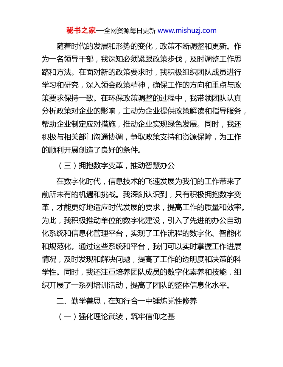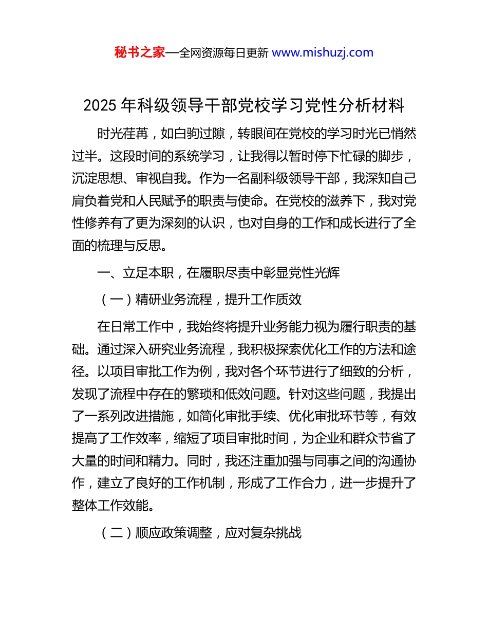 秘书之家—全网资源每日更新 www.mishuzj.com2025 年科级领导干部党校学习党性分析材料时光荏苒,如白驹过隙,转眼间在党校的学习时光已悄然过半。这段时间的系统学习,让我得以暂时停下忙碌的脚步,沉淀思想、审视自我。作为一名副科级领导干部,我深知自己肩负着党和人民赋予的职责与使命。在党校的滋养下,我对党性修养有了更为深刻的认识,也对自身的工作和成长进行了全面的梳理与反思。一、立足本职,在履职尽责中彰显党性光辉(一)精研业务流程,提升工作质效在日常工作中,我始终将提升业务能力视为履行职责的基础。通过深入研究业务流程,我积极探索优化工作的方法和途径。以项目审批工作为例,我对各个环节进行了细致的分析,发现了流程中存在的繁琐和低效问题。针对这些问题,我提出了一系列改进措施,如简化审批手续、优化审批环节等,有效提高了工作效率,缩短了项目审批时间,为企业和群众节省了大量的时间和精力。同时,我还注重加强与同事之间的沟通协作,建立了良好的工作机制,形成了工作合力,进一步提升了整体工作效能。(二)顺应政策调整,应对复杂挑战秘书之家—全网资源每日更新 www.mishuzj.com随着时代的发展和形势的变化,政策不断调整和更新。作为一名领导干部,我深知必须紧跟政策步伐,及时调整工作思路和方法。在面对新的政策要求时,我积极组织团队成员进行学习和研究,深入领会政策精神,确保工作的方向和重点与政策要求保持一致。在环保政策调整的过程中,我带领团队认真分析政策对企业的影响,主动为企业提供政策解读和指导服务,帮助企业制定应对措施,推动企业实现绿色发展。同时,我还积极与相关部门沟通协调,争取政策支持和资源保障,为工作的顺利开展创造了良好的条件。(三)拥抱数字变革,推动智慧办公在数字化时代,信息技术的飞速发展为我们的工作带来了前所未有的机遇和挑战。我深刻认识到,只有积极拥抱数字变革,才能更好地适应时代发展的要求,提高工作的质量和效率。为此,我积极推动单位的数字化建设,引入了先进的办公自动化系统和信息化管理平台,实现了工作流程的数字化、智能化和规范化。通过这些系统和平台,我们可以实时掌握工作进展情况,及时发现和解决问题,提高了工作的透明度和决策的科学性。同时,我还注重培养团队成员的数字化素养和技能,组织开展了一系列培训活动,提高了团队的整体信息化水平。二、勤学善思,在知行合一中锤炼党性修养(一)强化理论武装,筑牢信仰之基秘书之家—全网资源每日更新 www.mishuzj.com理论上的清醒是政治上坚定的前提。在党校学习期间,我系统学习了习近平新时代中国特色社会主义思想,深入领会了党的二十大精神和党的各项方针政策。通过学习,我进一步坚定了理想信念,增强了“四个意识”、坚定了“四个自信”、做到了“两个维护”。我深刻认识到,作为一名领导干部,必须始终保持对党的忠诚,坚定不移地贯彻党的路线方针政策,自觉在思想上、政治上、行动上同以习近平同志为核心的党中央保持高度一致。同时,我还注重将理论学习与实际工作相结合,用理论指导实践,在实践中检验理论,不断提高自己的政治素养和工作能力。(二)深化业务学习,练就过硬本领业务能力是领导干部履行职责的重要保障。为了不断提高自己的业务水平,我坚持学习专业知识,关注行业发展动态,积极参加各类培训和学习交流活动。在学习过程中,我注重理论联系实际,将所学知识运用到实际工作中,不断探索解决问题的新方法和新途径。我还注重向身边的同事和前辈学习,虚心请教他们的工作经验和方法,不断提高自己的综合素质和工作能力。通过不断学习和实践,我逐渐成为了业务工作的行家里手,能够独立承担和完成各项工作任务。(三)注重实践反思,总结经验规律秘书之家—全网资源每日更新 www.mishuzj.com实践是检验真理的唯一标准。在工作中,我注重对实践经验的总结和反思,不断探索工作的规律和方法。每次完成一项工作任务后,我都会对工作过程进行回顾和总结,分析工作中存在的问题和不足,总结成功的经验和做法。通过不断反思和总结,我逐渐掌握了工作的规律和方法,提高了工作的针对性和实效性...
