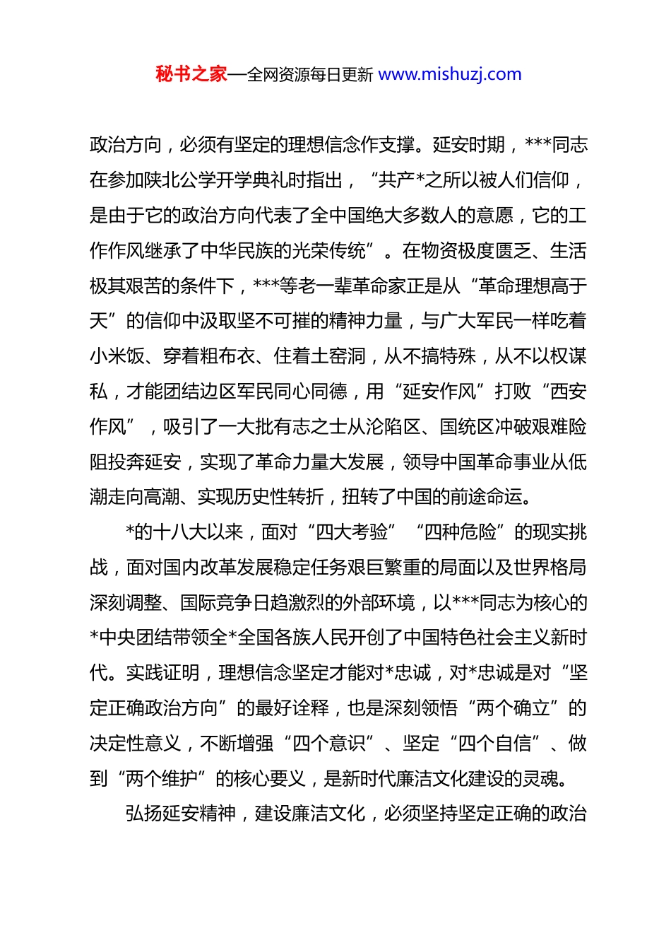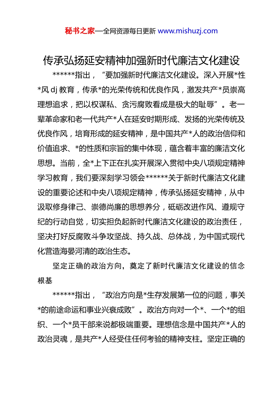 秘书之家—全网资源每日更新 www.mishuzj.com传承弘扬延安精神加强新时代廉洁文化建设******指出,“要加强新时代廉洁文化建设。深入开展*性*风 dj 教育,传承*的光荣传统和优良作风,激发共产*员崇高理想追求,把以权谋私、贪污腐败看成是极大的耻辱”。老一辈革命家和老一代共产*人在延安时期形成、发扬的光荣传统及优良作风,培育形成的延安精神,是中国共产*人的政治信仰和价值追求、*的性质和宗旨的集中体现,蕴含着丰富的廉洁文化思想。当前,全*上下正在扎实开展深入贯彻中央八项规定精神学习教育,我们要深刻学习领会******关于新时代廉洁文化建设的重要论述和中央八项规定精神,传承弘扬延安精神,从中汲取修身律己、崇德尚廉的思想养分,砥砺改进作风、遵规守纪的行动自觉,切实担负起新时代廉洁文化建设的政治责任,坚决打好反腐败斗争攻坚战、持久战、总体战,为中国式现代化营造海晏河清的政治生态。坚定正确的政治方向,奠定了新时代廉洁文化建设的信念根基******指出,“政治方向是*生存发展第一位的问题,事关*的前途命运和事业兴衰成败”。政治方向对一个*、一个*的组织、一个*员干部来说都极端重要。理想信念是中国共产*人的政治灵魂,是共产*人经受住任何考验的精神支柱。坚定正确的秘书之家—全网资源每日更新 www.mishuzj.com政治方向,必须有坚定的理想信念作支撑。延安时期,***同志在参加陕北公学开学典礼时指出,“共产*之所以被人们信仰,是由于它的政治方向代表了全中国绝大多数人的意愿,它的工作作风继承了中华民族的光荣传统”。在物资极度匮乏、生活极其艰苦的条件下,***等老一辈革命家正是从“革命理想高于天”的信仰中汲取坚不可摧的精神力量,与广大军民一样吃着小米饭、穿着粗布衣、住着土窑洞,从不搞特殊,从不以权谋私,才能团结边区军民同心同德,用“延安作风”打败“西安作风”,吸引了一大批有志之士从沦陷区、国统区冲破艰难险阻投奔延安,实现了革命力量大发展,领导中国革命事业从低潮走向高潮、实现历史性转折,扭转了中国的前途命运。*的十八大以来,面对“四大考验”“四种危险”的现实挑战,面对国内改革发展稳定任务艰巨繁重的局面以及世界格局深刻调整、国际竞争日趋激烈的外部环境,以***同志为核心的*中央团结带领全*全国各族人民开创了中国特色社会主义新时代。实践证明,理想信念坚定才能对*忠诚,对*忠诚是对“坚定正确政治方向”的最好诠释,也是深刻领悟“两个确立”的决定性意义,不断增强“四个意识”、坚定“四个自信”、做到“两个维护”的核心要义,是新时代廉洁文化建设的灵魂。弘扬延安精神,建设廉洁文化,必须坚持坚定正确的政治秘书之家—全网资源每日更新 www.mishuzj.com方向,把不忘初心、牢记使命作为加强*的建设的永恒课题和全体*员干部的终身课题,把学懂弄通做实**************思想作为长期的重大政治任务,深入学习贯彻******关于*的自我革命的重要思想、关于新时代廉洁文化建设的重要论述、关于加强*的作风建设的重要论述精神,切实筑牢信仰之基、补足精神之钙、把稳思想之舵,自觉从政治高度看待、从政治维度推动、从政治效度评价廉洁文化建设,自觉用理想信念滋养*性、用*性原则修养身心,更加注重以谨守作风小节来坚守政治大节、以严格作风要求来严明政治纪律和政治规矩、以防止作风问题来防范政治风险,不断增强政治定力、纪律定力、道德定力、抵腐定力,始终紧跟***令旗走、坚定按照***指示办、严格对标*中央部署干。解放思想、实事求是的思想路线,揭示了新时代廉洁文化建设的重要方法解放思想、实事求是是延安精神的精髓,凝结着辩证唯物主义和历史唯物主义的世界观、方法论。清正廉洁是马克思主义政 dj 设的本质要求,也是我们*永葆先进性和纯洁性的重要标志。延安时期,我们*着眼局部执政的实践要求,坚持和发展马克思主义廉洁观,把廉政建设摆在重要位置,颁布了《陕甘宁边区施政纲领》《陕甘宁边区政府惩治贪污暂行条例》等一秘书之家—全网资源每日更新 www.mishuzj.com系列法规文件,形成贪污腐化可耻、廉洁奉公光荣的廉政文化氛围,“解放区的天是明朗的天”“十个没有”成...