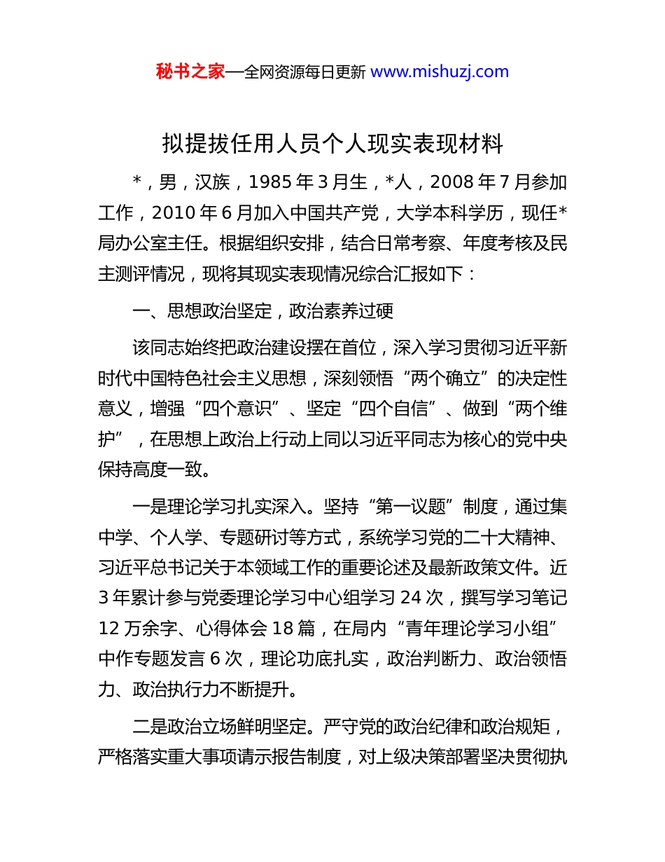 秘书之家—全网资源每日更新 www.mishuzj.com拟提拔任用人员个人现实表现材料*,男,汉族,1985 年 3 月生,*人,2008 年 7 月参加工作,2010 年 6 月加入中国共产党,大学本科学历,现任*局办公室主任。根据组织安排,结合日常考察、年度考核及民主测评情况,现将其现实表现情况综合汇报如下:一、思想政治坚定,政治素养过硬该同志始终把政治建设摆在首位,深入学习贯彻习近平新时代中国特色社会主义思想,深刻领悟“两个确立”的决定性意义,增强“四个意识”、坚定“四个自信”、做到“两个维护”,在思想上政治上行动上同以习近平同志为核心的党中央保持高度一致。一是理论学习扎实深入。坚持“第一议题”制度,通过集中学、个人学、专题研讨等方式,系统学习党的二十大精神、习近平总书记关于本领域工作的重要论述及最新政策文件。近3 年累计参与党委理论学习中心组学习 24 次,撰写学习笔记12 万余字、心得体会 18 篇,在局内“青年理论学习小组”中作专题发言 6 次,理论功底扎实,政治判断力、政治领悟力、政治执行力不断提升。二是政治立场鲜明坚定。严守党的政治纪律和政治规矩,严格落实重大事项请示报告制度,对上级决策部署坚决贯彻执秘书之家—全网资源每日更新 www.mishuzj.com行,无阳奉阴违、自行其是等问题。在疫情防控、防汛救灾等重大考验中,始终站在一线、靠前指挥,以实际行动践行对党忠诚。2022 年*市突发疫情期间,作为局疫情防控专班副组长,连续驻点值守 15 天,统筹协调物资调配、人员排查等工作,确保全局 300 余名干部职工“零感染”,相关做法被市委组织部作为“党员先锋案例”推广。三是大局意识突出强化。自觉将个人工作融入全局发展,主动对标“十四五”规划及局年度重点任务,牵头制定《办公室服务保障全局中心工作清单》,明确“文会办理、督查督办、综合协调”三大核心职责,推动办公室从“事务型”向“参谋型”转变。2023 年围绕“优化营商环境”专项行动,组织开展“我为企业解难题”调研,形成《关于简化企业审批流程的建议》,被局党组采纳并转化为 3 项具体改革措施,获市政府主要领导批示肯定。二、工作能力突出,实绩成效显著该同志自 2020 年任办公室主任以来,立足“中枢”定位,统筹协调、参谋辅政、服务保障能力全面过硬,推动办公室工作连续 3 年在全局年度考核中获评“优秀等次”,个人 2021年、2023 年两次记“个人三等功”。(一)统筹协调能力强,运转保障高效有序秘书之家—全网资源每日更新 www.mishuzj.com坚持“严谨、规范、高效”原则,建立“周调度、月总结季复盘”工作机制,优化文电办理、会议组织、公务接待等12 项流程。近 3 年累计处理文件 4200 余件,做到“收文当日分办、办件限时办结”,文件运转及时率、准确率均达100%;组织局务会、党组会等重要会议 180 场次,从方案制定、材料准备到会风会纪全程跟踪,实现“零差错”;牵头完成局机关搬迁、新办公区信息化建设等重大任务,协调解决办公设备采购、网络调试等问题 30 余项,保障全局 2023 年9 月顺利入驻新址,相关经验在市直机关后勤工作会上作交流。(二)参谋辅政水平高,服务决策精准有力聚焦局中心工作,建立“问题收集—专题调研—成果转化”闭环机制,近 3 年牵头完成《基层单位人才队伍建设现状及对策》《重点项目推进中的堵点分析》等调研课题 12 项,其中《关于加强跨部门协同联动的建议》被纳入局年度工作要点,推动建立与发改、财政等 5 部门的常态化沟通机制;创新“信息快报”制度,围绕政策动态、基层诉求等编发简报68 期,其中 12 期获市领导批示,为上级决策提供了有力参考。2022 年在“*产业高质量发展”专题调研中,带队走访企业 56 家,形成《产业链关键环节补链强链建议》,推动 3个重点项目纳入省级规划,带动投资超 20 亿元。(三)督办落实力度大,重点任务落地见效秘书之家—全网资源每日更新 www.mishuzj.com严格落实“清单化管理、项目化推进”要求,建立《局重点工作督办台账》,将年度 12 类 58 项任务分解到责任科室、明确到具体时限,实行“周提醒、...