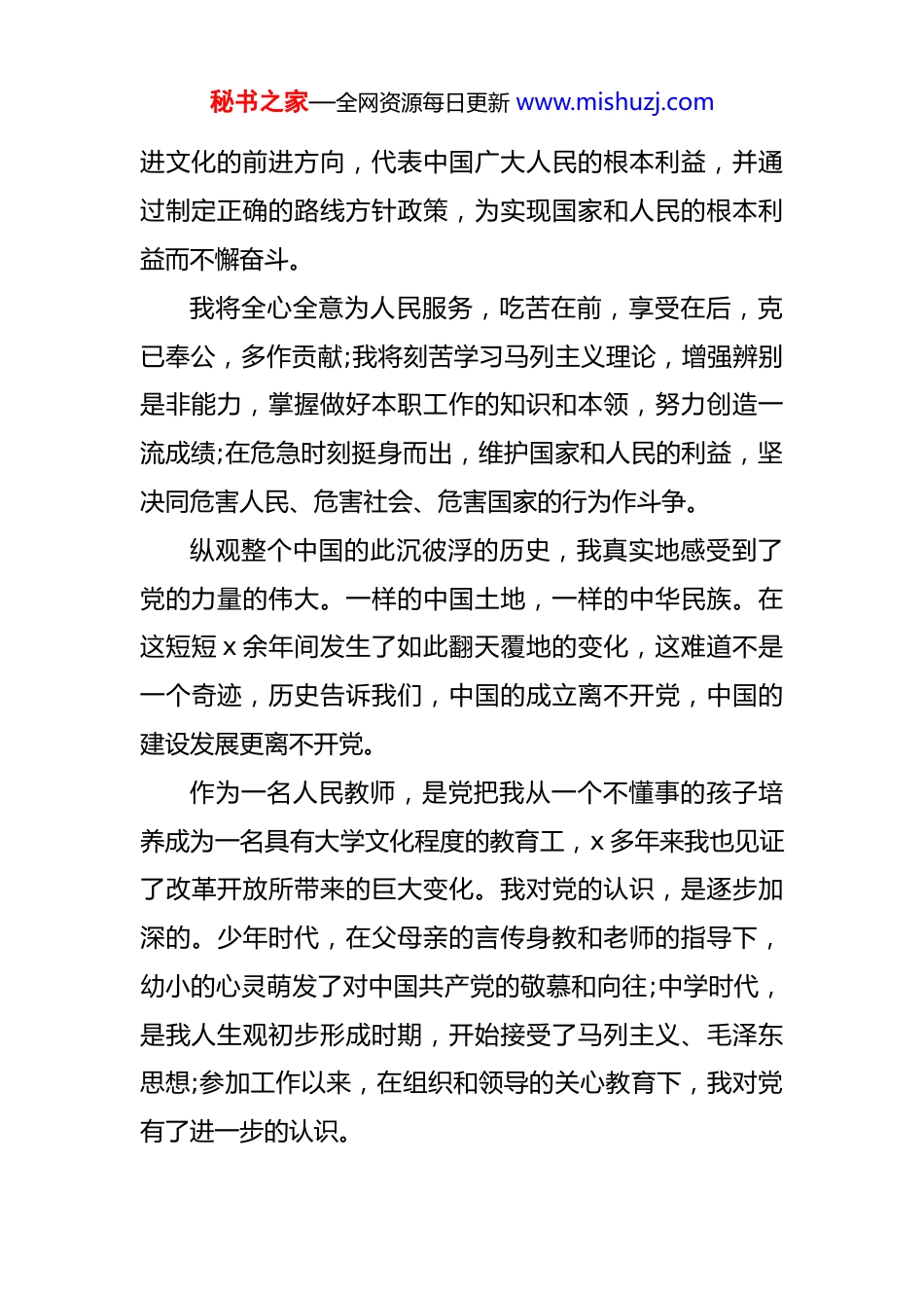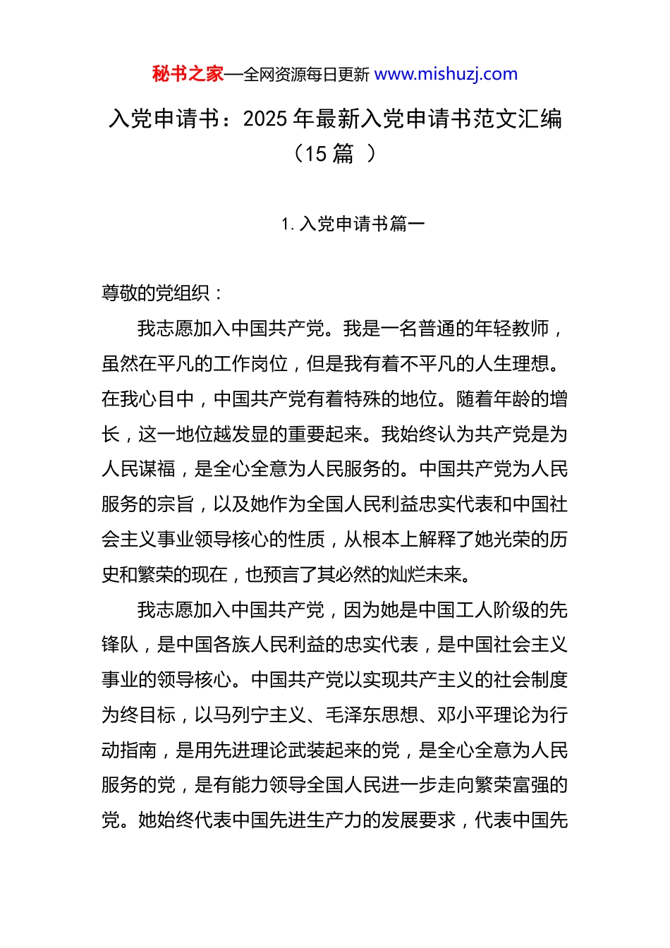 秘书之家—全网资源每日更新 www.mishuzj.com入党申请书:2025 年最新入党申请书范文汇编(15 篇 )1.入党申请书篇一尊敬的党组织:我志愿加入中国共产党。我是一名普通的年轻教师,虽然在平凡的工作岗位,但是我有着不平凡的人生理想。在我心目中,中国共产党有着特殊的地位。随着年龄的增长,这一地位越发显的重要起来。我始终认为共产党是为人民谋福,是全心全意为人民服务的。中国共产党为人民服务的宗旨,以及她作为全国人民利益忠实代表和中国社会主义事业领导核心的性质,从根本上解释了她光荣的历史和繁荣的现在,也预言了其必然的灿烂未来。我志愿加入中国共产党,因为她是中国工人阶级的先锋队,是中国各族人民利益的忠实代表,是中国社会主义事业的领导核心。中国共产党以实现共产主义的社会制度为终目标,以马列宁主义、毛泽东思想、邓小平理论为行动指南,是用先进理论武装起来的党,是全心全意为人民服务的党,是有能力领导全国人民进一步走向繁荣富强的党。她始终代表中国先进生产力的发展要求,代表中国先秘书之家—全网资源每日更新 www.mishuzj.com进文化的前进方向,代表中国广大人民的根本利益,并通过制定正确的路线方针政策,为实现国家和人民的根本利益而不懈奋斗。我将全心全意为人民服务,吃苦在前,享受在后,克已奉公,多作贡献;我将刻苦学习马列主义理论,增强辨别是非能力,掌握做好本职工作的知识和本领,努力创造一流成绩;在危急时刻挺身而出,维护国家和人民的利益,坚决同危害人民、危害社会、危害国家的行为作斗争。纵观整个中国的此沉彼浮的历史,我真实地感受到了党的力量的伟大。一样的中国土地,一样的中华民族。在这短短 x 余年间发生了如此翻天覆地的变化,这难道不是一个奇迹,历史告诉我们,中国的成立离不开党,中国的建设发展更离不开党。作为一名人民教师,是党把我从一个不懂事的孩子培养成为一名具有大学文化程度的教育工,x 多年来我也见证了改革开放所带来的巨大变化。我对党的认识,是逐步加深的。少年时代,在父母亲的言传身教和老师的指导下,幼小的心灵萌发了对中国共产党的敬慕和向往;中学时代,是我人生观初步形成时期,开始接受了马列主义、毛泽东思想;参加工作以来,在组织和领导的关心教育下,我对党有了进一步的认识。秘书之家—全网资源每日更新 www.mishuzj.com在以后的工作中我将勤勤恳恳工作,从不叫苦叫累,我从他们的身上看到了党的优良传统和作风,进一步激发了我加入党组织的决心和信心。我加入中国共产党的愿望由来已久。这种愿望不是一时冲动,而是发自内心深处的一种执着与崇高的信念。因为我从小就受到没有共产党就没有新中国的教育,现在真正领会到它的涵义,在革命战争年代无数革命先烈为了拯救国家和人民的利益甘愿抛头颅洒热血,在和平建设时期有着像焦裕禄、孔繁森等这样党的好干部,当然更有着许许多多不知道名字的人,而我发现他们以及身边许多深受我尊敬的人都有一个共同的名字——共产党员。做为一名年轻老师,我深深地知道,还有很多的路要走,递交入党志愿书仅仅是我向党组织靠拢迈出了第一步。我会朝我新的理想,新的目标,新的方向努力前进的。请党组织考验我,在我不断前行地步伐中指导我前进。请党组织在实践中考验我!此致敬礼!申请人:XXXXXXX 年 XX 月 XX 日秘书之家—全网资源每日更新 www.mishuzj.com2.入党申请书篇二敬爱的党组织:中国共产党是中国工人阶级的先锋队,是中国各族人民利益的忠实代表,是中国特色社会主义事业的领导核心。我志愿加入中国共产党,愿意为共产主义事业奋斗终身,因为我认为,成为一名中国共产党党员是一生中伟大神圣的愿望,所以我积极要求加入中国共产党。我虽然没有什么伟大的成就,但是我能清楚地明白我们的党是光荣、伟大、正确的党。有一句话我们可以经常听到:没有共产党,就没有新中国,没有中国共产党的领导,就没有社会主义革命和社会主义建设的胜利,就没有我们今天幸福美满的生活。我做为新时代饱受党的事迹熏陶的青年,坚信在中国共产党的正确领导下,共产主义一定会实现的。透过学习党的理论和历史,我衷心地热爱中国共产党...