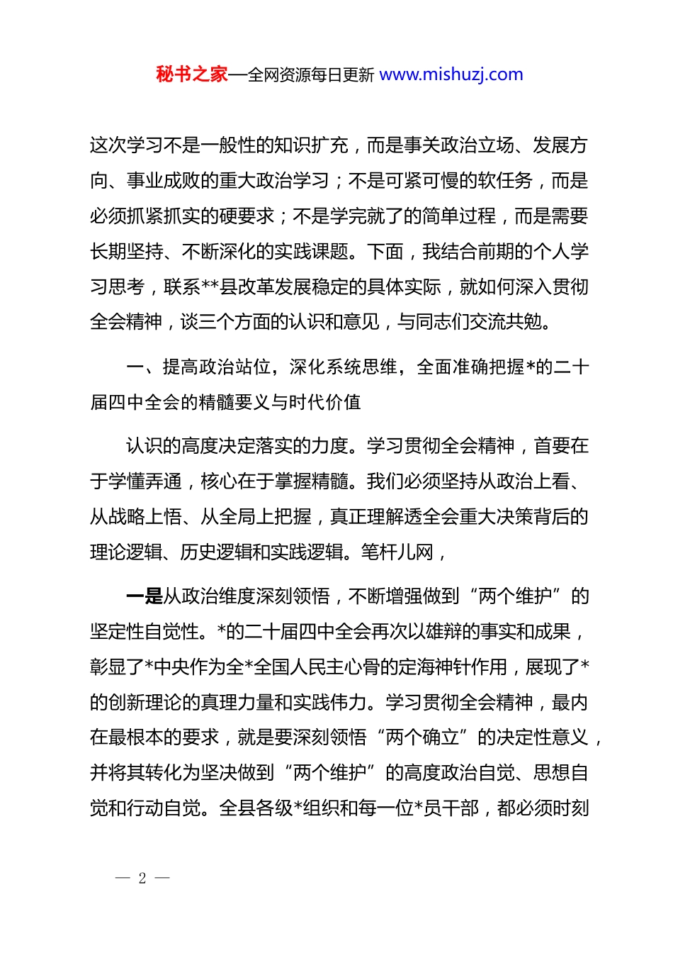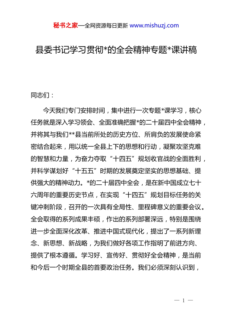 秘书之家—全网资源每日更新 www.mishuzj.com县委书记学习贯彻*的全会精神专题*课讲稿 同志们:今天我们专门安排时间,集中进行一次专题*课学习,核心任务就是深入学习领会、全面准确把握*的二十届四中全会精神,并将其与我们**县当前所处的历史方位、所肩负的发展使命紧密结合起来,用以统一全县上下的思想和行动,凝聚攻坚克难的智慧和力量,为奋力夺取“十四五”规划收官战的全面胜利,并科学谋划好“十五五”时期的发展奠定坚实的思想基础、提供强大的精神动力。*的二十届四中全会,是在新中国成立七十六周年的重要历史节点,在实现“十四五”规划目标任务的关键冲刺阶段,召开的一次具有全局性、里程碑意义的重要会议。全会取得的系列成果丰硕,作出的系列部署深远,特别是围绕进一步全面深化改革、推进中国式现代化,提出了一系列新理念、新思想、新战略,为我们做好各项工作指明了前进方向、提供了根本遵循。学习好、宣传好、贯彻好全会精神,是当前和今后一个时期全县的首要政治任务。我们必须深刻认识到,— 1 —秘书之家—全网资源每日更新 www.mishuzj.com这次学习不是一般性的知识扩充,而是事关政治立场、发展方向、事业成败的重大政治学习;不是可紧可慢的软任务,而是必须抓紧抓实的硬要求;不是学完就了的简单过程,而是需要长期坚持、不断深化的实践课题。下面,我结合前期的个人学习思考,联系**县改革发展稳定的具体实际,就如何深入贯彻全会精神,谈三个方面的认识和意见,与同志们交流共勉。一、提高政治站位,深化系统思维,全面准确把握*的二十届四中全会的精髓要义与时代价值认识的高度决定落实的力度。学习贯彻全会精神,首要在于学懂弄通,核心在于掌握精髓。我们必须坚持从政治上看、从战略上悟、从全局上把握,真正理解透全会重大决策背后的理论逻辑、历史逻辑和实践逻辑。笔杆儿网,一是从政治维度深刻领悟,不断增强做到“两个维护”的坚定性自觉性。*的二十届四中全会再次以雄辩的事实和成果,彰显了*中央作为全*全国人民主心骨的定海神针作用,展现了*的创新理论的真理力量和实践伟力。学习贯彻全会精神,最内在最根本的要求,就是要深刻领悟“两个确立”的决定性意义,并将其转化为坚决做到“两个维护”的高度政治自觉、思想自觉和行动自觉。全县各级*组织和每一位*员干部,都必须时刻— 2 —秘书之家—全网资源每日更新 www.mishuzj.com关注*中央在关心什么、强调什么,深刻领会什么是*和国家最重要的利益、什么是最需要坚定维护的立场。要自觉把**县的工作放到*和国家事业发展全局中去定位、去审视、去推进,确保执行*中央决策部署不偏向、不变通、不走样。特别是在当前复杂严峻的国内外形势下,更要保持清醒的政治头脑和强大的政治定力,在任何时候、任何情况下都做到立场坚定、旗帜鲜明,始终同*中央保持高度一致,确保**县这艘航船沿着正确政治方向破浪前行。二是从理论维度深刻领悟,自觉做*的创新理论的忠实信仰者和践行者。全会精神是*的创新理论在新时代新征程上的最新发展和集中体现,蕴含着深邃的战略思考、系统的辩证思维和科学的工作方法。我们要把学习全会精神,与学习*的一系列重要会议精神和著作紧密结合起来,做到融会贯通、一体领悟。要重点聚焦全会关于中国式现代化理论体系的创新性阐述,深刻理解其鲜明的中国特色、本质要求和必须牢牢把握的重大原则;要重点聚焦全会关于高质量发展这一全面建设社会主义现代化国家首要任务的战略部署,深刻认识其时代内涵和实践要求;要重点聚焦全会关于统筹发展和安全的重大论断,深刻把握发展与安全的辩证统一关系。学习不能停留在口头上、纸面— 3 —秘书之家—全网资源每日更新 www.mishuzj.com上,必须大力弘扬理论联系实际的学风。要紧密结合**县情,紧密联系分管领域和本职工作,带着问题学、深入思考学,努力从全会精神中寻找破解发展难题的“金钥匙”,获取推动改革创新的“思想源”,真正把学习成果转化为谋划工作的科学思路、领导发展的实际能力、改进工作的具体举措,不断提高运用*的创新理论指导实践、推动工作的水平。三是从实践维度深刻领悟,切实增强推动**县高...