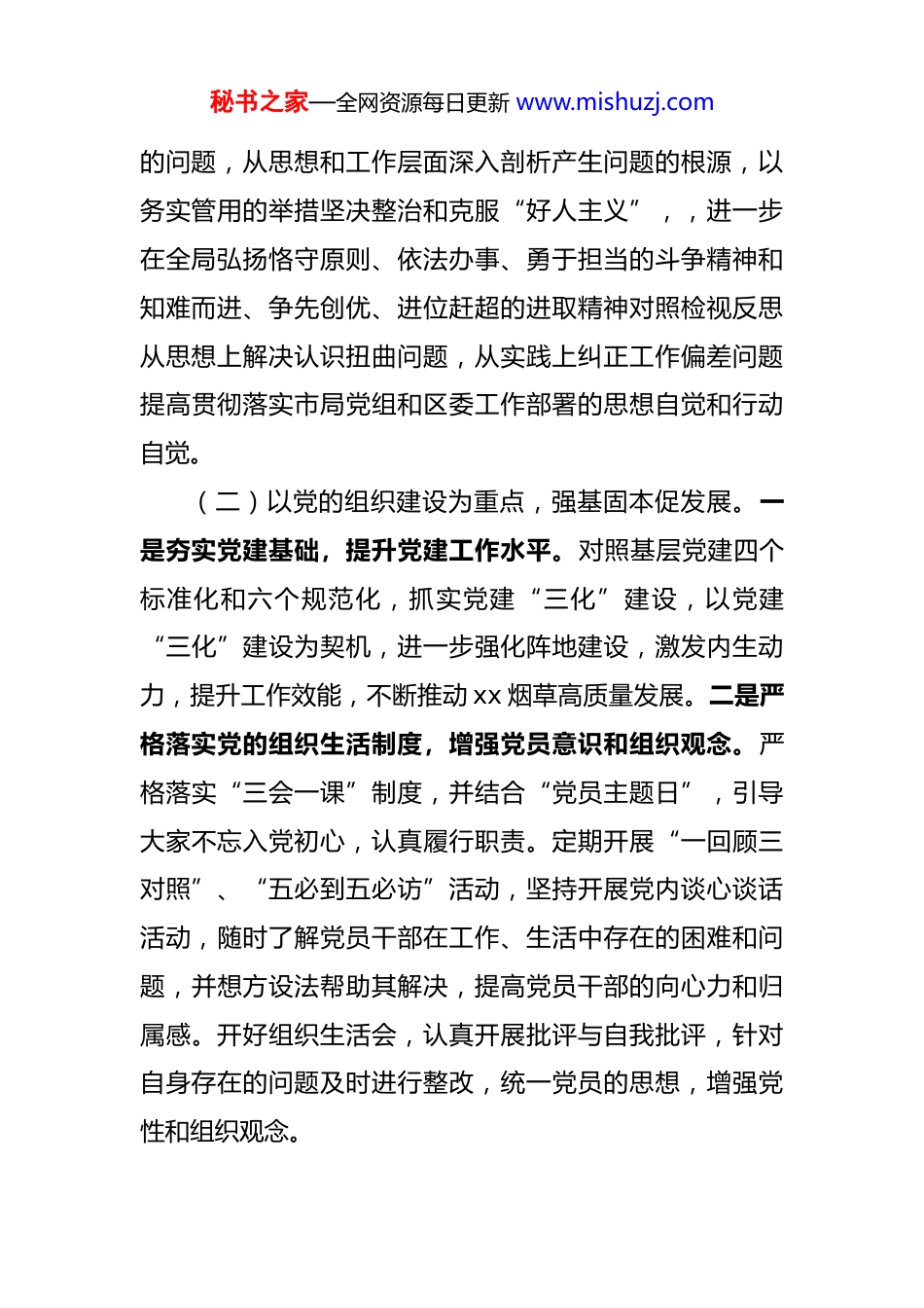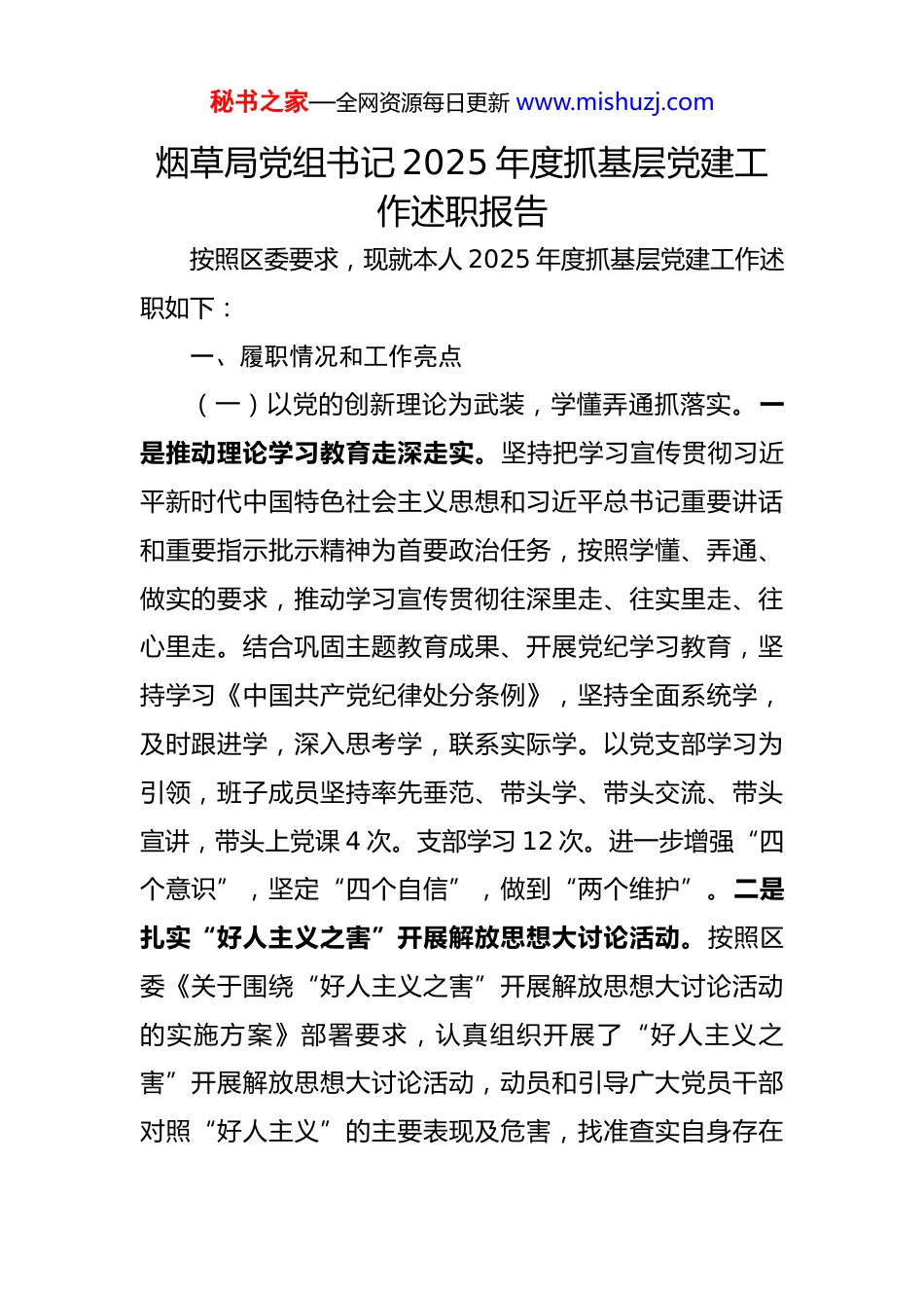 秘书之家—全网资源每日更新 www.mishuzj.com烟草局党组书记 2025 年度抓基层党建工作述职报告按照区委要求,现就本人 2025 年度抓基层党建工作述职如下:一、履职情况和工作亮点(一)以党的创新理论为武装,学懂弄通抓落实。一是推动理论学习教育走深走实。坚持把学习宣传贯彻习近平新时代中国特色社会主义思想和习近平总书记重要讲话和重要指示批示精神为首要政治任务,按照学懂、弄通、做实的要求,推动学习宣传贯彻往深里走、往实里走、往心里走。结合巩固主题教育成果、开展党纪学习教育,坚持学习《中国共产党纪律处分条例》,坚持全面系统学,及时跟进学,深入思考学,联系实际学。以党支部学习为引领,班子成员坚持率先垂范、带头学、带头交流、带头宣讲,带头上党课 4 次。支部学习 12 次。进一步增强“四个意识”,坚定“四个自信”,做到“两个维护”。二是扎实“好人主义之害”开展解放思想大讨论活动。按照区委《关于围绕“好人主义之害”开展解放思想大讨论活动的实施方案》部署要求,认真组织开展了“好人主义之害”开展解放思想大讨论活动,动员和引导广大党员干部对照“好人主义”的主要表现及危害,找准查实自身存在秘书之家—全网资源每日更新 www.mishuzj.com的问题,从思想和工作层面深入剖析产生问题的根源,以务实管用的举措坚决整治和克服“好人主义”,,进一步在全局弘扬恪守原则、依法办事、勇于担当的斗争精神和知难而进、争先创优、进位赶超的进取精神对照检视反思从思想上解决认识扭曲问题,从实践上纠正工作偏差问题提高贯彻落实市局党组和区委工作部署的思想自觉和行动自觉。(二)以党的组织建设为重点,强基固本促发展。一是夯实党建基础,提升党建工作水平。对照基层党建四个标准化和六个规范化,抓实党建“三化”建设,以党建“三化”建设为契机,进一步强化阵地建设,激发内生动力,提升工作效能,不断推动 xx 烟草高质量发展。二是严格落实党的组织生活制度,增强党员意识和组织观念。严格落实“三会一课”制度,并结合“党员主题日”,引导大家不忘入党初心,认真履行职责。定期开展“一回顾三对照”、“五必到五必访”活动,坚持开展党内谈心谈话活动,随时了解党员干部在工作、生活中存在的困难和问题,并想方设法帮助其解决,提高党员干部的向心力和归属感。开好组织生活会,认真开展批评与自我批评,针对自身存在的问题及时进行整改,统一党员的思想,增强党性和组织观念。秘书之家—全网资源每日更新 www.mishuzj.com(三)持续推进党建融入中心,不断提升党建工作活力。一是将中心工作、业务工作的“热点、难点”作为党建与业务融合点。紧紧围绕“党建+企业管理”“党建+营销服务”“党建+专卖管理”重点工作,实现党建与业务工作全方位融合,形成围绕中心抓党建、抓好党建促发展的工作格局。二是坚持服务群众宗旨。设立党员示范岗位,党员深入市场、零售终端、诚信自律小组,大力开展卷烟零售户服务、法律法规宣传等活动。支部党员协助专卖部门法律法规宣传,进一步增强了客户满意度;协助营销部门站点促销、维护明码标价,建设诚信互助小组,进一步提升了客户盈利水平。(四)加强党风廉政建设,狠抓意识形态工作。一是加强作风建设。落实中央八项规定精神、纠正“四风”,在坚持中深化、在深化中坚持。我带头执行民主集中制,执行请示报告制度,树立良好家风,管好家属和身边工作人员,严格按规章制度办事,做到踏踏实实上班,清清白白做人。紧盯“五一”、端午节等“四风”易发的重要时间节点以及“四风”问题隐形变异、改头换面等新动向、新表现,在节假日前组织开专题会议并组织全体干部专题学习违纪违规典型案件,时刻敲响廉洁警钟,推进作风建设常态化、长效化。每月开展作风建设专题学习,筑牢拒秘书之家—全网资源每日更新 www.mishuzj.com腐防变思想防线。强化党内监督,落实“两个责任”,充分运用监督执纪“第一种形态”,2024 年开展谈心谈话10 人次,通报批评 3 人次,让咬耳扯袖、红脸出汗成为常态。二是深化意识形态工作。牢牢掌握党对意识形态工作的领导权,严格落实意识形态工作责任制,落...