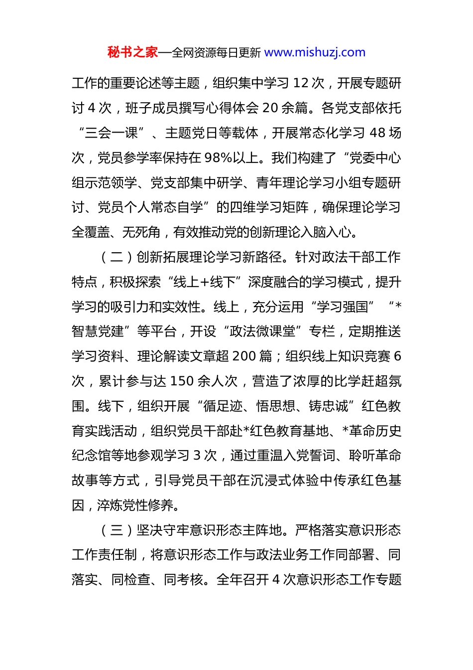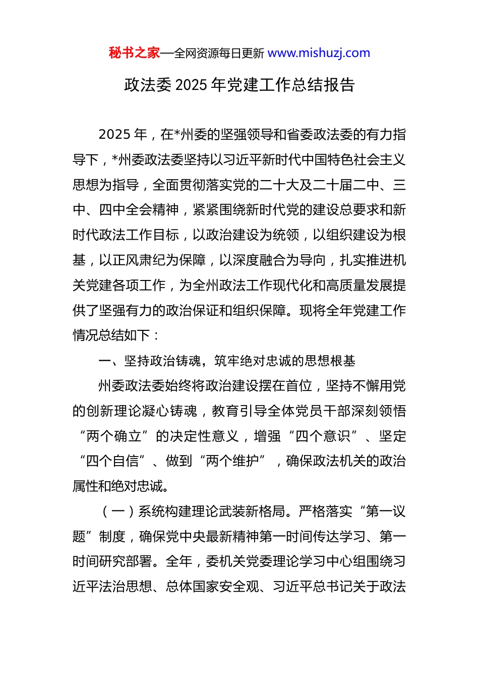 秘书之家—全网资源每日更新 www.mishuzj.com政法委 2025 年党建工作总结报告 2025 年,在*州委的坚强领导和省委政法委的有力指导下,*州委政法委坚持以习近平新时代中国特色社会主义思想为指导,全面贯彻落实党的二十大及二十届二中、三中、四中全会精神,紧紧围绕新时代党的建设总要求和新时代政法工作目标,以政治建设为统领,以组织建设为根基,以正风肃纪为保障,以深度融合为导向,扎实推进机关党建各项工作,为全州政法工作现代化和高质量发展提供了坚强有力的政治保证和组织保障。现将全年党建工作情况总结如下:一、坚持政治铸魂,筑牢绝对忠诚的思想根基州委政法委始终将政治建设摆在首位,坚持不懈用党的创新理论凝心铸魂,教育引导全体党员干部深刻领悟“两个确立”的决定性意义,增强“四个意识”、坚定“四个自信”、做到“两个维护”,确保政法机关的政治属性和绝对忠诚。(一)系统构建理论武装新格局。严格落实“第一议题”制度,确保党中央最新精神第一时间传达学习、第一时间研究部署。全年,委机关党委理论学习中心组围绕习近平法治思想、总体国家安全观、习近平总书记关于政法秘书之家—全网资源每日更新 www.mishuzj.com工作的重要论述等主题,组织集中学习 12 次,开展专题研讨 4 次,班子成员撰写心得体会 20 余篇。各党支部依托“三会一课”、主题党日等载体,开展常态化学习 48 场次,党员参学率保持在 98%以上。我们构建了“党委中心组示范领学、党支部集中研学、青年理论学习小组专题研讨、党员个人常态自学”的四维学习矩阵,确保理论学习全覆盖、无死角,有效推动党的创新理论入脑入心。(二)创新拓展理论学习新路径。针对政法干部工作特点,积极探索“线上+线下”深度融合的学习模式,提升学习的吸引力和实效性。线上,充分运用“学习强国”“*智慧党建”等平台,开设“政法微课堂”专栏,定期推送学习资料、理论解读文章超 200 篇;组织线上知识竞赛 6次,累计参与达 150 余人次,营造了浓厚的比学赶超氛围。线下,组织开展“循足迹、悟思想、铸忠诚”红色教育实践活动,组织党员干部赴*红色教育基地、*革命历史纪念馆等地参观学习 3 次,通过重温入党誓词、聆听革命故事等方式,引导党员干部在沉浸式体验中传承红色基因,淬炼党性修养。(三)坚决守牢意识形态主阵地。严格落实意识形态工作责任制,将意识形态工作与政法业务工作同部署、同落实、同检查、同考核。全年召开 4 次意识形态工作专题秘书之家—全网资源每日更新 www.mishuzj.com分析研判会,精准排查风险点,制定应对预案,确保阵地安全。加强对委机关官方网站、微信公众号等宣传平台的管理,全年发布正面宣传稿件 80 余篇,积极宣传政法英模事迹,讲好新时代政法故事。同时,组织开展 2 次意识形态专题培训,邀请高校专家就当前意识形态领域的新形势、新挑战进行授课,有效提升了全体党员干部政治敏锐性和鉴别力,牢牢掌握了意识形态工作的领导权和话语权。二、夯实组织基础,锻造坚强有力的战斗堡垒州委政法委坚持大抓基层的鲜明导向,以提升组织力为重点,以党支部标准化规范化建设为抓手,推动基层党组织全面进步、全面过硬,使每个支部都成为党旗高高飘扬的战斗堡垒。(一)深入推进党支部标准化规范化建设。按照“四强”党支部创建要求,深入开展“党支部建设质量提升年”活动。对照《中国共产党支部工作条例(试行)》,制定标准化建设清单,对机关 5 个党支部进行全面“体检”,逐项对标找差、补齐短板。根据工作需要,优化调整支部设置,将退休党员干部单独成立 1 个党支部,并新建 2 个功能性党支部,确保党组织有效覆盖。同时,加大对党务干部的培养力度,举办党支部书记、党务工作者专秘书之家—全网资源每日更新 www.mishuzj.com题培训班 3 期,培训 80 余人次,有效提升了党务工作队伍的专业素养和履职能力。截至 2025 年底,机关 85%的党支部达到标准化建设示范标准,其中 2 个党支部被州直机关工委评为“先进基层党组织”。(二)严肃规范党内政治生活。严格执行《关于新形势下党内政治生活的若干准则》,高质量落实“...